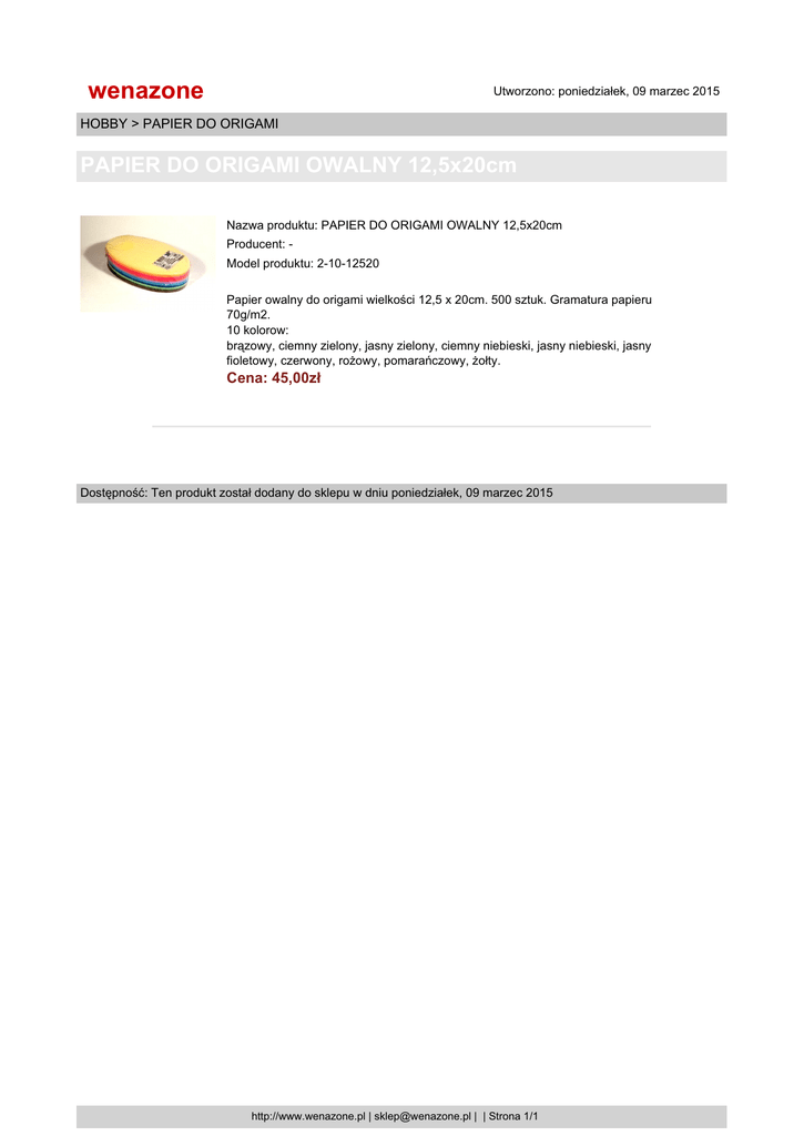 wenazone Utworzono: poniedziałek, 09 marzec 2015 HOBBY > PAPIER DO ORIGAMI PAPIER DO ORIGAMI OWALNY 12,5x20cm Nazwa produktu: PAPIER DO ORIGAMI OWALNY 12,5x20cm Producent: Model produktu: 2-10-12520 Papier owalny do origami wielkości 12,5 x 20cm. 500 sztuk. Gramatura papieru 70g/m2. 10 kolorow: brązowy, ciemny zielony, jasny zielony, ciemny niebieski, jasny niebieski, jasny fioletowy, czerwony, rożowy, pomarańczowy, żołty. Cena: 45,00zł Dostępność: Ten produkt został dodany do sklepu w dniu poniedziałek, 09 marzec 2015 http://www.wenazone.pl | [email protected] | | Strona 1/1