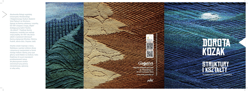 Artystka czerpie inspiracje z natury. Wydobywa z pamięci widziane obrazy i przywraca je rzeczywistości w formie nowego medium: tkaniny, przy czym główny nacisk kładzie na strukturę i kolor. Krajobrazy nie są już zwyczajnymi przedstawieniami natury, ale płaszczyznami struktur utworzonych przy pomocy różnokolorowej, splecionej ze sobą wełny. Polub nas na facebooku! MIEJSKI OŚRODEK KULTURY Al. Piłsudskiego 27 44-335 Jastrzębie Zdrój www.mok.jastrzebie.pl Folder wydany ze środków budżetowych Miejskiego Ośrodka Kultury Absolwentka filologii angielskiej Uniwersytetu Wrocławskiego i Podyplomowego Studium Akademii Sztuk Pięknych we Wrocławiu. Zajmuje się tkaniną unikatową i ceramiką. Od 1997 związana z Grupą „Wątek” działającą przy Galerii Tkackiej „Na Jatkach”. Projektuje tkaninę artystyczną i ceramikę oraz realizuje swoje projekty. Od 1997 roku bierze udział w wystawach zbiorowych tkaniny artystycznej (Wrocław, Oleśnica, Prudnik, Jelenia Góra, Chojnów, Łódź). DorotA Kozak Struktury i kształty TKANINA ARTYSTYCZNA I CERAMIKA DorotA Kozak DorotA Kozak Struktury i kształty Textures and Shapes TKANINA ARTYSTYCZNA I CERAMIKA ARTISTIC TEXTILES AND CERAMICS Mieszka i tworzy we Wrocławiu. Zajmuje się tkaniną i ceramiką. Tkając, nie stara się przedstawić rzeczywistości taką jaka jest, ale traktuje ją jako pretekst do szukania struktur i zabawy kolorami. Tworzy mięsiste prace o wyraźnej fakturze powstałe z kilku splecionych ze sobą włókien wełny. Punktem wyjścia dla ceramiki są organiczne formy istniejące w naturze, które zaklęte w glinie przybierają inny kształt. She lives and creates in Wrocław, Poland. Her domain is artistic textile and ceramics. Weaving, she does not attempt to present reality as it is but treats it as a pretext to search for textures and play with colour. Her fleshy artworks are called into existence by means of several intertwined wool fibres. Organic forms existing in nature are a starting point for her ceramics. Yet, being bewitched by an artist, they take a different shape in clay. BUTLE Prezentowane formy ceramiczne powstały także z inspiracji naturą. Z łatwością można rozpoznać w nich znane formy roślinne, które tutaj zostały zaklęte w glinę i pokryte szkliwem. MUSZLE PUNKT ŚWIETLNY