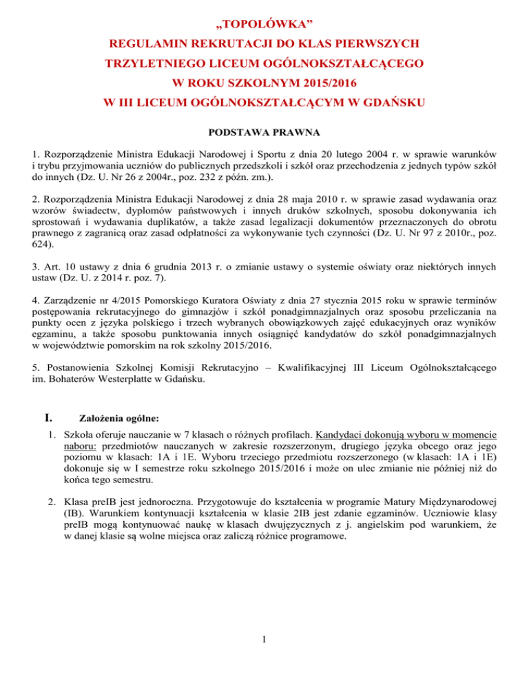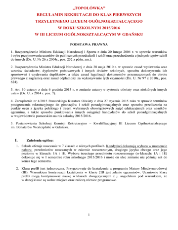 „TOPOLÓWKA” REGULAMIN REKRUTACJI DO KLAS PIERWSZYCH TRZYLETNIEGO LICEUM OGÓLNOKSZTAŁCĄCEGO W ROKU SZKOLNYM 2015/2016 W III LICEUM OGÓLNOKSZTAŁCĄCYM W GDAŃSKU PODSTAWA PRAWNA 1. Rozporządzenie Ministra Edukacji Narodowej i Sportu z dnia 20 lutego 2004 r. w sprawie warunków i trybu przyjmowania uczniów do publicznych przedszkoli i szkół oraz przechodzenia z jednych typów szkół do innych (Dz. U. Nr 26 z 2004r., poz. 232 z późn. zm.). 2. Rozporządzenia Ministra Edukacji Narodowej z dnia 28 maja 2010 r. w sprawie zasad wydawania oraz wzorów świadectw, dyplomów państwowych i innych druków szkolnych, sposobu dokonywania ich sprostowań i wydawania duplikatów, a także zasad legalizacji dokumentów przeznaczonych do obrotu prawnego z zagranicą oraz zasad odpłatności za wykonywanie tych czynności (Dz. U. Nr 97 z 2010r., poz. 624). 3. Art. 10 ustawy z dnia 6 grudnia 2013 r. o zmianie ustawy o systemie oświaty oraz niektórych innych ustaw (Dz. U. z 2014 r. poz. 7). 4. Zarządzenie nr 4/2015 Pomorskiego Kuratora Oświaty z dnia 27 stycznia 2015 roku w sprawie terminów postępowania rekrutacyjnego do gimnazjów i szkół ponadgimnazjalnych oraz sposobu przeliczania na punkty ocen z języka polskiego i trzech wybranych obowiązkowych zajęć edukacyjnych oraz wyników egzaminu, a także sposobu punktowania innych osiągnięć kandydatów do szkół ponadgimnazjalnych w województwie pomorskim na rok szkolny 2015/2016. 5. Postanowienia Szkolnej Komisji Rekrutacyjno – Kwalifikacyjnej III Liceum Ogólnokształcącego im. Bohaterów Westerplatte w Gdańsku. I. Założenia ogólne: 1. Szkoła oferuje nauczanie w 7 klasach o różnych profilach. Kandydaci dokonują wyboru w momencie naboru: przedmiotów nauczanych w zakresie rozszerzonym, drugiego języka obcego oraz jego poziomu w klasach: 1A i 1E. Wyboru trzeciego przedmiotu rozszerzonego (w klasach: 1A i 1E) dokonuje się w I semestrze roku szkolnego 2015/2016 i może on ulec zmianie nie później niż do końca tego semestru. 2. Klasa preIB jest jednoroczna. Przygotowuje do kształcenia w programie Matury Międzynarodowej (IB). Warunkiem kontynuacji kształcenia w klasie 2IB jest zdanie egzaminów. Uczniowie klasy preIB mogą kontynuować naukę w klasach dwujęzycznych z j. angielskim pod warunkiem, że w danej klasie są wolne miejsca oraz zaliczą różnice programowe. 1 II. W roku szkolnym 2015/2016 proponujemy następujące klasy: KLASA „A” – DWUJĘZYCZNA Z J. ANGIELSKIM, ekonomiczna Przedmioty z rozszerzonym programem nauczania: • MATEMATYKA (19h w cyklu trzyletnim) • J. HISZPAŃSKI lub J. NIEMIECKI (początkujący lub kontynuacja)* • Przedmioty rozszerzone do wyboru: WOS lub FIZYKA lub BIOLOGIA lub GEOGRAFIA. • Nauczane języki: angielski (18h w cyklu trzyletnim), hiszpański lub niemiecki (13h w cyklu trzyletnim). • Przedmioty nauczane dwujęzycznie: min. dwa w każdym roku nauki, w zależności od wyborów ucznia i możliwości organizacyjnych szkoły KLASA „B” – DWUJĘZYCZNA Z J. ANGIELSKIM , biologiczno - chemiczna Przedmioty z rozszerzonym programem nauczania: • BIOLOGIA (13h w cyklu trzyletnim) • CHEMIA (12h w cyklu trzyletnim) • Nauczane języki: angielski (18h w cyklu trzyletnim) i niemiecki (6h w cyklu trzyletnim). • Dodatkowe godziny z matematyki (13h w cyklu trzyletnim). • Przedmioty nauczane dwujęzycznie: biologia, chemia. KLASA „C” – HUMANISTYCZNO - PRAWNA Przedmioty z rozszerzonym programem nauczania: • • • • J. POLSKI (21h w cyklu trzyletnim) HISTORIA (12h w cyklu trzyletnim) WOS ( 7h w cyklu trzyletnim) Nauczane języki: angielski (9h w cyklu trzyletnim) i francuski (6h w cyklu trzyletnim). • Przedmiot uzupełniający: podstawy prawa. KLASA „D” – MATEMATYCZNO - FIZYCZNA Przedmioty z rozszerzonym programem nauczania: • MATEMATYKA (22h w cyklu trzyletnim) • FIZYKA (12h w cyklu trzyletnim) • Nauczane języki: angielski (10h w cyklu trzyletnim) i niemiecki lub hiszpański (6h w cyklu trzyletnim). • Przedmiot uzupełniający: zaawansowana grafika i multimedia (grafika 2D i 3D; obróbka multimediów; projektowanie zaawansowanych stron www). 2 KLASA „E" - DWUJĘZYCZNA Z J. ANGIELSKIM, lingwistyczna Przedmioty z rozszerzonym programem nauczania: • J. POLSKI (21h w cyklu trzyletnim) • J. HISZPAŃSKI lub J. NIEMIECKI (początkujący lub kontynuacja)* • Przedmioty rozszerzone do wyboru: WOS lub HISTORIA lub BIOLOGIA lub GEOGRAFIA. • Nauczane języki: angielski (18h w cyklu trzyletnim), hiszpański lub niemiecki (13h w cyklu trzyletnim). • Przedmioty nauczane dwujęzycznie: min. dwa w każdym roku nauki, w zależności od wyborów ucznia i możliwości organizacyjnych szkoły KLASA „IH” – DWUJĘZYCZNA Z JĘZYKIEM HISZPAŃSKIM Przygotowująca do matury polskiej i hiszpańskiej (kontynuacja po klasie wstępnej „0H”). • Możliwość przyjęcia kandydatów pod następującymi warunkami: • a) zdanie egzaminu z języka hiszpańskiego • b) wolne miejsca przedmioty z rozszerzonym programem nauczania: • • • • • • • GEOGRAFIA (9h w cyklu trzyletnim) J. ANGIELSKI (15h w cyklu trzyletnim) Obowiązkowe przedmioty uzupełniające: LITERATURA HISZPAŃSKA HISTORIA Z ELEMENTAMI HISTORII SZTUKI KRÓLESTWA HISZPANII GEOGRAFIA KRÓLESTWA HISZPANII nauczane języki: hiszpański (19h w cyklu trzyletnim) i angielski (15h w cyklu trzyletnim) KLASA „preIB” - DWUJĘZYCZNA Z J. ANGIELSKIM, przygotowująca do programu dyplomowego matury międzynarodowej • Tylko dla uczniów, którzy od II klasy chcą uczestniczyć w programie dyplomowym matury międzynarodowej. Dodatkowe opłaty. • Przedmioty nauczane dwujęzycznie: • MATEMATYKA • BIOLOGIA • FIZYKA • GEOGRAFIA • HISTORIA • CHEMIA • dodatkowe przedmioty: THEORY OF KNOWLEDGE ( metodologia badań naukowych - nauczana w języku angielskim) i CAS (Creativity Action Service) • Nauczane języki: angielski (6h w tygodniu) i niemiecki (2h w tygodniu) * początkują