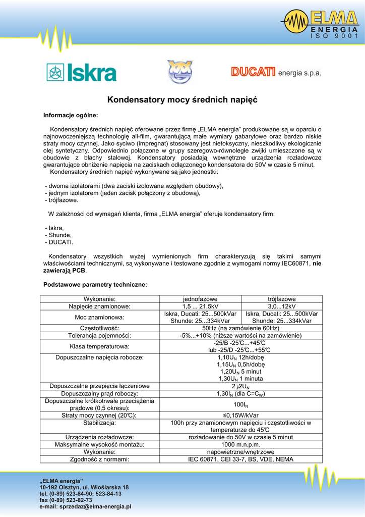 Kondensatory mocy średnich napięć Informacje ogólne: Kondensatory średnich napięć oferowane przez firmę „ELMA energia” produkowane są w oparciu o najnowoczeniejszą technologię all-film, gwarantującą małe wymiary gabarytowe oraz bardzo niskie straty mocy czynnej. Jako syciwo (impregnat) stosowany jest nietoksyczny, nieszkodliwy ekologicznie olej syntetyczny. Odpowiednio połączone w grupy szeregowo-równoległe zwijki umieszczone są w obudowie z blachy stalowej. Kondensatory posiadają wewnętrzne urządzenia rozładowcze gwarantujące obniżenie napięcia na zaciskach odłączonego kondensatora do 50V w czasie 5 minut. Kondensatory średnich napięć wykonywane są jako jednostki: - dwoma izolatorami (dwa zaciski izolowane względem obudowy), - jednym izolatorem (jeden zacisk połączony z obudową), - trójfazowe. W zależności od wymagań klienta, firma „ELMA energia” oferuje kondensatory firm: - Iskra, - Shunde, - DUCATI. Kondensatory wszystkich wyżej wymienionych firm charakteryzują się takimi samymi właściwościami technicznymi, są wykonywane i testowane zgodnie z wymogami normy IEC60871, nie zawierają PCB. Podstawowe parametry techniczne: Wykonanie: Napięcie znamionowe: Moc znamionowa: Częstotliwość: Tolerancja pojemności: Klasa temperaturowa: Dopuszczalne napięcia robocze: Dopuszczalne przepięcia łączeniowe Dopuszczalny prąd roboczy: Dopuszczalne krótkotrwałe przeciążenia prądowe (0,5 okresu): Straty mocy czynnej (20°C): Stabilizacja: Urządzenia rozładowcze: Maksymalne wysokość montażu: Wykonanie: Zgodność z normami: jednofazowe trójfazowe 1,5 ... 21,5kV 3,0...12kV Iskra, Ducati: 25...500kVar Iskra, Ducati: 25...500kVar Shunde: 25...334kVar Shunde: 25...334kVar 50Hz (na zamówienie 60Hz) -5%...+10% (niższe wartości na zamówienie) -25/B -25°C...+45°C lub -25/D -25°C...+55°C 1,10UN 12h/dobę 1,15UN 0,5h/dobę 1,20UN 5 minut 1,30UN 1 minuta 2√2UN 1,30IN (dla C=CW ) 100IN ≤0,15W/kVar 100h przy znamionowym napięciu i częstotliwości w temperaturze do 45°C rozładowanie do 50V w czasie 5 minut 1000 m.n.p.m. napowietrzne/wnętrzowe IEC 60871, CEI 33-7, BS, VDE, NEMA Charakterystyki temperaturowe Zmiany pojemności kondensatora w funkcji temperatury. Zależność strat mocy czynnej od temperatury