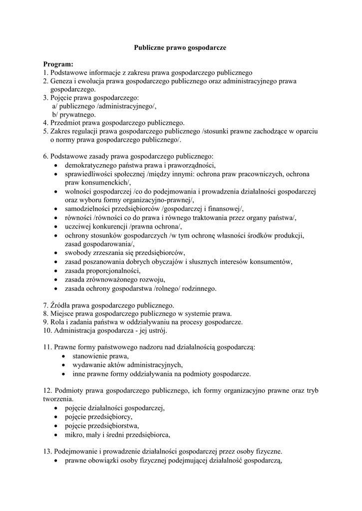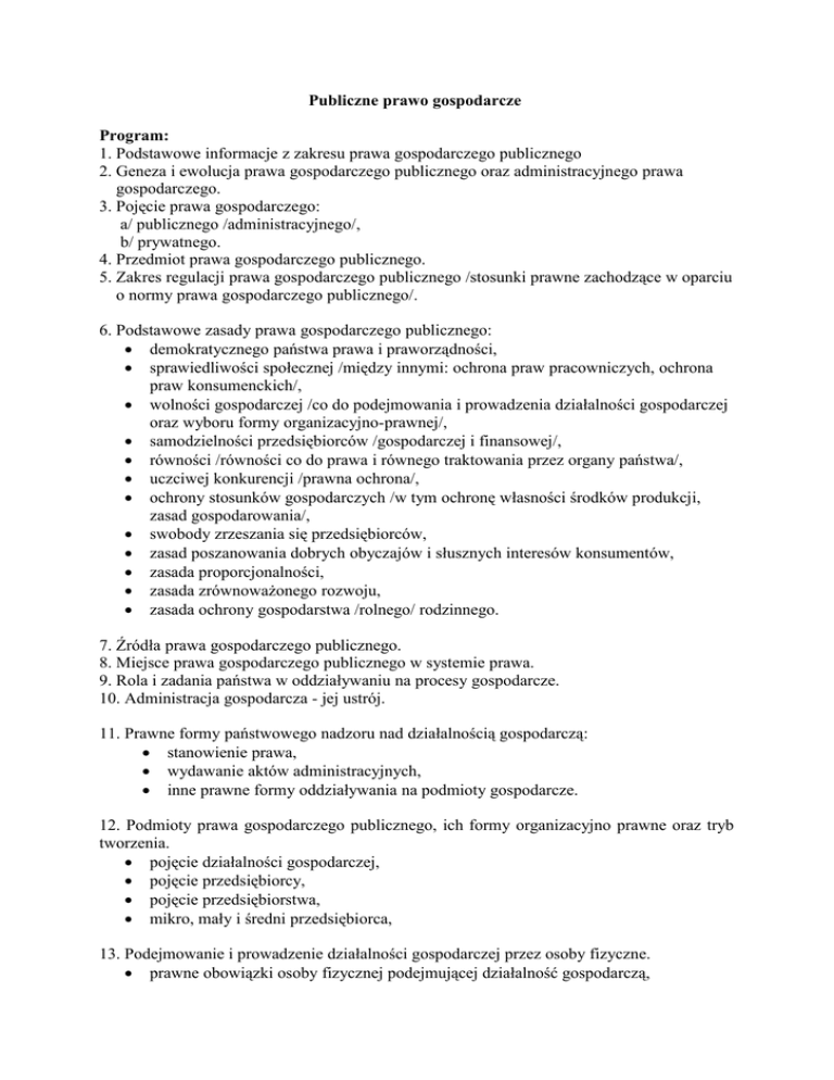 Publiczne prawo gospodarcze Program: 1. Podstawowe informacje z zakresu prawa gospodarczego publicznego 2. Geneza i ewolucja prawa gospodarczego publicznego oraz administracyjnego prawa gospodarczego. 3. Pojęcie prawa gospodarczego: a/ publicznego /administracyjnego/, b/ prywatnego. 4. Przedmiot prawa gospodarczego publicznego. 5. Zakres regulacji prawa gospodarczego publicznego /stosunki prawne zachodzące w oparciu o normy prawa gospodarczego publicznego/. 6. Podstawowe zasady prawa gospodarczego publicznego: • demokratycznego państwa prawa i praworządności, • sprawiedliwości społecznej /między innymi: ochrona praw pracowniczych, ochrona praw konsumenckich/, • wolności gospodarczej /co do podejmowania i prowadzenia działalności gospodarczej oraz wyboru formy organizacyjno-prawnej/, • samodzielności przedsiębiorców /gospodarczej i finansowej/, • równości /równości co do prawa i równego traktowania przez organy państwa/, • uczciwej konkurencji /prawna ochrona/, • ochrony stosunków gospodarczych /w tym ochronę własności środków produkcji, zasad gospodarowania/, • swobody zrzeszania się przedsiębiorców, • zasad poszanowania dobrych obyczajów i słusznych interesów konsumentów, • zasada proporcjonalności, • zasada zrównowaŜonego rozwoju, • zasada ochrony gospodarstwa /rolnego/ rodzinnego. 7. Źródła prawa gospodarczego publicznego. 8. Miejsce prawa gospodarczego publicznego w systemie prawa. 9. Rola i zadania państwa w oddziaływaniu na procesy gospodarcze. 10. Administracja gospodarcza - jej ustrój. 11. Prawne formy państwowego nadzoru nad działalnością gospodarczą: • stanowienie prawa, • wydawanie aktów administracyjnych, • inne prawne formy oddziaływania na podmioty gospodarcze. 12. Podmioty prawa gospodarczego publicznego, ich formy organizacyjno prawne oraz tryb tworzenia. • pojęcie działalności gospodarczej, • pojęcie przedsiębiorcy, • pojęcie przedsiębiorstwa, • mikro, mały i średni przedsiębiorca, 13. Podejmowanie i prowadzenie działalności gospodarczej przez osoby fizyczne. • prawne obowiązki osoby fizycznej podejmującej działalność gospodarczą, • • • ewidencja działalności gospodarczej, punkt kontaktowy, Centralna Ewidencja Działalności Gospodarczej działalności gospodarczej. 14. Przedsiębiorstwa państwowe. • ewolucja sytuacji prawnej przedsiębiorstw państwowych w Polsce, • pojęcie przedsiębiorstwa państwowego, • klasyfikacja, tworzenie, łączenie, podział i likwidacja przedsiębiorstw, • organy przedsiębiorstwa, nadzór nad przedsiębiorstwem, • umowa o zarządzanie przedsiębiorstwem, postępowanie naprawcze. 15. Samorząd załogi przedsiębiorstwa państwowego. • ewolucja udziału załogi w zarządzaniu przedsiębiorstwem państwowym, • organy samorządu załogi, • samorząd załogi a dyrektor przedsiębiorstwa. 16. Przekształcenia własnościowe przedsiębiorstw państwowych. • prawne podstawy przekształceń własnościowych przedsiębiorstw, • tryby przekształceń własnościowych przedsiębiorstw, a) prywatyzacja pośrednia, b) prywatyzacja bezpośrednia, c) uprawnienia pracowników w procesie prywatyzacji. • organy uczestniczące w tym postępowaniu i uprawnienia, z tym związane, organów przedsiębiorstwa oraz organu załoŜycielskiego, • analizy „przedprywatyzacyjne”. 17. Przedsiębiorstwa państwowe o szczególnym statusie prawnym. 18. Działalność gospodarcza samorządu terytorialnego. • przedsiębiorstwa komunalne, • przekształcenia organizacyjno prawne przedsiębiorstw komunalnych, • prawne formy realizacji gospodarki komunalnej. 19. Ewolucja gospodarczej. prawnych form administracyjnoprawnej reglamentacji 20. Reglamentacja działalności gospodarczej przez państwo. • administracyjny nadzór nad działalnością jednostek gospodarczych, • ewolucja reglamentacyjnej działalności państwa, • zakres i formy reglamentacji działalności gospodarczej • pojęcie i normatywne podstawy: a) koncesja, b) zezwolenia, licencje, c) działalność regulowana, d) działalność wolna od reglamentacji. działalności 21. Zrzeszanie się jednostek gospodarczych, samorząd gospodarczy i zawodowy. • izby gospodarcze, • izby rolnicze, • samorząd rzemiosła, • zrzeszenia prywatnego handlu i usług, • samorząd zawodowy. 22. Działalność gospodarcza prowadzona z udziałem kapitału zagranicznego. • osoba zagraniczna, • przedsiębiorca zagraniczny, • oddział przedsiębiorcy zagranicznego, • przedstawicielstwo przedsiębiorcy zagranicznego. 23. Inne podmioty prowadzące działalność gospodarczą • fundacje, • stowarzyszenia. 24. Ochrona konkurencji i konsumentów. 25. Pomoc publiczna udzielana przedsiębiorcom. 26. Zamówienia publiczne: • zakres regulacji, • podstawowe pojęcia, a) pojęcie zamówienia publicznego, b) pojęcie najkorzystniejszej oferty, c) zamawiający, d) wykonawca, • zasady udzielania zamówień publicznych, a) zasada uczciwej konkurencji, b) zasada równość, c) zasada bezstronności i obiektywizmu, d) zasada jawności, e) zasad pisemności, f) zasada stosowania języka polskiego, g) zasada udzielania zamówienia wyłącznie wykonawcy wybranemu zgodnie z ustawą, h) zasad stosowania wyłącznie trybów określonych ustawą, • tryby udzielania zamówień publicznych, a) tryby podstawowe: - przetarg nieograniczony, - przetarg ograniczony, b) tryby pozostałe: - negocjacje z ogłoszeniem, - dialog konkurencyjny, - negocjacje bez ogłoszenia, - zamówienia z wolnej ręki, - zapytanie o cenę, • • • • - licytacja elektroniczna. postępowanie o udzielenie zamówienia publicznego: a) czynności przygotowawcze, b) procedura udzielania zamówienia publicznego, c) realizacja umowy. środki ochrony prawnej, kontrola udzielania zamówień, organy właściwe w sprawach uregulowanych w ustawie: a) Prezes Urzędu Zamówień Publicznych, b) Rada Zamówień Publicznych, 
