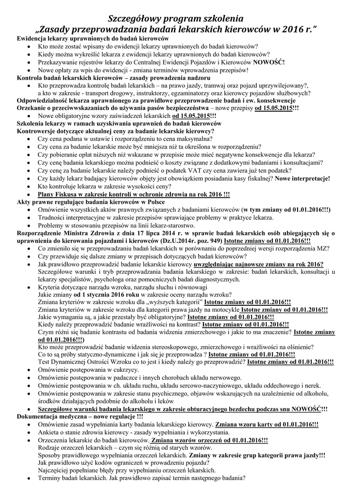 Szczegółowy program szkolenia „Zasady przeprowadzania badań lekarskich kierowców w 2016 r.” Ewidencja lekarzy uprawnionych do badań kierowców Kto może zostać wpisany do ewidencji lekarzy uprawnionych do badań kierowców? Kiedy można wykreślić lekarza z ewidencji lekarzy uprawnionych do badań kierowców? Przekazywanie rejestrów lekarzy do Centralnej Ewidencji Pojazdów i Kierowców NOWOŚĆ! Nowe opłaty za wpis do ewidencji - zmiana terminów wprowadzenia przepisów! Kontrola badań lekarskich kierowców – zasady prowadzenia nadzoru Kto przeprowadza kontrolę badań lekarskich – na prawo jazdy, tramwaj oraz pojazd uprzywilejowany?, a kto w zakresie - transport drogowy, instruktorzy, egzaminatorzy oraz kierowcy pojazdów służbowych? Odpowiedzialność lekarza uprawnionego za prawidłowe przeprowadzenie badań i ew. konsekwencje Orzekanie o przeciwwskazaniach do używania pasów bezpieczeństwa – nowe przepisy od 15.05.2015!!! Nowe obligatoryjne wzory zaświadczeń lekarskich od 15.05.2015!!! Szkolenia lekarzy w ramach uzyskiwania uprawnień do badań kierowców Kontrowersje dotyczące aktualnej ceny za badanie lekarskie kierowcy? Czy cena podana w ustawie i rozporządzeniu to cena maksymalna? Czy cena za badanie lekarskie może być mniejsza niż ta określona w rozporządzeniu? Czy pobieranie opłat niższych niż wskazane w przepisie może mieć negatywne konsekwencje dla lekarza? Czy cenę badania lekarskiego można podnieść o koszty związane z dodatkowymi badaniami i konsultacjami? Czy cenę za badanie lekarskie należy podnieść o podatek VAT czy cena zawiera już ten podatek? Czy każdy lekarz badający kierowców objęty jest obowiązkiem posiadania kasy fiskalnej? Nowe interpretacje! Kto kontroluje lekarza w zakresie wysokości ceny? Plany Fiskusa w zakresie kontroli w ochronie zdrowia na rok 2016 !!! Akty prawne regulujące badania kierowców w Polsce Omówienie wszystkich aktów prawnych związanych z badaniami kierowców (w tym zmiany od 01.01.2016!!!) Trudności interpretacyjne w zakresie przepisów sprawiające problemy w praktyce lekarza. Problemy w stosowaniu przepisów na linii lekarz-starostwo. Rozporządzenie Ministra Zdrowia z dnia 17 lipca 2014 r. w sprawie badań lekarskich osób ubiegających się o uprawnienia do kierowania pojazdami i kierowców (Dz.U.2014r. poz. 949) Istotne zmiany od 01.01.2016!!! Co zmieniło się w przeprowadzaniu badań lekarskich w porównaniu do poprzedniej wersji rozporządzenia MZ? Czy przewiduje się dalsze zmiany w przepisach dotyczących badań kierowców? Jak prawidłowo przeprowadzić badanie lekarskie kierowcy uwzględniając najnowsze zmiany na rok 2016? Szczegółowe warunki i tryb przeprowadzania badania lekarskiego w zakresie: badań lekarskich, konsultacji u lekarzy specjalistów, psychologa oraz pomocniczych badań diagnostycznych. Kryteria dotyczące narządu wzroku, narządu słuchu i równowagi Jakie zmiany od 1 stycznia 2016 roku w zakresie oceny narządu wzroku? Zmiana kryteriów w zakresie wzroku dla „wyższych kategorii” Istotne zmiany od 01.01.2016!!! Zmiana kryteriów w zakresie wzroku dla kategorii prawa jazdy na motocykle Istotne zmiany od 01.01.2016!!! Jakie wymagania są, a jakie przestały być obligatoryjne? Istotne zmiany od 01.01.2016!!! Kiedy należy przeprowadzić badanie wrażliwości na kontrast? Istotne zmiany od 01.01.2016!!! Czym różni się badanie kontrastu od badania widzenia zmierzchowego i jakie to ma znaczenie? Istotne zmiany od 01.01.2016!!!) Kto może przeprowadzić badanie widzenia stereoskopowego, zmierzchowego i wrażliwości na olśnienie? Co to są próby statyczno-dynamiczne i jak się je przeprowadza ? Istotne zmiany od 01.01.2016!!! Test Dynamicznej Ostrości Wzroku co to jest i kiedy należy go przeprowadzić? Istotne zmiany od 01.01.2016!!! Omówienie postępowania w cukrzycy. Omówienie postępowania w padaczce i innych chorobach układu nerwowego. Omówienie postępowania w ch. układu ruchu, układu sercowo-naczyniowego, układu oddechowego i nerek. Omówienie postępowania w zakresie stanu psychicznego, objawów wskazujących na uzależnienie od alkoholu, środków działających podobnie do alkoholu i leków Szczegółowe warunki badania lekarskiego w zakresie obturacyjnego bezdechu podczas snu NOWOŚĆ!!! Dokumentacja medyczna – nowe regulacje !!! Omówienie zasad wypełniania karty badania lekarskiego kierowcy. Zmiana wzoru karty od 01.01.2016!!! Ankieta o stanie zdrowia kierowcy - zasady wypełniania i wykorzystania. Orzeczenia lekarskie do badań kierowców. Zmiana wzorów orzeczeń od 01.01.2016!!! Rodzaje orzeczeń lekarskich – czym się różnią od starych wzorów. Sposoby prawidłowego wypełniania orzeczeń lekarskich. Zmiany w zakresie grup kategorii prawa jazdy!!! Jak prawidłowo użyć kodów ograniczeń w prowadzeniu pojazdu? Najczęściej popełniane błędy przy wypełnianiu orzeczeń lekarskich. Terminy badań lekarskich. Jak prawidłowo zapisać termin następnego badania? Czy wymiana prawa jazdy zawsze związana jest z koniecznością wykonania badań lekarskich? Czy lekarz w przypadku kategorii B ma prawo wyznaczyć termin następnego badania za 15 lat? Kontrowersje w temacie prowadzenia rejestru orzeczeń lekarskich. Wzór pieczątki lekarza uprawnionego – czy trzeba zmienić pieczątkę? Badania osób skierowanych w wyniku wydania decyzji administracyjnej przez starostę Kiedy badać, a kiedy nie podejmować się badania? Badania odwoławcze Omówienie zasad trybu odwoławczego, z uwzględnieniem jednostek odwoławczych i podstawowych błędów popełnianych przez lekarzy w tej procedurze. Zmiany od 01.01.2016!!! Badania kierowców transportu drogowego (Zmiany przepisów od 1 kwietnia 2015) Podstawa prawna badań kierowców transportu drogowego. Najczęstsze problemy z interpretacją przepisów ustawy o transporcie drogowym. Kto podlega badaniom kierowców transportu drogowego? Częstotliwość i terminy wykonywania bad