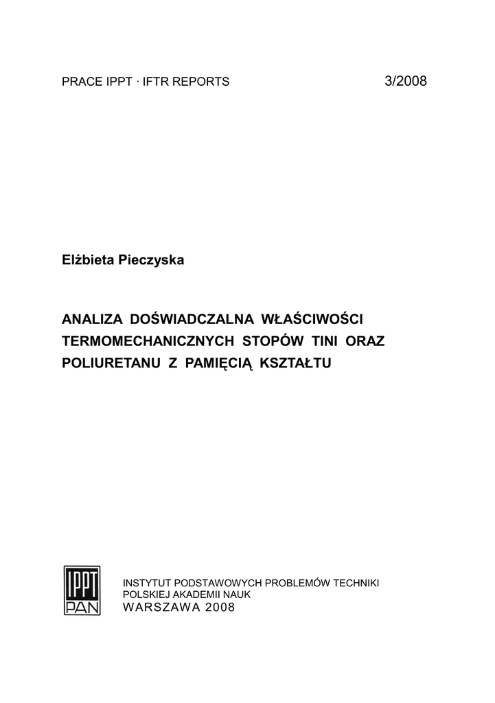 PRACE IPPT · IFTR REPORTS 3/2008 ElŜbieta Pieczyska ANALIZA DOŚWIADCZALNA WŁAŚCIWOŚCI TERMOMECHANICZNYCH STOPÓW TINI ORAZ POLIURETANU Z PAMIĘCIĄ KSZTAŁTU INSTYTUT PODSTAWOWYCH PROBLEMÓW TECHNIKI POLSKIEJ AKADEMII NAUK W ARSZAW A 2008 ISBN 978-83-89687-37-1 ISSN 0208-5658 Redaktor Naczelny: prof. dr hab. Zbigniew Kotulski Recenzent: dr hab. Mieczysław Kuczma, prof. UZ Praca wpłynęła do Redakcji 14 czerwca 2008 r. Instytut Podstawowych Problemów Techniki PAN Nakład: 100 egz. Ark. druk.: 13.6 Oddano do druku w październiku 2008 roku Druk i oprawa: Drukarnia Braci Grodzickich, Piaseczno, ul. Geodetów 47a Analiza doświadczalna właściwości termomechanicznych stopów TiNi oraz poliuretanu z pamięcią kształtu SPIS TREŚCI 1. Wprowadzenie................................................................................................ str. 1 1.1. Przedmiot, cel i zakres pracy.......................................................................... str. 1 1.2. Ogólna charakterystyka materiałów z pamięcią kształtu .............................. str. 5 1.3. Właściwości stopów z pamięcią kształtu (SMA), rys historyczny i uzasadnienie tematyki badawczej................................................................................................... str. 6 2. Opis eksperymentu w zakresie badań właściwości termomechanicznych materiałów z pamięcią kształtu....................................................................... str. 15 2.1. Opis materiału i stanowiska badawczego.................................................... str. 15 2.1.1. Charakterystyka stopu TiNi z pamięcią kształtu.................................... str. 15 2.1.2. Materiał i próbki - TiNi SMA............... ............................................. str. 17 2.2. Opis aparatury badawczej............................................................................ str. 20 2.2.1. Omówienie moŜliwości stosowanej kamery termowizyjnej.............. str. 22 2.3. Oszacowanie błędów pomiarowych............................................................. str. 24 3. Efekty cieplno-deformacyjne w stadium nukleacji i rozwoju przemiany martenzytycznej wprost i odwrotnej podczas rozciągania TiNi SMA ........ str. 25 3.1. Nukleacja i rozwój przemiany martenzytycznej wprost i odwrotnej w stopie TiNi z pamięcią kształtu przy sterowaniu odkształceniem i napręŜeniem......... str. 25 3.1.1. Analiza przebiegu przemiany na podstawie zmian temperatury w punkcie lokalizacji w poszczególnych etapach rozciągania TiNi SMA.......... str. 36 3.1.2. Etapy przemiany martenzytycznej wyszczególnione na podstawie badań charakterystyk mechanicznych i temperaturowych TiNi SMA.......... str. 40 iv 3.2. Wpływ parametrów odkształcania na właściwości termomechaniczne stopu TiNi z pamięcią kształtu...................................................................................... str. 41 3.2.1. Wpływ zakresu odkształcenia na charakterystyki mechaniczne ....... str. 42 3.2.2.Wpływ prędkości odkształcenia na zmiany napręŜenia i temperatury str. 43 3.2.3. Wpływ prędkości odkształcenia na warunki lokalizacji przemiany....str. 51 3.3. Geometria pasma zlokalizowanej przemiany martenzytycznej w TiNi SMA.................................................................................................................... str. 55 3.4. Porównanie badań zlokalizowanej przemiany fazowej w SMA z wynikami otrzymanymi metodą cyfrowej korelacji obrazów rozkładów pól odkształceń.. str. 58 3.5. Badania monokryształu stopu z pamięcią kształtu - CuAlBe...................... str. 61 3.6. Podsumowanie badań nukleacji i rozwoju przemiany martenzytycznej w TiNi SMA.................................................................................................................... str. 64 4. Weryfikacja doświadczalna wybranych modeli teoretycznych................ str. 67 4.1. Podstawy teorii przemiany martenzytycznej w stopie z pamięcią kształtu; jednowymiarowy opis pseudospręŜystości......................................................... str. 67 4.2. Doświadczalne wyznaczenie parametrów przemiany fazowej badanego stopu TiNi z pamięcią kształtu...................................................................................... str. 73 4.3. Eksperymentalna identyfikacja parametrów przemian fazowych TiNi SMA ................................................................................................................... str. 79 4.4. Bilans energii przemiany martenzytycznej wprost i odwrotnej oszacowany dla róŜnych prędkości odkształcania........................................................................ str. 80 4.5. Bilans energii przemiany martenzytycznej – dyskusja wyników i podsumowanie.................................................................................................... str. 89 5. Zbadanie aktywności przemiany martenzytycznej wprost i odwrotnej w SMA w obecności efektów sprzęŜeń termodynamicznych...................................... str. 91 5.1. Zbadanie aktywności przemiany martenzytycznej wprost i odwrotnej podczas obciąŜania i odciąŜania ze stałą prędkością odkształcenia................................. str. 91 v 5.2. Zbadanie aktywności przemiany martenzytycznej wprost i odwrotnej podczas obciąŜania i odciąŜania ze stałą prędkością napręŜenia.................................... str. 101 5.2.1. Zbadanie wpływu wartości odkształcenia, przy którym wprowadzono przystanek, na przebieg przemian fazowych.............................................. str. 106 5.2.2. Zbadanie przebiegu przemiany odwrotnej, niezaleŜnie od termicznych konsekwencji przemiany martenzytycznej wprost..................................... str. 107 5.2.3. Zbadanie aktywności przemian martenzytycznych przy odpowiednio zaprogramowanych zmianach napręŜenia.................................................. str. 109 5.3. Warunki rozwoju p