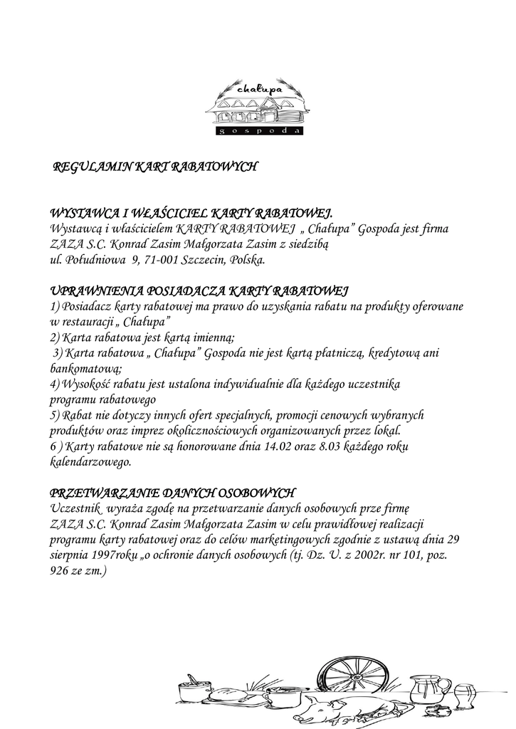 REGULAMIN KART RABATOWYCH WYSTAWCA I WŁAŚCICIEL KARTY RABATOWEJ. Wystawcą i właścicielem KARTY RABATOWEJ „ Chałupa” Gospoda jest firma ZAZA S.C. Konrad Zasim Małgorzata Zasim z siedzibą ul. Południowa 9, 71-001 Szczecin, Polska. UPRAWNIENIA POSIADACZA KARTY RABATOWEJ 1) Posiadacz karty rabatowej ma prawo do uzyskania rabatu na produkty oferowane w restauracji „ Chałupa” 2) Karta rabatowa jest kartą imienną; 3) Karta rabatowa „ Chałupa” Gospoda nie jest kartą płatniczą, kredytową ani bankomatową; 4) Wysokość rabatu jest ustalona indywidualnie dla każdego uczestnika programu rabatowego 5) Rabat nie dotyczy innych ofert specjalnych, promocji cenowych wybranych produktów oraz imprez okolicznościowych organizowanych przez lokal. 6 ) Karty rabatowe nie są honorowane dnia 14.02 oraz 8.03 każdego roku kalendarzowego. PRZETWARZANIE DANYCH OSOBOWYCH Uczestnik wyraża zgodę na przetwarzanie danych osobowych prze firmę ZAZA S.C. Konrad Zasim Małgorzata Zasim w celu prawidłowej realizacji programu karty rabatowej oraz do celów marketingowych zgodnie z ustawą dnia 29 sierpnia 1997roku „o ochronie danych osobowych (tj. Dz. U. z 2002r. nr 101, poz. 926 ze zm.) TERMIN WAŻNOŚCI KARTY RABATOWEJ 1) Karta rabatowa utrzymuje ważność do końca roku kalendarzowego w którym została wydana, chyba, że wydanie karty nastąpi w ostatnim kwartale danego roku kalendarzowego. W takim przypadku karta utrzymuje ważność do końca następnego roku kalendarzowego po roku w którym została wydana. 2)W przypadku zagubienia bądź zniszczenia karty rabatowej uczestnik ma prawo o ubieganie się nowej karty u managera restauracji . 3) Wystawca karty rabatowej ma prawo do zakończenia programu Karty rabatowej w każdym czasie bez podania przyczyn. W przypadku zakończenia programu wszystkie wydane karty rabatowe ulegają unieważnieniu. POSTANOWIENIA KOŃCOWE 1) Niniejszy regulamin jest dostępny w Restauracji „Chałupa” oraz na stronie internetowej www.chalupa.com.pl . 2) Firma ZAZA. S.C Konrad Zasim Małgorzata Zasim zastrzega sobie możliwość wprowadzania zmian do niniejszego regulaminu i informowania uczestników programu poprzez udostępnienie zmienionej wersji regulaminu poprzez umieszczenie jej na w/w stronie internetowej lub w punktach sprzedaży. 3) Podany regulamin uważany jest za zaakceptowany przez uczestnika programu z momentem pierwszego użycia karty rabatowej.