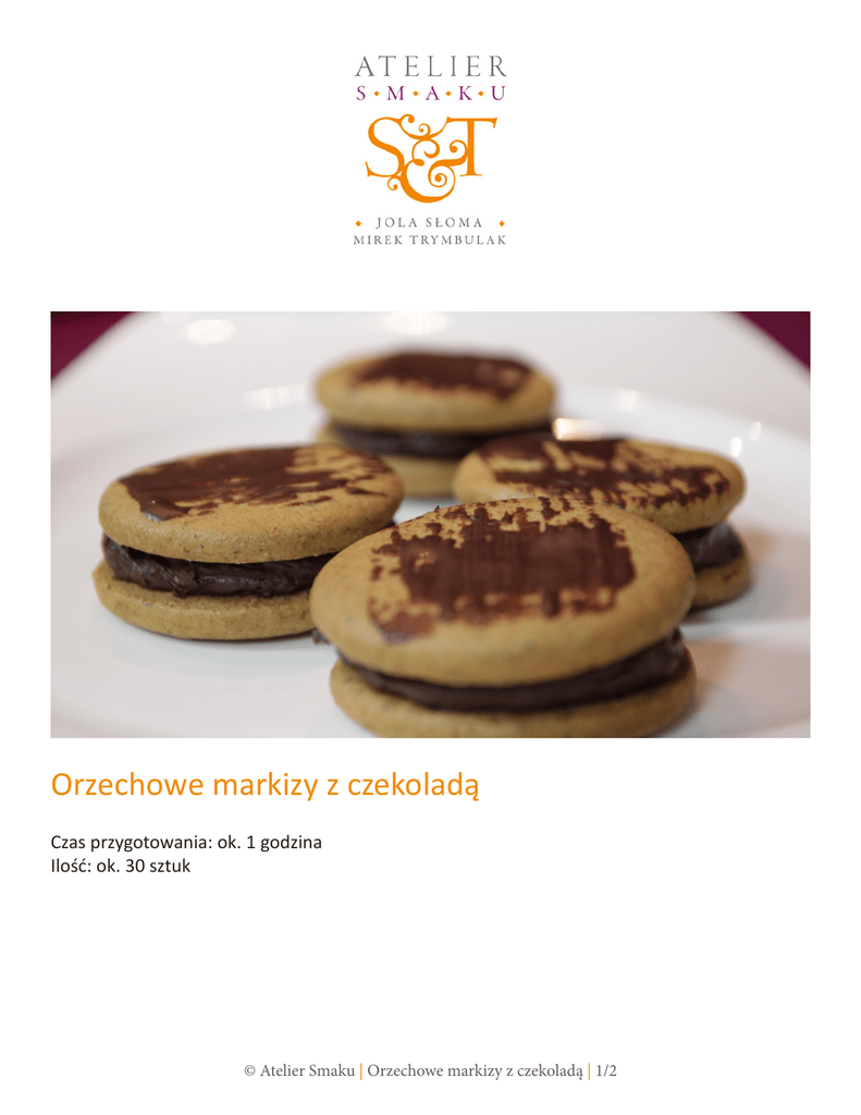 Orzechowe markizy z czekoladą Czas przygotowania: ok. 1 godzina Ilość: ok. 30 sztuk © Atelier Smaku | Orzechowe markizy z czekoladą | 1/2 Składniki 20 dag mąki kukurydzianej 20 dag mąki ziemniaczanej 25 dag brązowego cukru pudru 15 dag zmielonych orzechów włoskich i migdałów 150 ml mleka kokosowego 120 ml oleju słonecznikowego 2 łyżki zmielonego siemienia lnianego 1,5 łyżeczki sody szczypta soli krem czekoladowo-orzechowy czekolada do rozpuszczenia Sposób przygotowania Brązowy cukier mielimy na puder, następnie wszystkie suche składniki na ciasto, razem ze zmielonymi orzechami, łączymy ze sobą i dokładnie mieszamy. Do tak przygotowanej bazy dolewamy olej i dobrze miksujemy. Dodajemy mleko kokosowe i ponownie ucieramy. Gotową masę wyciągamy na stolnicę i równo wałkujemy, następnie za pomocą foremki wyciskamy kształt ciastek i układamy je na blachę. Całość wkładamy do piekarnika nagrzanego do 175°C i pieczemy około 25 minut. Podczas gdy ciasteczka są jeszcze w piekarniku, do rondelka wrzucamy i powoli rozpuszczamy czekoladę, której potrzebować będziemy do smarowania po wierzchu gotowych markiz. Po wyciągnięciu gotowych połówek z piekarnika odstawiamy je na chwilkę do przestygnięcia. Gdy przestygną smarujemy je kremem czekoladowym, dociskamy i smarujemy czekoladą. © Atelier Smaku | Orzechowe markizy z czekoladą | 2/2