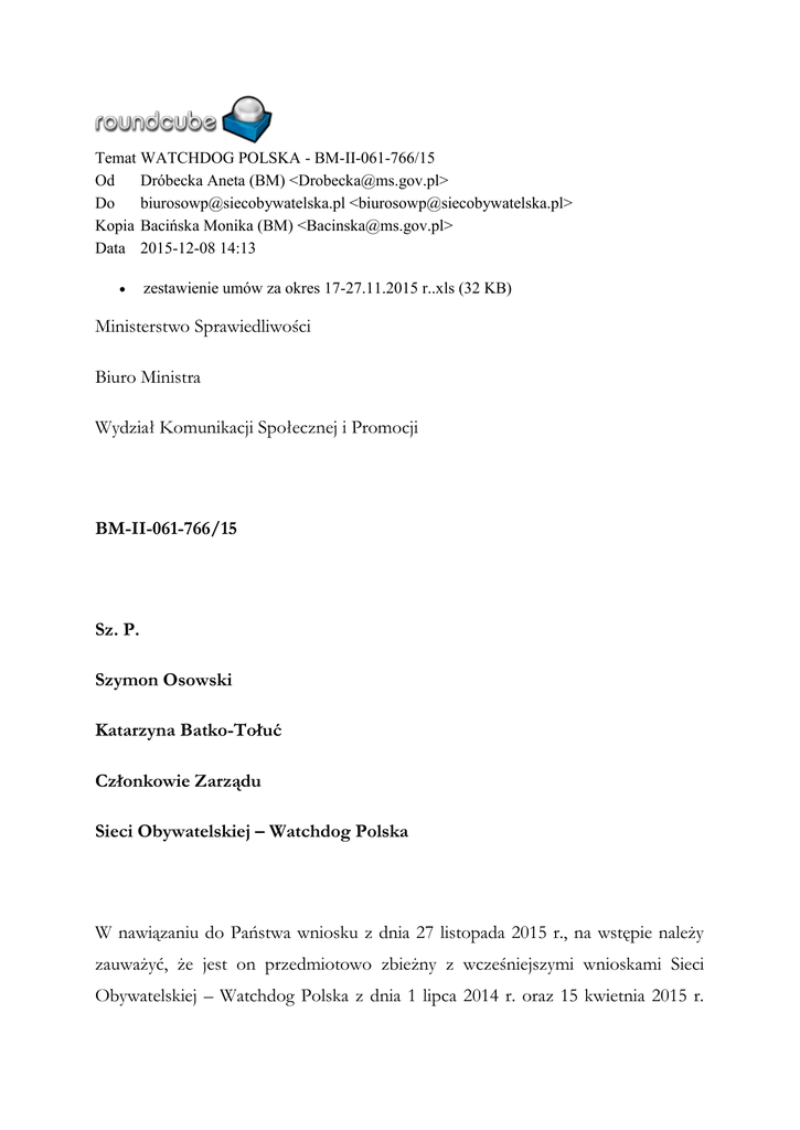 Temat WATCHDOG POLSKA - BM-II-061-766/15 Od Dróbecka Aneta (BM) <[email protected]> Do [email protected] <[email protected]> Kopia Bacińska Monika (BM) <[email protected]> Data 2015-12-08 14:13 zestawienie umów za okres 17-27.11.2015 r..xls (32 KB) Ministerstwo Sprawiedliwości Biuro Ministra Wydział Komunikacji Społecznej i Promocji BM-II-061-766/15 Sz. P. Szymon Osowski Katarzyna Batko-Tołuć Członkowie Zarządu Sieci Obywatelskiej – Watchdog Polska W nawiązaniu do Państwa wniosku z dnia 27 listopada 2015 r., na wstępie należy zauważyć, że jest on przedmiotowo zbieżny z wcześniejszymi wnioskami Sieci Obywatelskiej – Watchdog Polska z dnia 1 lipca 2014 r. oraz 15 kwietnia 2015 r. Sprawa wniosku z dnia 1 lipca 2014 r., w którym zwrócili się Państwo o udostępnienie kalendarza spotkań Ministra za okres 1 stycznia 2014 do 30 czerwca 2014 r. była przedmiotem rozpoznania przez Wojewódzki Sąd Administracyjny w Warszawie, który w wyroku z dnia 27 stycznia 2015 r. sygn. akt II SAB/Wa 588/14 przyznał rację Ministrowi Sprawiedliwości i uznał, że żądanie udostępnienia kalendarza spotkań Ministra nie stanowi informacji publicznej. Stowarzyszenie wniosło skargę kasacyjną od tego wyroku i aktualnie skarga ta oczekuje na rozpatrzenie przez Naczelny Sąd Administracyjny. W zaistniałej sytuacji nie znajduję podstaw do zmiany dotychczasowego stanowiska w sprawie terminarza spotkań Ministra Sprawiedliwości. Przypominam zatem, że żądana informacja nie ma charakteru informacji publicznej w rozumieniu art. 1 ust. 1 ustawy z dnia 6 września 2001 r. o dostępie do informacji publicznej (j. t.: Dz. U. z 2014 r. poz. 782 ze zm.). Prowadzony w tut. Urzędzie kalendarz Ministra Sprawiedliwości jest zbiorem roboczych informacji odnotowywanych przez najbliższych współpracowników Ministra. W ramach organizacji, jaką jest tut. Urząd, kalendarz traktowany jest jako materiał wewnętrzny, roboczy i niewiążący. Kalendarz wykorzystywany jest jedynie posiłkowo przez najbliższych współpracowników Ministra, jako narzędzie pomocnicze w realizacji codziennych obowiązków przez te osoby. Co istotne, treść prowadzonego kalendarza nie oddaje działań podejmowanych przez Ministra Sprawiedliwości. Z jednej bowiem strony wpisy zamieszczane w kalendarzu dotyczą wydarzeń, które nie zawsze dochodzą do skutku (spotkania są odwoływane lub przekładane na inny termin etc.), z drugiej zaś, nie każde spotkanie Ministra Sprawiedliwości, które faktycznie ma miejsce jest odnotowywane w kalendarzu (np. w związku z krótkim terminem wystosowania zaproszenia). Stąd treść roboczych wpisów może wprowadzać w błąd i nie stanowi informacji o faktach, a w konsekwencji nie stanowi informacji publicznej. Powyższe stanowisko zostało również podtrzymane w odpowiedzi tut. Urzędu z dnia 27 kwietnia 2015 r. na Państwa wniosek z dnia 15 kwietnia 2015 r. Odnosząc się do wniosku o udostępnienie księgi wyjść/wejść do Ministerstwa za okres od 17 listopada do 27 listopada 2015 r., informuję, że w tym zakresie również podtrzymuję dotychczasową odpowiedź Ministerstwa Sprawiedliwości. Otóż w piśmie z dnia 11 czerwca 2015 r. nr BM-II-061-162/15, stanowiącym odpowiedź na wniosek z dnia 15 kwietnia 2015 r., zostali Państwo poinformowani, że księga wyjść/wejść do Ministerstwa Sprawiedliwości nie stanowi informacji publicznej. Stanowisko to zostało oparte na poglądzie prawnym wyrażonym przez Wojewódzki Sąd Administracyjny w Warszawie w prawomocnym wyroku z dnia 16 kwietnia 2015 r. sygn. akt II SAB/Wa 1055/14. W powołanym wyroku Sąd rozpoznał sprawę z zakresu dostępu do informacji publicznej, która dotyczyła udostępnienia księgi wejść/wyjść gości do Ministerstwa Sportu i Turystyki. Sąd uznał cyt. „żądanie udostępnienia elektronicznej księgi wejść do budynku Ministerstwa Sportu i Turystyki, nie dotyczy informacji publicznej w rozumieniu ustawy o dostępie do informacji publicznej. Przedmiotowy nośnik nie zawiera informacji o sprawach publicznych, jako że przedstawia informację o personaliach osób spoza aparatu administracji publicznej, sporządzaną dla potrzeb organizacyjnych, zachowania bezpieczeństwa w budynku Ministerstwa. Jest to nośnik informacji o charakterze wewnętrznym, czysto technicznym, pomocniczo służącym do zarządzania budynkiem. Przy czym gromadzenie i posiadanie tego typu informacji nie jest wymagane przepisami prawa i nie jest dokonywane w związku w ustawową działalnością organu, a tylko wspomaga pracę recepcji, działu organizacyjnego w sferze porządku i bezpieczeństwa w budynku Ministerstwa. Nie odnosi się zatem do obszaru jakiejkolwiek działalności organu, o której mowa w art. 1 i 6 ustawy o dostępie do informacji publicznej, a tym samym nie zawiera komunikatu o sprawach publicznych. Z tego względu nie podlega on udostępnieniu w trybie ustawy o dostępie do informacji publicznej, bowiem cech takiej informacji nie posiada". Pełne brzmienie rozstrzygnięcia Sądu jest powszechnie dostępne w Centralnej Bazie Orzeczeń Sądów Administracyjnych, pod adresem: http://orzeczenia.nsa.gov.pl/cbo/search Biorąc pod uwagę stanowisko Sądu, przyjąć należy, że zostało ono sformułowane w oparciu o analogiczny stan faktyczny do niniejszej sprawy. Podobnie, jak w przypadku rejestru prowadzonego w Ministerstwie Sportu i Turystyki, prowadzone w tut. Urzędzie księgi gości są sporządzane w celu zachowania bezpieczeństwa w poszczególnych budynkach Ministerstwa Sprawiedliwości, dla potrzeb organizacyjnych. Są to nośniki o charakterze wewnętrznym i czysto technicznym. Prowadzenie ksiąg gości nie jest dokonywane w związku z ustawową działalnością Ministra Sprawiedliwości i nie odnosi się do działalności, o której mowa w art. 1 i 6 ustawy o dostępie do informacji publicznej. O sposobie prowadzenia ksiąg w Ministerstwie Sprawiedliwości zostali Państwo poinformowani w od