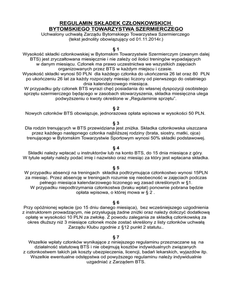 REGULAMIN SKŁADEK CZŁONKOWSKICH BYTOMSKIEGO TOWARZYSTWA SZERMIERCZEGO Uchwalony uchwałą Zarządu Bytomskiego Towarzystwa Szermierczego (tekst jednolity obowiązujący od 01.11.2014r.) §1 Wysokość składki członkowskiej w Bytomskim Towarzystwie Szermierczym (zwanym dalej BTS) jest zryczałtowana miesięcznie i nie zależy od ilości treningów wypadających w danym miesiącu. Członek ma prawo uczestnictwa we wszystkich zajęciach organizowanych przez BTS w każdym miejscu i czasie. Wysokość składki wynosi 50 PLN dla każdego członka do ukończenia 26 lat oraz 80 PLN po ukończeniu 26 lat za każdy rozpoczęty miesiąc liczony od pierwszego do ostatniego dnia kalendarzowego miesiąca. W przypadku gdy członek BTS wyrazi chęć posiadania do własnej dyspozycji osobistego sprzętu szermierczego będącego w zasobach stowarzyszenia, składka miesięczna ulega podwyższeniu o kwoty określone w „Regulaminie sprzętu”. §2 Nowych członków BTS obowiązuje, jednorazowa opłata wpisowa w wysokości 50 PLN. §3 Dla rodzin trenujących w BTS przewidziana jest zniżka. Składka członkowska uiszczana przez każdego następnego członka najbliższej rodziny (brata, siostry, matki, ojca) trenującego w Bytomskim Towarzystwie Sportowym wynosi 50% składki podstawowej. §4 Składki należy wpłacać u instruktorów lub na konto BTS, do 15 dnia miesiąca z góry. W tytule wpłaty należy podać imię i nazwisko oraz miesiąc za który jest wpłacana składka. §5 W przypadku absencji na treningach składka podtrzymująca członkostwo wynosi 15PLN za miesiąc. Przez absencję w treningach rozumie się nieobecność w zajęciach podczas pełnego miesiąca kalendarzowego liczonego wg zasad określonych w §1. W przypadku niepodtrzymania członkostwa (braku wpłat) ponownie pobrana będzie opłata wpisowa, o której mowa w § 2 . §6 Przy opóźnionej wpłacie (po 15 dniu danego miesiąca), bez wcześniejszego uzgodnienia z instruktorem prowadzącym, nie przysługują żadne zniżki oraz należy doliczyć dodatkową opłatę w wysokości 10 PLN za zwłokę. Z powodu zalegania ze składką członkowską za okres dłuższy niż 3 miesiące członek może zostać skreślony z listy członków uchwałą Zarządu Klubu zgodnie z §12 punkt 2 statutu.. §7 Wszelkie wpłaty członków wynikające z niniejszego regulaminu przeznaczane są na działalność statutową BTS i nie obejmują kosztów indywidualnych związanych z członkostwem takich jak koszty ubezpieczenia, licencji, badań lekarskich, wyjazdów itp. Wszelkie ewentualne odstępstwa od powyższego regulaminu należy indywidualnie uzgadniać z Zarządem BTS.