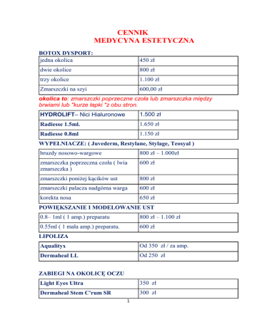 CENNIK MEDYCYNA ESTETYCZNA BOTOX DYSPORT: jedna okolica 450 zł dwie okolice 800 zł trzy okolice 1.100 zł Zmarszczki na szyi 600,00 zł okolica to: zmarszczki poprzeczne czoła lub zmarszczka między brwiami lub ''kurze łapki ''z obu stron. HYDROLIFT– Nici Hialuronowe 1.500 zł Radiesse 1.5ml. 1.650 zł Radiesse 0.8ml 1.150 zł WYPEŁNIACZE: ( Juvederm, Restylane, Stylage, Teosyal ) bruzdy nosowo-wargowe 800 zł – 1.000zł zmarszczka poprzeczna czoła ( lwia zmarszczka ) 600 zł zmarszczki poniżej kącików ust 800 zł zmarszczki palacza nadgórna warga 600 zł korekta nosa 650 zł POWIĘKSZANIE I MODELOWANIE UST 0.8– 1ml ( 1 amp.) preparatu 800 zł – 1.100 zł 0.55ml ( 1 mała amp.) preparatu. 600 zł LIPOLIZA Aqualityx Od 350 zł / za amp. Dermaheal LL Od 250 zł ZABIEGI NA OKOLICĘ OCZU Light Eyes Ultra 350 zł Dermaheal Stem C'rum SR 300 zł 1 Dermaheal HSR i SR 250 zł korekta cieni i oczodołów pod oczami kw. hialuronowy 800 zł SCULPTRA -1 zabieg 1.500 zł 2,3 zabiegi 1.200 zł MODELOWANIE TWARZY (Subq, 1.200 zł Voluma ) MASKI LEKARSKIE Maska Tretinoinowa 350,00 zł Maska z czynnikami wzrostu naskórka 200,00 zł 150,00 zł Maska Tretinoinowa5% 2