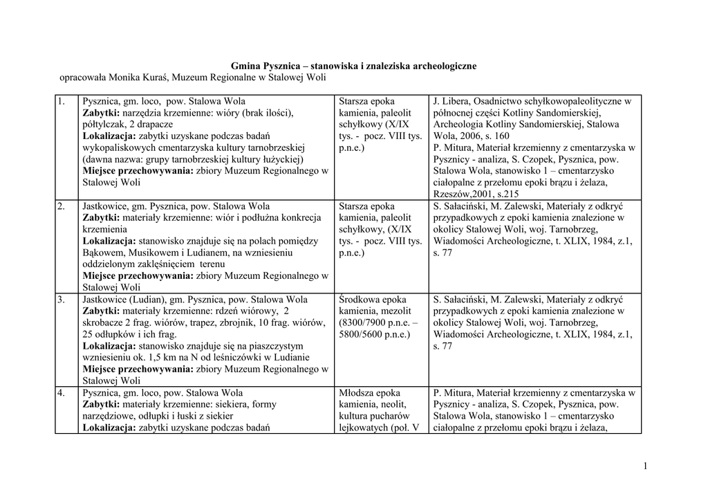 Gmina Pysznica – stanowiska i znaleziska archeologiczne opracowała Monika Kuraś, Muzeum Regionalne w Stalowej Woli 1. Pysznica, gm. loco, pow. Stalowa Wola Zabytki: narzędzia krzemienne: wióry (brak ilości), półtylczak, 2 drapacze Lokalizacja: zabytki uzyskane podczas badań wykopaliskowych cmentarzyska kultury tarnobrzeskiej (dawna nazwa: grupy tarnobrzeskiej kultury łużyckiej) Miejsce przechowywania: zbiory Muzeum Regionalnego w Stalowej Woli Starsza epoka kamienia, paleolit schyłkowy (X/IX tys. - pocz. VIII tys. p.n.e.) 2. Jastkowice, gm. Pysznica, pow. Stalowa Wola Zabytki: materiały krzemienne: wiór i podłużna konkrecja krzemienia Lokalizacja: stanowisko znajduje się na polach pomiędzy Bąkowem, Musikowem i Ludianem, na wzniesieniu oddzielonym zaklęśnięciem terenu Miejsce przechowywania: zbiory Muzeum Regionalnego w Stalowej Woli Jastkowice (Ludian), gm. Pysznica, pow. Stalowa Wola Zabytki: materiały krzemienne: rdzeń wiórowy, 2 skrobacze 2 frag. wiórów, trapez, zbrojnik, 10 frag. wiórów, 25 odłupków i ich frag. Lokalizacja: stanowisko znajduje się na piaszczystym wzniesieniu ok. 1,5 km na N od leśniczówki w Ludianie Miejsce przechowywania: zbiory Muzeum Regionalnego w Stalowej Woli Pysznica, gm. loco, pow. Stalowa Wola Zabytki: materiały krzemienne: siekiera, formy narzędziowe, odłupki i łuski z siekier Lokalizacja: zabytki uzyskane podczas badań Starsza epoka kamienia, paleolit schyłkowy, (X/IX tys. - pocz. VIII tys. p.n.e.) 3. 4. J. Libera, Osadnictwo schyłkowopaleolityczne w północnej części Kotliny Sandomierskiej, Archeologia Kotliny Sandomierskiej, Stalowa Wola, 2006, s. 160 P. Mitura, Materiał krzemienny z cmentarzyska w Pysznicy - analiza, S. Czopek, Pysznica, pow. Stalowa Wola, stanowisko 1 – cmentarzysko ciałopalne z przełomu epoki brązu i żelaza, Rzeszów,2001, s.215 S. Sałaciński, M. Zalewski, Materiały z odkryć przypadkowych z epoki kamienia znalezione w okolicy Stalowej Woli, woj. Tarnobrzeg, Wiadomości Archeologiczne, t. XLIX, 1984, z.1, s. 77 Środkowa epoka kamienia, mezolit (8300/7900 p.n.e. – 5800/5600 p.n.e.) S. Sałaciński, M. Zalewski, Materiały z odkryć przypadkowych z epoki kamienia znalezione w okolicy Stalowej Woli, woj. Tarnobrzeg, Wiadomości Archeologiczne, t. XLIX, 1984, z.1, s. 77 Młodsza epoka kamienia, neolit, kultura pucharów lejkowatych (poł. V P. Mitura, Materiał krzemienny z cmentarzyska w Pysznicy - analiza, S. Czopek, Pysznica, pow. Stalowa Wola, stanowisko 1 – cmentarzysko ciałopalne z przełomu epoki brązu i żelaza, 1 wykopaliskowych cmentarzyska kultury tarnobrzeskiej Miejsce przechowywania: zbiory Muzeum Regionalnego w Stalowej Woli 5. 6. 7. 8. Pysznica, gm. loco, pow. Stalowa Wola Zabytki: siekiera krzemienna Lokalizacja: (w literaturze brak inf. o dokładnej lokalizacji) Miejsce przechowywania: zbiory Muzeum Okręgowego w Rzeszowie tys. - pocz. III tys. p.n.e.) Młodsza epoka kamienia, neolit, kultura amfor kulistych (3200/3100 – 2400/2100 tys. p.n.e.) Jastkowice, gm. Pysznica, pow. Stalowa Wola Epoka kamienia: Zabytki: materiały krzemienne: rylec, 2 drapacze, frag. paleolit schyłkowy, wiórowca, półtylczak, 4 frag. zatępców, rylczak, 35 wiórów, mezolit, neolit (?) 72 odłupków i ich fragmentów X/IX tys. – 2400Lokalizacja: stanowisko położone w przysiółku „Łuniki” na 2300 p.n.e. piaszczystym wyniesieniu ( obecnie zniwelowanym) pomiędzy Bąkowem a Ludianem, ok. 1,2 km na SW od Ludianu Miejsce przechowywania: zbiory Muzeum Regionalnego w Stalowej Woli Pysznica, gm. loco, pow. Stalowa Wola Epoka brązu, kultura Zabytki: krzemienne płoszcze - grot oszczepu mierzanowicka, Lokalizacja: zabytek uzyskany podczas badań (2300-1600 p.n.e.) wykopaliskowych cmentarzyska kultury tarnobrzeskiej Miejsce przechowywania: zbiory Muzeum Regionalnego w Stalowej Woli Pysznica, gm. loco, pow. Stalowa Wola Zabytki: 19 fragmentów ceramiki Rzeszów,2001, s.215-217 E. Pochorska, Badania archeologiczne w Pysznicy, gm. loco, woj. Tarnobrzeg, Materiały i Sprawozdania Rzeszowskiego Ośrodka Archeologicznego za lata 1973-1975, Rzeszów, 1979, str. 128-131 S. Czopek, Pradzieje Polski południowo – wschodniej, 2003, s. 79 S. Czopek, Kamień – brąz – żelazo. Zarys archeologii Polski południowo-wschodniej, Rzeszów, 1998, s. 55 S. Sałaciński, M. Zalewski, Materiały z odkryć przypadkowych z epoki kamienia znalezione w okolicy Stalowej Woli, woj. Tarnobrzeg, Wiadomości Archeologiczne, t. XLIX, 1984, z.1, s. 76 P. Mitura, Materiał krzemienny z cmentarzyska w Pysznicy - analiza, S. Czopek, Pysznica, pow. Stalowa Wola, stanowisko 1 – cmentarzysko ciałopalne z przełomu epoki brązu i żelaza, Rzeszów,2001, s.216 Epoka brązu, kultura H. Taras, Kultura trzciniecka w międzyrzeczu trzciniecka, (XVIWisły, Bugu i Sanu, Lublin, 1995, s. 242 2 9. 10. Lokalizacja: znalezisko luźne, z badań powierzchniowych (w literaturze brak inf. o dokładnej lokalizacji) Miejsce przechowywania: zbiory Muzeum Okręgowe w Sandomierzu Pysznica, gm. loco, pow. Stalowa Wola Zabytki - 686 nr inwentarzowych: ceramika: naczynia wazowate, naczynia garnkowate, misy, kubki, czerpaki; ozdoby metalowe: kółka-skręty, paciorki, szpile, zawieszki, bransolety; wytwory krzemienne - 108 szt.; kości zmarłych przepalone; Lokalizacja: cmentarzysko, 772 groby Miejsce przechowywania: zbiory Muzeum Regionalnego w Stalowej Woli XIII w. p.n.e.) Pysznica, gm. loco, pow. Stalowa Wola Zabytki: żelazne umbo (zakończenie tarczy), grot włóczni Lokalizacja: 2 groby ciałopalne (w literaturze brak inf. o dokładnej lokalizacji) Miejsce przechowywania: Muzeum Okręgowe w Rzeszowie Epoka żelaza, okres rzymski, kultura przeworska, I-III w. n.e Epoka brązu/wczesna epoka żelaza, kultura tarnobrzeska, (dawna nazwa: grupa tarnobrzeska kultury łużyckiej) 900/800 – 400 p.n.e. S. Czopek, Cmentarzysko ciałopalne z przełomu epok brązu i żelaza w Pysznicy, Stalowa Wola, 1999 S. Czopek, Pysznica, pow. Stalowa W