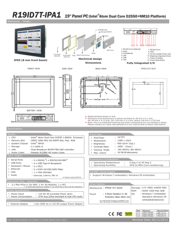 R19ID7T-IPA1 Mechanical R 19" Panel PC (Intel Atom Dual Core D2550+NM10 Platform) Design Fanless design Storage (HDD/CF) SBC Board 12 1. RS-232 Conn.(Optional) 2. Audio 3. DVI(Optional) 4. LAN 5. USB 6. VGA Back Cover Front bezel (Optional) Inverter Touch/Glass (Optional) Panel Metal Frame Housing Mechnical design IP65 (8 mm front bezel) Dimensions 7. RS-232 Conn. 8. PS/2 9. DC-IN Lockable Power Jack 10. Brightness Adjustment Knob 11. Power On Button 12. Power Reset Button Fully Integrated I/O IP65 CUT OUT Measurements shown in mm * Tolerance dimensions is shown as follow 0~30 mm ± 0.1 mm, * 30~50 mmof±all0.15 mm, 50~120 mm ± 0.2 mm, above 120 mm ± 0.25 mm Note: this is a simplified drawing and some components are not marked in detail. * Please contact our sales representative if you need further product information. Specifications System : Panel Spec : CPU Memory Slot : Intel ® Atom Dual Core D2550 1.86GHz Processor : DDR3 1066 MHz SO-DIMM Slot, Max. 4GB ® System Chipset : Intel NM10 : 2 x SATA II Storage LAN Audio Codec : Dual Broadcom BCM57780 GbE controller : Realtek ALC886 HD Audio Codec Size/Type : 19"TFT Resolutions : 1280 x 1024 Brightness 2 : 400 cd/m (typ.) Contrast Ratio : 1000 : 1(typ.) Viewing Angle : -85~85(H);-80~80(V) Max. Colors : 16.7M (8 bits/colors) Input / Output : Serial Ports : 2 x RS232, 1 x RS232/422/485 USB Ports : 4 x USB Type-A Receptacle Keyboard / Mouse : 2 x PS/2 Ethernet : 2 x RJ45-10/100/1000 Mbps : 1 x VGA (female) : Line-out, Line-in, Mic in VGA Audio Environment Considerations : Operating Temperature Operating Humidity : : 0 deg.C to 45 deg.C 30% to 90% (non condensing) OS BSP / Driver Support : Support Windows 7 embedded / Windows XP embedded Default setting:RS232 Expa ns ion Sl ot : (int er nal ) 2 x Mini PCIe (1 for WiFi, 1 for 3G Module), 1 x PCI * A customized housing is needed if you would like to have the PCI expansion. Order Options : Mechanical : IP65(8 mm bezel) Power Specifications : Power Input Power Consumption : 12V DC IN (Lockable Power Jack) : 57W (typ.)(Max.backlight & high CPU load) Accessori es : Externa l Adapter Touch : 5-Wires Resistive or AR Storage : 2.5" HDD/ mSATA SSD : DDR3 1066 Max 4GB RAM : Windows 7 embedded OS Standard /Windows XP Protective Glass either one embedded(Optional) (A customized housing is needed if you have demands of SAW/IR/IT/SC touch) : 110~230V Ac-in 12V DC-output Power Adapter Rev. 1.2 1.3 1.4 Note: All Specifications are subject to change without prior notice! Reasons Spec change Spec change Spec change Revised Date Apr-11-12 May-06-13 Nov-20-13 Revised Date:20/11/2013
