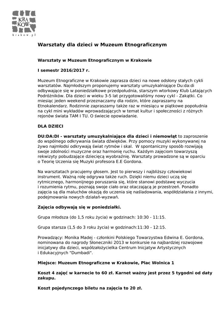 Warsztaty dla dzieci w Muzeum Etnograficznym Warsztaty w Muzeum Etnograficznym w Krakowie I semestr 2016/2017 r. Muzeum Etnograficzne w Krakowie zaprasza dzieci na nowe odsłony stałych cykli warsztatów. Najmłodszym proponujemy warsztaty umuzykalniające Du:da:di odbywające się w poniedziałkowe przedpołudnia, starszym wtorkowy Klub Latających Podróżników. Dla dzieci w wieku 3-5 lat przygotowaliśmy nowy cykl - Zakątki. Co miesiąc jeden weekend przeznaczamy dla rodzin, które zapraszamy na Etnokalendarz. Rodzinnie zapraszamy także raz w miesiącu w piątkowe popołudnia na cykl mini wykładów wprowadzających w temat kultur i społeczności z różnych rejonów świata TAM I TU. O świecie opowiadanie. DLA DZIECI DU:DA:DI - warsztaty umuzykalniające dla dzieci i niemowląt to zaproszenie do wspólnego odkrywania świata dźwięków. Przy pomocy muzyki wykonywanej na żywo najmłodsi odkrywają świat rytmów i skal. W spontaniczny sposób rozwijają swoje zdolności muzyczne oraz harmonię ruchu. Każdym zajęciom towarzyszą rekwizyty pobudzające dziecięcą wyobraźnię. Warsztaty prowadzone są w oparciu o Teorię Uczenia się Muzyki profesora E.E Gordona. Na warsztatach pracujemy głosem. Jest to pierwszy i najbliższy człowiekowi instrument. Ważną rolę odgrywa także ruch. Dzięki niemu dzieci uczą się rytmicznego, harmonijnego poruszania się, które stanowi podstawę wyczucia i rozumienia rytmu, poznają swoje ciało oraz otaczającą je przestrzeń. Ponadto zajęcia są dla maluchów okazją do uczenia się naśladowania, współdziałania z innymi, podejmowania nowych działań-wyzwań. Zajęcia odbywają się w poniedziałki. Grupa młodsza (do 1,5 roku życia) w godzinach: 10:30 - 11:15. Grupa starsza (1,5 do 3 roku życia) w godzinach:11:30 - 12:15. Prowadzący: Monika Madej - członkini Polskiego Towarzystwa Edwina E. Gordona, nominowana do nagrody Słoneczniki 2013 w konkursie na najbardziej rozwojowe inicjatywy dla dzieci, współzałożycielka Centrum Inicjatyw Artystycznych i Edukacyjnych "Dumbadi". Miejsce: Muzeum Etnograficzne w Krakowie, Plac Wolnica 1 Koszt 4 zajęć w karnecie to 60 zł. Karnet ważny jest przez 5 tygodni od daty zakupu. Koszt pojedynczego biletu na zajęcia to 20 zł. ZAKĄTKI - cykl warsztatów dla dzieci w wieku od 3 do 5 lat, podczas których uczestnicy w towarzystwie rodziców zamienią się w małych etnografów i wspólnie będą doświadczać niezwykłości świata, ukrytego w muzeum. Ale czy ten zapomniany świat, przedmiotów, zwyczajów, ludzi odnajdziemy dzisiaj w naszym otoczeniu? Pierwszym gestem etnografa jest uważne spojrzenie: na sposoby życia ludzi oraz otaczający nas świat rzeczy. Patrzenie to także pierwszy odruch dziecka. Obserwacja i wpisane w nią doświadczanie rzeczywistości to zatem dla nas wspólna przestrzeń spotkania, uczestniczenia w kulturze poprzez przeżywanie, by zastanawiać się, interpretować. Warsztaty będą pretekstem do uważnego przyjrzenia się światu, uruchomienia wyobraźni. Pytania, dziecięca dociekliwość oraz kreatywność pozwolą na odkrycie tajemnic dawnych mieszkańców Krakowa, co będzie inspiracją do twórczych zabaw plastycznych, konstruktorskich i eksperymentalnych. Przeszłość spotka się z teraźniejszością: farba dotknie kamienia, patyk zastąpi kredkę a sznurek okaże się super zabawką. Zadając sobie pytanie o to jak było kiedyś sprawdzimy jakie zmiany zachodzą w naszym najbliższym otoczeniu i ile z dawnych doświadczeń czerpiemy teraz. Dawne rozwiązania zainspirują nas do własnych doświadczeń z fakturą, kolorem, kształtem, materią, dźwiękiem oraz poszukiwania kulturowych znaczeń w nich ukrytych. Zajęcia prowadzi Ewelina Krawczyk – absolwentka Edukacji Artystycznej AJD w Częstochowie. Ukończyła studia podyplomowe z Arteterapii oraz Pedagogiki Przedszkolnej i Wczesnoszkolnej. Animator działań artystyczno-pedagogicznych, edukator sztuki, nauczyciel. Doświadczenie w pracy z dziećmi zdobyła jako nauczyciel w krakowskich przedszkolach. Obecnie prowadzi warsztaty plastyczne i twórcze dla dzieci wieku 3-7 lat. Zajęcia odbywają się w środy w godz. 17.00 - 18.00. Informacje praktyczne: Miejsce: Muzeum Etnograficzne w Krakowie, Ratusz, pl. Wolnica 1 Koszt czterech zajęć w karnecie to 60 PLN. Karnet ważny jest przez pięć tygodni od daty zakupu. Koszt pojedynczego biletu na zajęcia to 20 PLN. Honorujemy Kartę Dużej Rodziny, Krakowską Kartę Rodzinną oraz Krakowską Kartę Rodzinną 3+ – 30% zniżki na udział w zajęciach dla posiadaczy Karty. Informacje i rezerwacje: [email protected] lub tel.: 12 430 18 27, od poniedziałku do piątku, godz. 8.00 – 16.00. KLUB LATAJĄCYCH PODRÓŻNIKÓW - cykl warsztatów dla dzieci w wieku od 6 do 9 lat, podczas których spotykamy się z różnymi kulturami i krainami geograficznymi sięgając po lokalne opowieści i legendy oraz do muzealnej kolekcji. Pokazujemy dzieciom różnorodność świata, różne tradycje, języki, obyczaje. Korzystamy z możliwości, które tkwią w mapach, plastyce, teatrze i dziecięcej ciekawości. Pocztówki z Podróży. – trzecia odsłona cyklu Tym razem Latający Podróżnicy za swój cel obiorą Europę. W trakcie kolejnych spotkań uczestnicy przemierzą nasz kontynent od podnóży Uralu, po przylądki Półwyspu Iberyjskiego, od koła polarnego, aż po wyspy Morza Śródziemnego. Wspólnie postarają się odnaleźć to, co dla każdego z omawianych regionów jest wyjątkowe i to, co jest wspólne dla całej Europy. Cykl będzie szansą na spojrzenie na nasz kontynent ze świeżej perspektywy. Jego celem jest pokazanie zarówno tego, co znane z przewodników turystycznych, jak i tego, co nie mieści się w turystycznej sztampie. Przez kulturę, legendy, obyczaje, ciekawe święta, ważne osobistości, a nawet archeologiczne wykopaliska, poznawać będziemy ludzi zamieszkujących nasz kontynent, a przy okazji – poznamy lepiej to, kim my w Eu