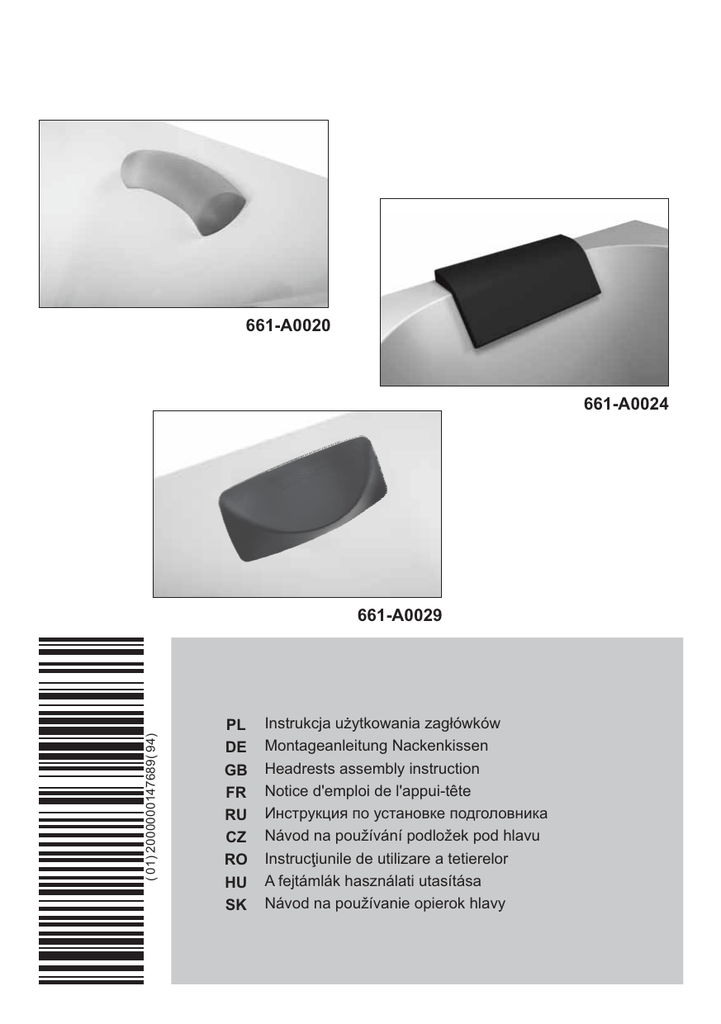 661-A0020 661-A0024 ( 01) 2000000147689( 94) 661-A0029 PL DE GB FR RU CZ RO HU SK Instrukcja użytkowania zagłówków Montageanleitung Nackenkissen Headrests assembly instruction Notice d'emploi de l'appui-tête Инструкция по установке подголовника Návod na používání podložek pod hlavu Instrucţiunile de utilizare a tetierelor A fejtámlák használati utasítása Návod na používanie opierok hlavy 661-A0020, 661-A0024, 661-A0029 661-A0020 661-A0024 1 661-A0029 1 1 2 2 2 Wskazówki: • do czyszczenia zagłówka używać wyłącznie wody z mydłem, • żrące i agresywne środki czyszczące mogą uszkodzić zagłówek, • nie należy pozostawiać zagłówka pod długotrwałym wpływem promieni UV (nie nadaje się do użytku zewnętrznego), • produkt przeznaczony wyłącznie do użytku w kąpieli, • dla uzyskania odpowiedniej przyczepności do powierzchni akrylu prosimy, zainstalować zagłówek przed napełnieniem wanny. Uwaga: Producent zastrzega sobie prawo do wprowadzania zmian w zakresie charakterystyki technicznej oraz kolorystyki opisywanych elementów. DE Pflegehinweise: • zur Reinigung empfehlen wir ausschließlich Wasser mit Seife zu verwenden, • ätzende Reinigungsmittel können das Nackenkissen beschädigen, • das Nackenkissen sollte nicht lange der UV-Strahlenwirkung ausgesetzt werden (es kann nicht draußen eingesetzt werden), • das Nackenkissen sollte ausschließlich im Badbereich verwendet werden, • um eine gute Klebefestigkeit an die Acryloberfläche zu gewährleisten, empfehlen wir das Nackenkissen vor der Wannenfüllung zu montieren. Achtung: Der Hersteller behält sich das Recht vor, technische Änderungen und Farbenänderungen in den Produkten einzuführen. GB Warning: • only water and soap use for the headrest cleaning, • corrosive and agressive products may damage the headrest, • do not leave the headrest in long contact to uva rays (non suitable outdoor), • bath use only suitable, • for a successful adherence to the acrylic surface install it in the bath before filling up. Notice: The producer reserves the right to introduce changes of technical parameters and colours of described elements. FR Consignes: • pour nettoyer l'appui-tête n'utiliser que de l'eau savonneuse ; • les produits de nettoyage caustiques et chimiquement agressifs peuvent endommager l'appui-tête ; • ne pas exposer l'appui-tête à une action des rayons UV de longue durée (il n'est pas adapté à une utilisation extérieure) ; • le produit n'est destiné qu'à être utilisé lors d'un bain ; • en vue d'obtenir une adhésion appropriée, l'appui-tête doit être installé avant le remplissage de la baignoire. Attention: Le constructeur se réserve le droit d'apporter des modifications des caractéristiques techniques et des coloris des éléments décrits. RU Указания: • • • • для очистки подголовника применять исключительно воду с мылом, едкие абразивные чистящие средства могут повредить подголовник, нельзя оставлять подголовник под длительным влиянием лучей UV, изделие предназначено исключительно для ванной комнаты, • для соответствующей прилипчивости к акриловой поверхности просим установить подголовник перед наполнением ванны. Внимание: Производитель оставляет за собой право изменять технические характеристики и цветовую гамму указанных элементов. CZ Pokyny: • k čištění podložky používejte výhradně vodu s mýdlem, • žíraviny a agresivní čistící prostředky mohou podložku poškodit, • nevystavujte podložku dlouhodobě působení UV záření (nehodí se k venkovnímu používání) • výrobek je určený výhradně k používání při koupání, • pro získání vhodné přilnavosti k akrylové ploše je třeba umístit podložku před naplněním vany, Pozor: Výrobce si vyhrazuje právo zavádět změny v rozsahu technické charakteristiky a barev uvedených součástí. RO Indicaţii: • pentru curăţarea tetierei folosiţi exclusiv apă şi săpun, • preparatele de curăţare acide şi agresive pot să distrugă suprafaţa tetierei, • tetiera nu trebuie supusă o perioadă îndelungată de vreme la acţiune razelor UV (nu poate să fie utilizată în exterior), • produsul este destinat exclusiv pentru a fi utilizat la îmbăiere, • pentru obţinerea aderenţei necesare la suprafaţa acrilică vă indicăm să instalaţi tetiera înainte de umplerea căzii de baie. Atenţie: Producătorul îşi rezervă dreptul de a introduce schimbări în domeniul caracteristicilor tehnice şi a coloristicii elementelor descrise. HU Tanácsok: • a fejtámla tisztításához kizárólag szappanos vizet használjon, • maró és agresszív tisztítószerek károsíthatják a fejtámlát, • nem szabad a fejtámlát hosszú ideig kitenni UV sugárzás hatásának (nem való kültéri használatra), • a terméket kizárólag fürdéshez lehet használni, • az akril felülethez való megfelelő tapadáshoz a fejtámlát a kád vízzel való feltöltése előtt kell behelyezni, Figyelem: A gyártó fenntartja magának a jogot a bemutatott elemek műszaki jellemzőinek és színválasztékának módosításához. SK Pokyny: • na čistenie opierky hlavy používajte výhradne vodu s mydlom; • žieraviny a agresívne čistiace prostriedky môžu opierku poškodiť; • opierku nevystavujte dlhodobému pôsobeniu UV žiarenia (nehodí sa na vonkajšie používanie); • výrobok je určený výhradne na používanie pri kúpaní; • za účelom dosiahnutia vho