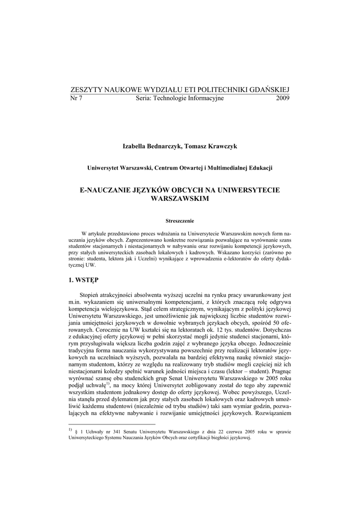 ZESZYTY NAUKOWE WYDZIAŁU ETI POLITECHNIKI GDAŃSKIEJ Nr 7 Seria: Technologie Informacyjne 2009 Izabella Bednarczyk, Tomasz Krawczyk Uniwersytet Warszawski, Centrum Otwartej i Multimedialnej Edukacji E-NAUCZANIE JĘZYKÓW OBCYCH NA UNIWERSYTECIE WARSZAWSKIM Streszczenie W artykule przedstawiono proces wdrażania na Uniwersytecie Warszawskim nowych form nauczania języków obcych. Zaprezentowano konkretne rozwiązania pozwalające na wyrównanie szans studentów stacjonarnych i niestacjonarnych w nabywaniu oraz rozwijaniu kompetencji językowych, przy stałych uniwersyteckich zasobach lokalowych i kadrowych. Wskazano korzyści (zarówno po stronie: studenta, lektora jak i Uczelni) wynikające z wprowadzenia e-lektoratów do oferty dydaktycznej UW. 1. WSTĘP Stopień atrakcyjności absolwenta wyższej uczelni na rynku pracy uwarunkowany jest m.in. wykazaniem się uniwersalnymi kompetencjami, z których znaczącą rolę odgrywa kompetencja wielojęzykowa. Stąd celem strategicznym, wynikającym z polityki językowej Uniwersytetu Warszawskiego, jest umożliwienie jak największej liczbie studentów rozwijania umiejętności językowych w dowolnie wybranych językach obcych, spośród 50 oferowanych. Corocznie na UW kształci się na lektoratach ok. 12 tys. studentów. Dotychczas z edukacyjnej oferty językowej w pełni skorzystać mogli jedynie studenci stacjonarni, którym przysługiwała większa liczba godzin zajęć z wybranego języka obcego. Jednocześnie tradycyjna forma nauczania wykorzystywana powszechnie przy realizacji lektoratów językowych na uczelniach wyższych, pozwalała na bardziej efektywną naukę również stacjonarnym studentom, którzy ze względu na realizowany tryb studiów mogli częściej niż ich niestacjonarni koledzy spełnić warunek jedności miejsca i czasu (lektor – student). Pragnąc wyrównać szansę obu studenckich grup Senat Uniwersytetu Warszawskiego w 2005 roku podjął uchwałę1), na mocy której Uniwersytet zobligowany został do tego aby zapewnić wszystkim studentom jednakowy dostęp do oferty językowej. Wobec powyższego, Uczelnia stanęła przed dylematem jak przy stałych zasobach lokalowych oraz kadrowych umożliwić każdemu studentowi (niezależnie od trybu studiów) taki sam wymiar godzin, pozwalających na efektywne nabywanie i rozwijanie umiejętności językowych. Rozwiązaniem 1) § 1 Uchwały nr 341 Senatu Uniwersytetu Warszawskiego z dnia 22 czerwca 2005 roku w sprawie Uniwersyteckiego Systemu Nauczania Języków Obcych oraz certyfikacji biegłości językowej. 22 Izabella Bednarczyk, Tomasz Krawczyk okazało się wprowadzenie nowych form uczenia (e-learning) w ramach Uniwersyteckiego Systemu Nauczania Języków Obcych. 2. PIERWSZE E-LEKTORATY NA UW – OPRACOWANIE I STRUKTURA Korzystając z dziesięcioletnich doświadczeń COME UW 2) w e-nauczaniu różnych przedmiotów akademickich oraz w koordynowaniu i realizacji projektów edukacyjnych dotyczących wprowadzania nowych i innowacyjnych jednostek dydaktycznych, podjęto próbę (rok 2006) wykorzystania nowoczesnych form przekazywania wiedzy do przygotowania zdalnego narzędzia skutecznie wspomagającego naukę języków obcych. Ze względu na ograniczenia organizacyjne i finansowe, niemożliwe było opracowywanie i wdrażanie nowych metod nauczania dla kilku języków obcych jednocześnie. Jako pierwszy wybrano angielski, którego znajomość jest niezbędna dla efektywnego funkcjonowania nie tylko w europejskim ale i światowym środowisku akademickim. Środki na realizację pozyskano z Europejskiego Funduszu Strukturalnego, w ramach obszernego projektu zatytułowanego „Opracowanie programów nauczania do kształcenia na odległość na kierunku studiów wyższych Informatyka”3). Integralną część projektu stanowiło przygotowanie e-kursów z języka angielskiego. COME wspólnie z Uniwersytetem Jagiellońskim opracowało pilotażową wersję dla czterech e-lektoratów (e-modułów) z języka angielskiego, które docelowo pozwalają studentom na osiągnięcie biegłości językowej na poziomach: A2, B1, B1/B2, B2, zgodnie z Europejskim Systemem Opisu Kształcenia Językowego. Przygotowywanie e-lektoratów z języka angielskiego okazało się procesem złożonym wymagającym sprawnego zarządzania i koordynowania różnych struktur na wielowymiarowej płaszczyźnie działań. Niezbędne było zaangażowanie kilku koordynatorów4) odpowiedzialnych za pracę pięciu różnych zespołów: metodyczno-dydaktycznego, informatyczno-multimedialnego, zespołu testującego i nanoszącego korekty w e-modułach, zespołu odpowiedzialnego za pilotaż i przygotowanie kadry do prowadzenia językowych e-zajęć oraz zespołu ds. ewaluacji. Zespół metodyczno-dydaktyczny opracowywał materiały z poszczególnych poziomów zaawansowania. Na jego prace składały się: (1) przygotowanie koncepcji kursu oraz programów (ramowych i szczegółowych) dla każdego z e-kursów bazowych, (2) zbudowanie od strony metodyczno-dydaktycznej konkretnych e-modułów (3) nagrania w studio dźwiękowym, (4) opracowanie metodyki e-nauczania języka angielskiego. W ramach prac metodyczno-dydaktycznych eksperci wewnętrzni jak i zewnętrzni dokonywali oceny przygotowanych materiałów, co pozwalało na ich korektę jeszcze w wersji papierowej, przed rozpoczęciem działań zespołu IT. Zespół IT prowadził prace graficzne, multimedialne i informatyczne umożliwiające zamieszczenie poszczególnych e-modułów i zawartych w nich lekcji na platformie e-nauczania (Moodle). Kolejny z zespołów zgodnie z nazwą (zespół testujący i nanoszący korekty w e-modułach) testował e-moduły od strony informatyczno-technicznej i poprawiał błędy, na różnych etapach zaawansowania prac projektowych. Wprowadzanie innowacyjnych rozwiązań w nauczaniu języka angielskiego 2) Centrum Otwartej i Multimedialnej Edukacji Uniwersytetu Warszawskiego (COME UW) – ogólnouczelniana jednostka odpowiedzialna za e-nauczanie,