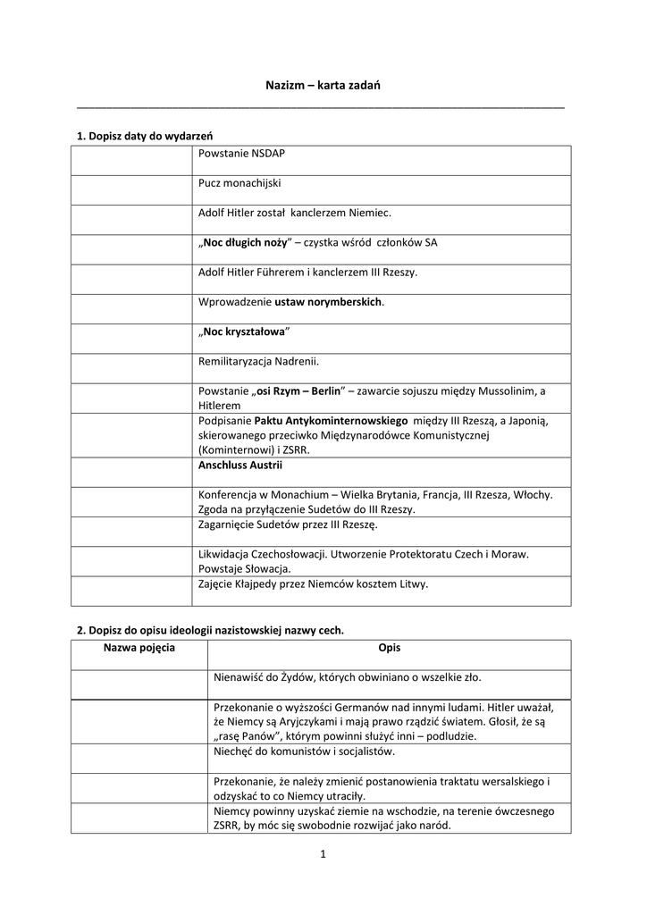 Nazizm – karta zadań __________________________________________________________________________________ 1. Dopisz daty do wydarzeń Powstanie NSDAP Pucz monachijski Adolf Hitler został kanclerzem Niemiec. „Noc długich noży” – czystka wśród członków SA Adolf Hitler Führerem i kanclerzem III Rzeszy. Wprowadzenie ustaw norymberskich. „Noc kryształowa” Remilitaryzacja Nadrenii. Powstanie „osi Rzym – Berlin” – zawarcie sojuszu między Mussolinim, a Hitlerem Podpisanie Paktu Antykominternowskiego między III Rzeszą, a Japonią, skierowanego przeciwko Międzynarodówce Komunistycznej (Kominternowi) i ZSRR. Anschluss Austrii Konferencja w Monachium – Wielka Brytania, Francja, III Rzesza, Włochy. Zgoda na przyłączenie Sudetów do III Rzeszy. Zagarnięcie Sudetów przez III Rzeszę. Likwidacja Czechosłowacji. Utworzenie Protektoratu Czech i Moraw. Powstaje Słowacja. Zajęcie Kłajpedy przez Niemców kosztem Litwy. 2. Dopisz do opisu ideologii nazistowskiej nazwy cech. Nazwa pojęcia Opis Nienawiść do Żydów, których obwiniano o wszelkie zło. Przekonanie o wyższości Germanów nad innymi ludami. Hitler uważał, że Niemcy są Aryjczykami i mają prawo rządzić światem. Głosił, że są „rasę Panów”, którym powinni służyć inni – podludzie. Niechęć do komunistów i socjalistów. Przekonanie, że należy zmienić postanowienia traktatu wersalskiego i odzyskać to co Niemcy utraciły. Niemcy powinny uzyskać ziemie na wschodzie, na terenie ówczesnego ZSRR, by móc się swobodnie rozwijać jako naród. 1 Należy odrodzić Wielką Rzeszę, w której będą mieszkali wszyscy mówiący językiem niemieckim. Hasło" Jeden naród, jedna rzesza, jeden wódz”. 3. Wyjaśnij skróty NSDAP ____________________________________________________________________________ SA ________________________________________________________________________________ SS ________________________________________________________________________________ Gestapo ___________________________________________________________________________ 4. Połącz nazwiska z opisami Imię i nazwisko 1. Adolf Hitler 2. Joseph Goebbels 3. Herman Göring 4. Paul von Hindenburg 5. Ernst Rhöm 6. Heinrich Himmler Opis A. Szef propagandy III Rzeszy B. Przywódca SS. C. Przywódca SA. D. Führer III Rzeszy i przywódca NSDAP E. Prezydent Republiki Weimarskiej. F. Marszałek lotnictwa w III Rzeszy. Prawa ręka Hitlera. 5. Napisz czy zdanie jest prawdziwe czy fałszywe 1. Podpalenie Reichstagu Hitler wykorzystał do ograniczenia praw i wolności obywatelskich oraz do zdelegalizowania partii komunistycznej w Niemczech. 2. Po śmierci Hindenburga Hitler przyjął uprawnienia głowy państwa. 3. Nowe władze zsyłały członków opozycji do nowych obozów koncentracyjnych na podstawie wyroków sądowych. 4. Na podstawie ustaw norymberskich Żydzi zostali pozbawieni obywatelstwa niemieckiego. 5. Ustawy norymberskie były skierowane wyłącznie przeciwko Żydom. 6. Pod względem gospodarczym Hitler po przejęciu władzy doprowadził kraj do ruiny. Zwiększyła się inflacja i bezrobocie. 7. Hitler wprowadził armię poborową i rozpoczął budowę nowoczesnej armii, wyposażonej w nowoczesny sprzęt. 8. Mimo prześladowań w Niemczech działała opozycja, a poparcie społeczne dla Hitlera malało. 6. Wymień osiem działań skierowanych przeciwko Żydom w III Rzeszy ___________________________________________________________________________ ___________________________________________________________________________ ___________________________________________________________________________ ___________________________________________________________________________ ___________________________________________________________________________ ___________________________________________________________________________ ___________________________________________________________________________ ___________________________________________________________________________ 2