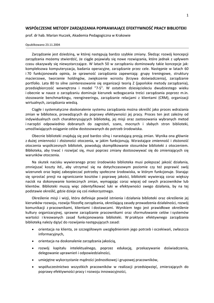 1 WSPÓŁCZESNE METODY ZARZĄDZANIA POPRAWIAJĄCE EFEKTYWNOŚĆ PRACY BIBLIOTEKI prof. dr hab. Marian Huczek, Akademia Pedagogiczna w Krakowie Opublikowano 23.11.2004 Zarządzanie jest dziedziną, w której następują bardzo szybkie zmiany. Śledząc rozwój koncepcji zarządzania możemy stwierdzić, że ciągle pojawiały się nowe rozwiązania, które jednak z upływem czasu okazywały się niewystarczające. W latach 50 w zarządzaniu dominowały takie koncepcje jak: kompleksowa komputeryzacja, badania operacyjne, zarządzanie przez cele. Następnie w latach 60 i 70 funkcjonowała opinia, że sprawność zarządzania zapewniają: grupy treningowe, struktury macierzowe, tworzenie holdingów, zwiększenie wzrostu (krzywa doświadczenia), zarządzanie portfolio. Lata 80 to silne zainteresowanie się organizacji teorią Z (japońskie metody zarządzania), przedsiębiorczość wewnętrzna i model "7-S". W ostatnim dziesięcioleciu dwudziestego wieku i obecnie w nauce o zarządzaniu dominuje kierunek wzbogacania treści zarządzania poprzez m.in. stosowanie benchmarkingu, reengineeringu, zarządzanie relacjami z klientami (CRM), organizacji wirtualnych, zarządzania wiedzą. Ciągłe i systematyczne doskonalenie systemu zarządzania można określić jako proces wdrażania zmian w bibliotece, prowadzących do poprawy efektywności jej pracy. Proces ten jest zależny od indywidualnych cech charakteryzujących bibliotekę, jej misji oraz zastosowania wybranych metod i narzędzi odpowiednio dobranych do zagrożeń, szans, mocnych i słabych stron biblioteki, umożliwiających osiąganie celów dostosowanych do potrzeb środowiska. Obecnie biblioteki znajdują się pod bardzo silną i narastającą presją zmian. Wynika ona głównie z dużej zmienności i złożoności otoczenia, w jakim funkcjonują. Wzrastające zmienność i złożoność otoczenia współczesnych bibliotek, powodują skomplikowanie stosunków biblioteki z otoczeniem. Biblioteka, aby trwać i rozwijać się, musi poprzez zmiany dostosowywać się do zmieniających się warunków otoczenia. Na skutek nacisku wywieranego przez środowisko biblioteka musi polepszać jakość działania, zmniejszać koszty itd., aby utrzymać się na dotychczasowym poziomie czy też poprawić swój wizerunek oraz lepiej zabezpieczać potrzeby społeczne środowiska, w którym funkcjonuje. Starając się sprostać presji na ograniczanie kosztów i poprawę jakości, biblioteki wywierają coraz większy nacisk na dokonywanie koniecznych zmian, wymagając coraz więcej od swych pracowników lub klientów. Biblioteki muszą więc zidentyfikować luki w efektywności swego działania, by na tej podstawie określić, gdzie dzieje się coś niekorzystnego. Określenie misji i wizji, która definiuje powód istnienia i działania biblioteki oraz określenie jej kierunków rozwoju, rozwija filozofię zarządzania, określającą zasady prowadzenia działalności, rozwój komunikacji z pracownikami, klientami i dostawcami. Wynikiem tego jest prawidłowe określenie kultury organizacyjnej, sprawne zarządzanie pracownikami oraz sformułowanie celów i systemów wartości i kreowanych zasad funkcjonowania biblioteki. W praktyce efektywnego zarządzania biblioteką należy dążyć do rozwijania następujących zasad: • orientacja na klienta, ze szczegółowym uwzględnieniem jego potrzeb i oczekiwań, zwłaszcza informacyjnych, • orientacja na doskonalenie zarządzania jakością, • rozwój kapitału intelektualnego, poprzez delegowanie uprawnień i odpowiedzialności, • umiejętne wykorzystanie mądrości jednostkowej i grupowej pracowników, • współuczestnictwo wszystkich pracowników w realizacji przedsięwzięć, zmierzających do poprawy efektywności pracy i rozwoju innowacyjności, edukację, przekazywanie doświadczenia, 2 • orientacja na poprawne prowadzenie procesów, identyfikacja przyczyn mało efektywnego prowadzenia procesu i wyeliminowanie zbędnych operacji, błędów i strat, • orientacja na fakty i konkretne dane oraz informacje poprzez zastosowanie odpowiednich mierników, • doprowadzenie do zaangażowania każdego pracownika biblioteki w trybie indywidualnym i zespołowym do realizacji zadań, wynikających z wprowadzanych zmian, • pozyskiwanie nowych grup klientów, badanie ich potrzeb, promocja biblioteki i jej usług, • nabywanie umiejętności szybkiego przystosowania się do zmian i potrzeb otoczenia, zmiana sposobu myślenia bibliotekarzy i nastawienia do klientów, jako użytkowników warunkujących zasadność istnienia biblioteki, • stosowanie nowych technologii informacyjnych, komputeryzacja bibliotek, dostęp do Internetu, baz danych w sieci, e-książek, gromadzenie informacji na nośnikach elektronicznych, • wprowadzanie nowych metod zarządzania, organizacji i badania procesów pracy. W dalszych rozważaniach zostanie przedstawiona metoda, która w dużym stopniu może ułatwić wprowadzenie zmian i doskonalenie pracy bibliotek. Metodą tą jest benchmarking. Benchmarking jest nowoczesną metodą zarządzania organizacją, która polega na wyborze wzorcowego konkurenta, porównania z nim własnej organizacji i dostosowania do niej analizowanego rozwiązania. Za organizację wzorcową uznaje się tę, która osiąga dużo lepsze wyniki niż analizowana organizacja, przy czym istota polega nie na znajdowaniu i przenoszeniu gotowych wzorców, lecz na sposobie dochodzenia do najlepszych rozwiązań. 1 Według A. Węgrzyna "benchmarking jest ciągłym i systematycznym procesem identyfikowania, analizy, projektowania i w konsekwencji wdrażania lepszych rozwiązań w zakresie procesów, produktów oraz sposobów rozwiązywania problemów i realizacji celów z wykorzystaniem uznanych i sprawdzonych wzorców wewnętrznych i/lub zewnętrznych organizacji, którego rezultatem powinien być wzrost jej efektywności. 2 Działania związane z wykorzystaniem cudzych odkryć i skutecznych praktyk, narodziły s
