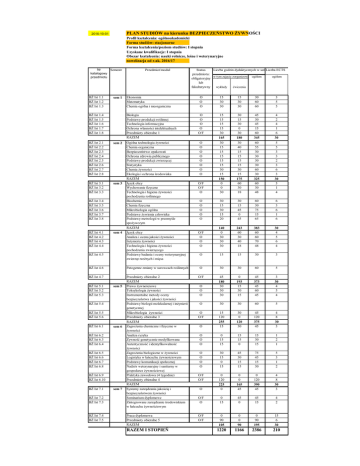 PLAN STUDIÓW na kierunku BEZPIECZEŃSTWO ŻYWNOŚCI 2016-10-01 Profil kształcenia: ogólnoakademicki Forma studiów: stacjonarne Forma kształcenia/poziom studiów: I stopnia Uzyskane kwalifikacje: I stopnia Obszar kształcenia: nauki rolnicze, leśne i weterynaryjne nowelizacja od r.ak. 2016/17 Nr Semestr katalogowy przedmiotu BŻ Ist 1.1 BŻ Ist 1.2 BŻ Ist 1.3 sem 1 BŻ Ist 1.4 BŻ Ist 1.5 BŻ Ist 1.6 BŻ Ist 1.7 BŻ Ist 1.8 Ekonomia Matematyka Chemia ogólna i nieorganiczna Biologia Podstawy produkcji roślinnej Technologia informacyjna Ochrona własności intelektualnych Przedmioty obieralne 1 RAZEM BŻ Ist 2.1 BŻ Ist 2.2 BŻ Ist 2.3 BŻ Ist 2.4 BŻ Ist 2.5 BŻ Ist 2.6 BŻ Ist 2.7 BŻ Ist 2.8 sem 2 BŻ Ist 3.1 BŻ Ist 3.2 BŻ Ist 3.3 sem 3 BŻ Ist 3.4 BŻ Ist 3.5 BŻ Ist 3.6 BŻ Ist 3.7 BŻ Ist 3.8 BŻ Ist 4.1 BŻ Ist 4.2 BŻ Ist 4.3 BŻ Ist 4.4 Przedmiot/moduł sem 4 BŻ Ist 4.5 Ogólna technologia żywności Chemia organiczna Bezpieczeństwo opakowań Ochrona zdrowia publicznego Podstawy produkcji zwierzęcej Statystyka Chemia żywności Ekologia i ochrona środowiska RAZEM Język obcy Wychowanie fizyczne Technologia i higiena żywności pochodzenia roślinnego Biochemia Chemia fizyczna Mikrobiologia ogólna Podstawy żywienia człowieka Podstawy metrologii w przemyśle spożywczym RAZEM Język obcy Analiza i ocena jakości żywności Inżynieria żywności Technologia i higiena żywności pochodzenia zwierzęcego Podstawy badania i oceny weterynaryjnej zwierząt rzeźnych i mięsa Status Liczba godzin dydaktycznych w semestrze: Liczba ECTS przedmiotu: w tym zajęcia zorganizowane:ogółem ogółem obligatoryjny lub wykłady ćwiczenia fakultatywny O O O 15 30 30 15 30 30 30 60 60 3 5 5 O O O O O/F 15 15 15 15 30 165 30 15 30 0 30 180 45 30 45 15 60 345 4 2 4 1 6 30 O O O O O O O O O/F O/F O 30 15 15 15 15 15 30 15 150 0 0 30 30 40 15 15 15 15 30 15 175 60 30 18 60 55 30 30 30 30 60 30 325 60 30 48 5 5 3 3 2 3 6 3 30 3 1 4 O O O O O 30 15 30 15 20 30 15 45 0 45 60 30 75 15 65 6 3 6 1 6 O/F O O O 140 0 30 30 30 243 60 30 40 18 383 60 60 70 48 30 4 5 6 4 O 15 15 30 3 BŻ Ist 4.6 Patogenne zmiany w surowcach roślinnych O 30 30 60 5 BŻ Ist 4.7 Przedmioty obieralne 2 RAZEM Prawo żywnościowe Toksykologia żywności Instrumentalne metody oceny bezpieczeństwa i jakości żywności Podstawy biologii molekularnej i inżynierii genetycznej Mikrobiologia żywności Przedmioty obieralne 3 RAZEM Zagrożenia chemiczne i fizyczne w żywności Analiza ryzyka Żywność genetycznie modyfikowana Autentyczność i identyfikowalność żywności Zagrożenia biologiczne w żywności Logistyka w łańcuchu żywnościowym Podstawy komunikacji społecznej Nadzór weterynaryjny i sanitarny w gospodarce żywnościowej Praktyka zawodowa (4 tygodnie) Przedmioty obieralne 4 RAZEM Systemy zarządzania jakością i bezpieczeństwem żywności Seminarium dyplomowe Zintegrowane zarządzanie środowiskiem w łańcuchu żywnościowym O/F O O O 45 180 30 30 30 0 193 15 30 15 45 373 45 60 45 3 30 4 5 4 O 30 30 60 5 O O/F O 15 120 255 15 30 0 120 30 45 120 375 45 4 8 30 3 O O O 0 15 15 15 15 0 15 30 15 1 2 1 O O O O 30 15 0 15 45 30 15 15 75 45 15 30 5 3 1 2 O/F O/F O 0 120 225 0 0 0 165 45 0 120 390 45 4 8 30 3 O/F O 0 15 45 0 45 15 4 2 Praca dyplomowa Przedmioty obieralne 5 RAZEM O/F O/F 0 90 105 0 0 90 0 90 195 15 6 30 1220 1166 2386 210 BŻ Ist 5.1 BŻ Ist 5.2 BŻ Ist 5.3 sem 5 BŻ Ist 5.4 BŻ Ist 5.5 BŻ Ist 5.6 BŻ Ist 6.1 sem 6 BŻ Ist 6.2 BŻ Ist 6.3 BŻ Ist 6.4 BŻ Ist 6.5 BŻ Ist 6.6 BŻ Ist 6.7 BŻ Ist 6.8 BŻ Ist 6.9 BŻ Ist 6.10 BŻ Ist 7.1 BŻ Ist 7.2 BŻ Ist 7.3 BŻ Ist 7.4 BŻ Ist 7.5 sem 7 RAZEM I STOPIEŃ