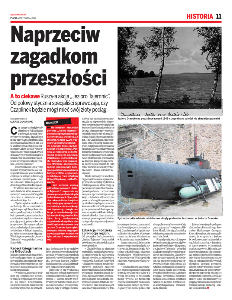 HISTORIA 11 GŁOS DRAWSKA PIĄTEK, 22 STYCZNIA, 2016 Naprzeciw zagadkom przeszłości ŁUKASZ GŁADYSIAK C RUSZA AKCJA zy drugie co do głębokości jezioro w Polsce i jedna z głównych atrakcji turystycznych powiatu drawskiego może przyciągnąć miłośników historycznych zagadek, tak jak w Wałbrzychu uczynił to domniemany „złoty pociąg”? Odpowiedź na to i wiele innych pytań dotyczących przeszłości regionu udzielić ma uruchomiony w połowie stycznia projekt pod tytułem „Jezioro Tajemnic”. - Jezioro Drawsko to nie tylko miejsce wypoczynkowe, ale także punkt na mapie województwa czy kraju, w którym ludzie mogą realizować rozmaite pasje – mówi „Głosowi” starosta powiatu drawskiego Stanisław Kuczyński. To właśnie starostwo zainicjowało działania, które, w co warto uwierzyć, mają wyjaśnić zagadki związane z akwenem o powierzchni 1,8 tys. ha. – Tych zagadek ewidentnie nie brakuje. Dla nas materiałem wyjściowym są kilkupokoleniowe już przekazy, których źródłem byli z pewnością jeszcze niemieccy mieszkańcy tych terenów oraz pracujący tutaj, polscy robotnicy przymusowi. Na naszym celowniku znalazły się także materiały archiwalne, w Polsce i zagranicą, po które zamierzamy sięgnąć. Właśnie po to powstało „Jezioro Tajemnic” – uzupełnia starosta Kuczyński. aa Na temat idei i kierunków projektu „Jezioro Tajemnic” posłuchać i podyskutować będzie można już w sobotę, 23 stycznia. O godz. 10.00, w Liceum Ogólnokształcącycm im. 3. Dywizji Strzelców Karpackich w Czaplinku (ul. Parkowa 2) rozpocznie się konferencja popularno-naukowa. Udział w niej weźmie kilkunastu historyków oraz muzealników z Pomorza i Wielkopolski. Wykład inauguracyjny dotyczący południowego wybrzeża Bałtyku w 1945 r. wygłosi prof. dr hab. Maciej Franz z Zakładu Historii Wojskowej UAM w Poznaniu. aa Już wczesną wiosną w Czaplinku, w ramach „Jeziora Tajemnic” rozpocznie się pierwszy etap profesjonalnych badań terenowych. Specjaliści w zakresie historii wojskowej, medycyny sądowej oraz muzealnicy w pierwszej kolejności sprawdzą, co ukryte może być na terenie dawnej szkoły kadetów Kriegsmarine. Kolejną fazę, zaplanowaną na przełomie wiosny i lata, stanowić będzie skanowanie dna Jeziora Drawsko i początek tworzenia lokalnej mapy spoczywających tam wraków nie tylko z okresu II wojny światowej. Kadeci Kriegsmarine na U-Bootach jąc z dochodzącej do 90 m głębokości akwenu, prowadzono i ćwiczenia z wykorzystaniem takich jednostek – mówi Robert Patrzyński, dyrektor Liceum Ogólnokształcącego im. 3. Dywizji Strzelców Karpackich w Czaplinku. Hipotezy tej nie wykluczają też badacze, których zaproszono do realizacji projektu „Jezioro Tajemnic”. – Wiemy, że testy choćby okrętów typu Seehund, które w czasie ostatniej wojny produkowane były w Elblągu, nie mu- Jednym z pierwszych zagadnień, którym chcą przyjrzeć się uczestnicy projektu, jest legenda o zatopionych w Jeziorze Drawsko, niemieckich miniaturowych okrętach podwodnych. – W miejscu, gdzie dziś znajduje się czaplineckie liceum, w czasie II wojny światowej szkolili się kadeci Kriegsmarine. Na pewno była tutaj strzelnica; nie możemy wykluczyć, że korzysta- siałyby być prowadzone na morzu, ale na odpowiednio obszernym powierzchniowo i głębokim jeziorze. Drawsko nadawałoby się do tego nie najgorzej – wnioskuje Rafał Semołonik z koszalińskiego Studio Historycznego Huzar. – Za Czaplinkiem, jako miejscem szkoleń załóg miniaturowych okrętów może przemawiać fakt chęci ukrycia rzeczywistych zamiarów marynarki wojennej III Rzeszy pod płaszczykiem działalności sportowej czy rekreacyjnej. W dawnym Tempelburgu, bo taką nazwę nosiło miasto do 1945 roku, warunki ku temu były bardzo dobre – dodaje Stanisław Kuczyński. Warto zaznaczyć, że wyobraźnię pomysłodawców opisywanego projektu rozpaliły wydarzenia ostatniego czasu, które zdają się potwierdzać nawet bardzo nieprawdopodobne scenariusze związane z przeszłością naszego kraju. – Zaledwie kilka dni temu przeczytać mogliśmy o do tej pory niezbadanych podziemiach kościoła w Brześciu Kujawskim, gdzie prawdopodobnie spoczywają szczątki matki króla Władysława Łokietka. I tam postanowiono po prostu sprawdzić lokalną legendę – argumentuje starosta drawski. Edukacja młodzieży i promocja regionu Od początku funkcjonowania „Jeziora Tajemnic” duży nacisk położony został na edukacyjny walor projektu. – Chcielibyśmy po pierwsze rozbudzić u mieszkańców powiatu zamiłowanie do odkrywania historii terenów, na których żyją – podkreśla Stanisław Kuczyński. – Zdaję sobie sprawę, że wiele domowych archiwów mogłoby zawstydzić właścicieli nawet największych, profesjonalnych kolekcji. Nie wyobrażam sobie dalszych działań bez udziału społeczności lokalnej. O tym, że warto to robić, przekonać mają ich uczestnicy zaplanowanej w dniu Jezioro Drawsko na pocztówce sprzed 1945 r. Jego dna w całości nie zbadał jeszcze nikt FOT. DOMENA PUBLICZNA [email protected] FOT. ZBIORY PRYWATNE A to ciekawe Ruszyła akcja „Jezioro Tajemnic”. Od połowy stycznia specjaliści sprawdzają, czy Czaplinek będzie mógł mieć swój złoty pociąg. Być może takie właśnie miniaturowe okręty podwodne testowano w Jeziorze Drawsko jutrzejszym (sobota, 23 stycznia) konferencji popularno-naukowej. Czaplinek gościć będzie specjalistów-historyków z Uniwersytetu im. Adama Mickiewicza w Poznaniu oraz muzealników. Warto zaznaczyć, że już teraz partnerem przedsięwzięcia zostały m.in. Muzeum Oręża Polskiego w Kołobrzegu, Muzeum Powstańców Wielkopolskich w Lusowie oraz Wielkopolskie Muzeum Niepodległości w Poznaniu. – Moim zdaniem czaplineckie, czy patrząc szerzej: drawskie legendy związane nie tylko z II wojną światową to doskonały punkt wyjścia do tworzenia choćby lokalnej izby muzealnej. Tak
