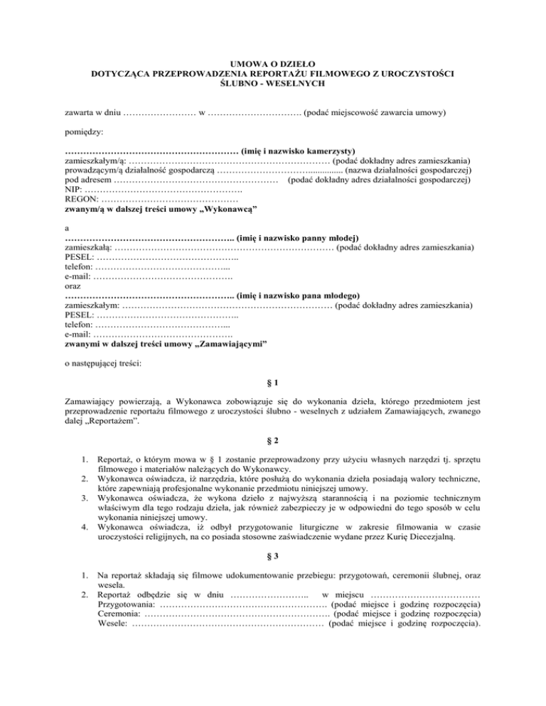 UMOWA O DZIEŁO DOTYCZĄCA PRZEPROWADZENIA REPORTAŻU FILMOWEGO Z UROCZYSTOŚCI ŚLUBNO - WESELNYCH zawarta w dniu …………………… w …………………………. (podać miejscowość zawarcia umowy) pomiędzy: ………………………………………………… (imię i nazwisko kamerzysty) zamieszkałym/ą: ………………………………………………………… (podać dokładny adres zamieszkania) prowadzącym/ą działalność gospodarczą …………………………............... (nazwa działalności gospodarczej) pod adresem ……………………………………………… (podać dokładny adres działalności gospodarczej) NIP: ……………………………………………. REGON: ……………………………………… zwanym/ą w dalszej treści umowy „Wykonawcą” a ……………………………………………….. (imię i nazwisko panny młodej) zamieszkałą: ……………………………………………………………… (podać dokładny adres zamieszkania) PESEL: ……………………………………….. telefon: ……………………………………... e-mail: ………………………………………. oraz ……………………………………………….. (imię i nazwisko pana młodego) zamieszkałym: …………………………………………………………… (podać dokładny adres zamieszkania) PESEL: ……………………………………….. telefon: ……………………………………... e-mail: ………………………………………. zwanymi w dalszej treści umowy „Zamawiającymi” o następującej treści: §1 Zamawiający powierzają, a Wykonawca zobowiązuje się do wykonania dzieła, którego przedmiotem jest przeprowadzenie reportażu filmowego z uroczystości ślubno - weselnych z udziałem Zamawiających, zwanego dalej „Reportażem”. §2 1. Reportaż, o którym mowa w § 1 zostanie przeprowadzony przy użyciu własnych narzędzi tj. sprzętu filmowego i materiałów należących do Wykonawcy. 2. Wykonawca oświadcza, iż narzędzia, które posłużą do wykonania dzieła posiadają walory techniczne, które zapewniają profesjonalne wykonanie przedmiotu niniejszej umowy. 3. Wykonawca oświadcza, że wykona dzieło z najwyższą starannością i na poziomie technicznym właściwym dla tego rodzaju dzieła, jak również zabezpieczy je w odpowiedni do tego sposób w celu wykonania niniejszej umowy. 4. Wykonawca oświadcza, iż odbył przygotowanie liturgiczne w zakresie filmowania w czasie uroczystości religijnych, na co posiada stosowne zaświadczenie wydane przez Kurię Diecezjalną. §3 1. Na reportaż składają się filmowe udokumentowanie przebiegu: przygotowań, ceremonii ślubnej, oraz wesela. 2. Reportaż odbędzie się w dniu …………………….. w miejscu ……………………………… Przygotowania: ………………………………………………. (podać miejsce i godzinę rozpoczęcia) Ceremonia: ……………………………………………………. (podać miejsce i godzinę rozpoczęcia) Wesele: ……………………………………………………… (podać miejsce i godzinę rozpoczęcia). 3. Efektem przeprowadzonego Reportażu będzie film trwający ………………. godzin, który następnie po poddaniu profesjonalnej obróbce artystycznej zostanie umieszczony na płycie DVD. Zamawiający otrzymają od Wykonawcy oryginał płyty DVD oraz dwie kopie. §4 1. Odbiór dzieła nastąpi w miejscu prowadzenia działalności Wykonawcy. Inny sposób odbioru dzieła możliwy jest po ustaleniu pomiędzy Stronami. 2. Termin odbioru dzieła strony ustalają na dzień ……………………………….. . §5 1. Za wykonanie dzieła Zamawiający zobowiązują się do zapłaty na rzecz Wykonawcy wynagrodzenia w wysokości .......................................................................................................... złotych brutto (słownie: .................................................................................................................................................................). Wynagrodzenie płatne jest gotówką/przelewem na podane przez Wykonawcę konto bankowe (nr konta ...................................................................................................) nie później niż przy odbiorze przez Zamawiających dzieła. 2. Zamawiający zobowiązują się do wpłacenia na rzecz Wykonawcy zadatku w kwocie ........................... złotych (słownie: .......................................................................................) gotówką/przelewem na podane przez Wykonawcę konto bankowe (nr konta.................................................................................). Wykonawca potwierdza w formie pisemnej wpłatę zadatku. Zadatek płatny jest przy podpisaniu niniejszej umowy. §6 1. Wykonawca wyraża zgodę na obecność podczas uroczystości ślubno - weselnych Zamawiających innych kamerzystów, w tym amatorów. 2. Wykonawca zachowa na swój użytek, w szczególności dla celów swojej reklamy i promocji, film wykonany dla Zamawiających, jednakże wykorzystanie dzieła przez Wykonawcę w materiałach reklamujących działalność Wykonawcy możliwe jest wyłącznie po uzyskaniu każdorazowej zgody przez Zamawiających. Z tytułu wykorzystania dzieła w materiałach reklamujących działalność Wykonawcy, Zamawiający nie posiadają żadnych roszczeń finansowych. §7 W razie niewykonania lub nienależytego wykonania niniejszej umowy przez Wykonawcę, Zamawiającym przysługuje kara umowna w wysokości ........................ złotych. §8 1. Każda ze stron może jednostronnie odstąpić od niniejszej umowy, bez podania przyczyny, nie później jednak niż na 1 miesiąc przed dniem, o którym mowa w § 3 ust. 2. W przypadku odstąpienia od umowy przez Zamawiających, Wykonawca ma prawo zachować dany mu 