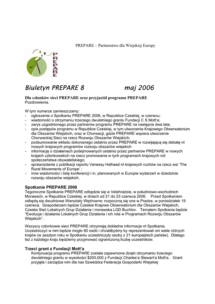 PREPARE – Partnerstwo dla Wiejskiej Europy Biuletyn PREPARE 8 maj 2006 Dla członków sieci PREPARE oraz przyjaciół programu PREPARE Pozdrowienia. W tym numerze zamieszczamy: - ogłoszenie o Spotkaniu PREPARE 2006, w Republice Czeskiej, w czerwcu; - wiadomość o otrzymaniu trzeciego dwuletniego grantu Fundacji C S Mott’a; - zarys uzgodnionego przez partnerów programu PREPARE na następne dwa lata; - opis postępów programu w Republice Czeskiej, w tym utworzenia Krajowego Obserwatorium dla Obszarów Wiejskich, oraz w Chorwacji, gdzie PREPARE wspiera utworzenie Chorwackiej Sieci na rzecz Rozwoju Obszarów Wiejskich; - podsumowanie wkładu dokonanego ostatnio przez PREPARE w rozwijającą się debatę nt nowych krajowych programów rozwoju obszarów wiejskich - informację o działaniach podejmowanych ostatnio przez partnerów PREPARE w nowych krajach członkowskich na rzecz promowania w tych programach krajowych roli społeczeństwa obywatelskiego; - sprawozdanie z publikacji raportu Vanessy Halhead nt krajowych ruchów na rzecz wsi ‘The Rural Movements of Europe’ ; - inne wiadomości i listę konferencji i in. planowanych w Europie wydarzeń w dziedzinie rozwoju obszarów wiejskich. Spotkanie PREPARE 2006 Tegoroczne Spotkanie PREPARE odbędzie się w Velehradzie, w południowo-wschodnich Morawach, w Republice Czeskiej, w dniach od 21 do 23 czerwca 2006. Przed Spotkaniem odbędą się dwudniowe Warsztaty Wędrowne: rozpoczną się one w Pradze, w poniedziałek 19 czerwca. Gospodarzem będzie Czeskie Krajowe Obserwatorium dla Obszarów Wiejskich, Czeska Sieć Lokalnych Grup Działania i morawska LGD Buchlov. Tematem Spotkania będzie “Ewolucja i działania Lokalnych Grup Działania i ich rola w Programach Rozwoju Obszarów Wiejskich”. Wszyscy członkowie sieci PREPARE otrzymają dokładne informacje nt Spotkania. Uczestniczyć w nim będzie mogło 80 osób i chcielibyśmy by reprezentowali oni wiele różnych krajów (w zeszłym roku w Spotkaniu uczestniczyły osoby z 21 europejskich państw). Dlatego też z każdego kraju będziemy przyjmować ograniczoną liczbę uczestników. Trzeci grant z Fundacji Mott’a Kontynuacja programu PREPARE została zapewniona dzięki otrzymaniu trzeciego dwuletniego grantu w wysokości $200,000 z Fundacji Charles’a Stewart’a Mott’a. Grant przyjęła i zarządza nim dla nas Szwedzka Federacja Gospodarki Wiejskiej i Stowarzyszeń Rolniczych (partner PREPARE). Jesteśmy bardzo wdzięczni Fundacji Mott’a za dalsze zaufanie. Program PREPARE od 2006 do 2008 Planując dalsze działania, partnerzy PREPARE zgodzili się, że celem wspólnego programu powinno być nadal wzmacnianie społeczeństwa obywatelskiego i promowanie międzynarodowej wymiany w dziedzinie rozwoju obszarów wiejskich, zwłaszcza w krajach Centralnej i Wschodniej Europy. Dążymy do promowania dialogu, wzajemnego zaufania i współpracy między lokalnymi organizacjami, rządami i wszystkimi interesariuszami rozwoju obszarów wiejskich, na wszystkich poziomach w sensie geograficznym. Pragniemy by społeczności wiejskie miały możliwości uczestniczenia w podejmowaniu decyzji związanych ze zrównoważonym rozwojem obszarów wiejskich. Partnerzy zgodnie określili następujące priorytety na okres 2006-2008 : a. Działania międzynarodowe, dotyczące całej naszej sieci. Obejmować one mogą Spotkania międzynarodowe, warsztaty wędrowne, seminaria, programy szkoleniowe i in., służące promowaniu wymiany pomysłów i wzajemnemu wspieraniu się ludzi zaangażowanych w rozwój obszarów wiejskich i działania na rzecz rozwoju społeczeństwa obywatelskiego we wszystkich lub wielu spośród krajów wymienionych poniżej. b. Wspieranie działań na rzecz wzmocnienia społeczeństwa obywatelskiego w poszczególnych krajach. Chcemy przyczyniać się do wzmocnienia społeczeństwa obywatelskiego i powstawania krajowych ruchów wiejskich i sieci w nowych krajach członkowskich UE, w krajach kandydackich i w krajach sąsiadujących z UE. Priorytetowo traktujemy : Kraje kandydackie – Rumunia, Bułgaria, Chorwacja i Macedonia; Kraje będące nowymi sąsiadami UE - Albania, Bośnia i Hercegowina, Serbia-Czarnogóra, Ukraina, Białoruś, Kaliningrad (Rosja) i Turcja Czekamy na wnioski o wsparcie dla projektów służących realizacji naszych celów i priorytetów. Wsparcie PREPARE dla projektów dotyczących wzmacniania społeczeństwa obywatelskiego w jednym z tych krajów będzie obejmowało pomoc finansową z reguły do maksimum $5,000 jako środków „na rozruch”, plus doradztwo i pomoc w zdobyciu funduszy z innych źródeł. c. Wspieranie organizacji partnerskich i nowych sieci krajowych. Chcemy pomóc naszym organizacjom partnerskim oraz nowoutworzonym i nowopowstającym krajowym sieciom w innych krajach Europy Centralnej w budowaniu potencjału i umiejętności działania i we wzmacnianiu i promowaniu w swoich krajach roli społeczeństwa obywatelskiego. Skupimy się na : krajach partnerskich PREPARE - Estonii, Finlandii, Węgrzech, Litwie, Polsce, Słowacji, Słowenii i Szwecji innych sieciach krajowych – w Chorwacji, Republice Czeskiej, Łotwie. Republika Czeska W zeszłym roku PREPARE przekazało 12,000 euro na pokrycie kosztów programu szkolenia animatorów Lokalnych Grup Działania, zorganizowanego przez dwie organizacje pozarządowe, Omega Liberec i CpKp (Centrum na rzecz Organizowania Społeczności). Program ten i związane z nim działania podejmowane przez te dwie i inne organizacje, tworzy silną sieć lokalnych grup działania i stałe wzmocnienie społeczeństwa obywatelskiego. Istotnym elementem rozwoju ruchu na rzecz wsi stało się (utworzone przez 12 osób) Krajowe Obserwatorium dla Obszarów Wiejskich, z którym związana jest szybko rosnąca sieć LGD typu LEADER. Obserwatorium ma dobre kontakty z istniejącym już wcześniej Stowarzyszeniem Odnowy Wsi, którego większość członków to burmistrze i wójtowie. Obserwatorium i Sieć LGD będą gos