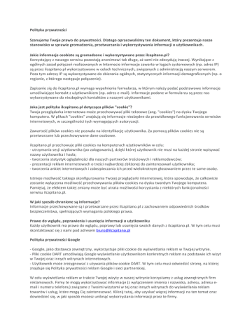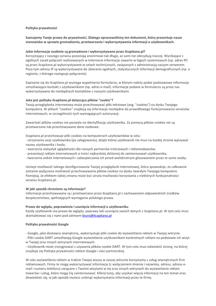Polityka prywatności Szanujemy Twoje prawo do prywatności. Dlatego opracowaliśmy ten dokument, który prezentuje nasze stanowisko w sprawie gromadzenia, przetwarzania i wykorzystywania informacji o użytkownikach. Jakie informacje osobiste są gromadzone i wykorzystywane przez ilcapitano.pl? Korzystający z naszego serwisu pozostają anonimowi tak długo, aż sami nie zdecydują inaczej. Wynikające z ogólnych zasad połączeń realizowanych w Internecie informacje zawarte w logach systemowych (np. adres IP) są przez ilcapitano.pl wykorzystywane w celach technicznych, związanych z administracją naszym serwerem. Poza tym adresy IP są wykorzystywane do zbierania ogólnych, statystycznych informacji demograficznych (np. o regionie, z którego następuje połączenie). Zapisanie się do ilcapitano.pl wymaga wypełnienia formularza, w którym należy podać podstawowe informacje umożliwiające kontakt z użytkownikiem (np. adres e-mail). Informacje podane w formularzu są przez nas wykorzystywane do niezbędnych kontaktów z naszymi użytkownikami. Jaka jest polityka ilcapitano.pl dotycząca plików "cookie"? Twoja przeglądarka internetowa może przechowywać pliki tekstowe (ang. "cookies") na dysku Twojego komputera. W plikach "cookies" znajdują się informacje niezbędne do prawidłowego funkcjonowania serwisów internetowych, w szczególności tych wymagających autoryzacji. Zawartość plików cookies nie pozwala na identyfikację użytkownika. Za pomocą plików cookies nie są przetwarzane lub przechowywane dane osobowe. ilcapitano.pl przechowuje pliki cookies na komputerach użytkowników w celu: - utrzymania sesji użytkownika (po zalogowaniu), dzięki której użytkownik nie musi na każdej stronie wpisywać nazwy użytkownika i hasła; - tworzenia statystyk oglądalności dla naszych partnerów treściowych i reklamodawców; - prezentacji reklam internetowych o treści najbardziej zbliżonej do zainteresowań użytkownika; - tworzenia ankiet internetowych i zabezpieczania ich przed wielokrotnym głosowaniem przez te same osoby. Istnieje możliwość takiego skonfigurowania Twojej przeglądarki internetowej, która spowoduje, że całkowicie zostanie wyłączona możliwość przechowywania plików cookies na dysku twardym Twojego komputera. Pamiętaj, że efektem takiej zmiany może być utrata możliwości korzystania z niektórych funkcjonalności serwisu ilcapitano.pl. W jaki sposób chronione są informacje? Informacje przechowywane są i przetwarzane przez ilcapitano.pl z zachowaniem odpowiednich środków bezpieczeństwa, spełniających wymagania polskiego prawa. Prawo do wglądu, poprawienia i usunięcia informacji o użytkowniku Każdy użytkownik ma prawo do wglądu, poprawy lub usunięcia swoich danych z ilcapitano.pl. W tym celu musi skontaktować się z nami pod adresem [email protected] Polityka prywatności Google - Google, jako dostawca zewnętrzny, wykorzystuje pliki cookie do wyświetlania reklam w Twojej witrynie. - Pliki cookie DART umożliwiają Google wyświetlanie użytkownikom konkretnych reklam na podstawie ich wizyt w Twojej oraz innych witrynach internetowych. - Użytkownik może zrezygnować z używania plików cookie DART. W tym celu musi odwiedzić stronę, na której znajduje się Polityka prywatności reklam Google i sieci partnerskiej. W celu wyświetlania reklam w trakcie Twojej wizyty w naszej witrynie korzystamy z usług zewnętrznych firm reklamowych. Firmy te mogą wykorzystywać informacje (z wyłączeniem imienia i nazwiska, adresu, adresu email i numeru telefonu) związane z Twoimi wizytami w tej oraz innych witrynach do wyświetlania reklam towarów i usług, które mogą Cię zainteresować. Kliknij tutaj, aby uzyskać więcej informacji na ten temat oraz dowiedzieć się, w jaki sposób możesz uniknąć wykorzystania informacji przez te firmy.
