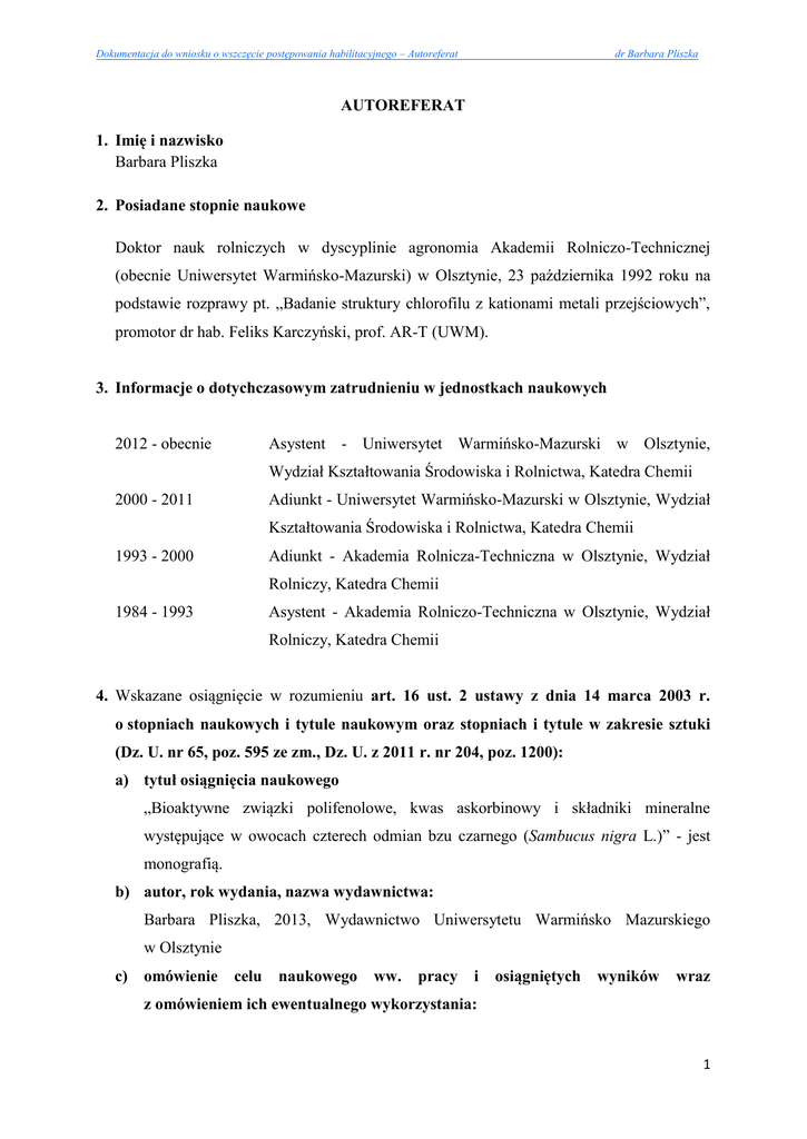 Dokumentacja do wniosku o wszczęcie postępowania habilitacyjnego – Autoreferat dr Barbara Pliszka AUTOREFERAT 1. Imię i nazwisko Barbara Pliszka 2. Posiadane stopnie naukowe Doktor nauk rolniczych w dyscyplinie agronomia Akademii Rolniczo-Technicznej (obecnie Uniwersytet Warmińsko-Mazurski) w Olsztynie, 23 października 1992 roku na podstawie rozprawy pt. „Badanie struktury chlorofilu z kationami metali przejściowych”, promotor dr hab. Feliks Karczyński, prof. AR-T (UWM). 3. Informacje o dotychczasowym zatrudnieniu w jednostkach naukowych Asystent - Uniwersytet Warmińsko-Mazurski w Olsztynie, 2012 - obecnie Wydział Kształtowania Środowiska i Rolnictwa, Katedra Chemii Adiunkt - Uniwersytet Warmińsko-Mazurski w Olsztynie, Wydział 2000 - 2011 Kształtowania Środowiska i Rolnictwa, Katedra Chemii Adiunkt - Akademia Rolnicza-Techniczna w Olsztynie, Wydział 1993 - 2000 Rolniczy, Katedra Chemii Asystent - Akademia Rolniczo-Techniczna w Olsztynie, Wydział 1984 - 1993 Rolniczy, Katedra Chemii 4. Wskazane osiągnięcie w rozumieniu art. 16 ust. 2 ustawy z dnia 14 marca 2003 r. o stopniach naukowych i tytule naukowym oraz stopniach i tytule w zakresie sztuki (Dz. U. nr 65, poz. 595 ze zm., Dz. U. z 2011 r. nr 204, poz. 1200): a) tytuł osiągnięcia naukowego „Bioaktywne związki polifenolowe, kwas askorbinowy i składniki mineralne występujące w owocach czterech odmian bzu czarnego (Sambucus nigra L.)” - jest monografią. b) autor, rok wydania, nazwa wydawnictwa: Barbara Pliszka, 2013, Wydawnictwo Uniwersytetu Warmińsko Mazurskiego w Olsztynie c) omówienie celu naukowego ww. pracy i osiągniętych wyników wraz z omówieniem ich ewentualnego wykorzystania: 1 Dokumentacja do wniosku o wszczęcie postępowania habilitacyjnego – Autoreferat dr Barbara Pliszka Wprowadzenie Bez czarny jest rośliną uprawianą w Danii, Niemczech, Rumunii, Słowacji i USA. Natomiast w Polsce jest jeszcze mało rozpowszechniony, a dotychczasowe badania nad nim mają charakter fragmentaryczny. Istnieje więc potrzeba wzbogacenia tej wiedzy, ponieważ bez czarny w przyszłości może uzupełnić asortyment roślin uprawianych w ogrodnictwie. Zawartość związków polifenolowych, kwasu askorbinowego i składników mineralnych występujących w owocach bzu czarnego zależy od wielu czynników: warunków przyrodniczych i glebowych, technologii uprawy (zabiegów agrotechnicznych, odmiany) oraz sposobu przechowywania i przetwarzania surowca. Przemysł farmaceutyczny, spożywczy i przechowalnictwo oczekuje szczegółowej wiedzy na temat właściwości fizykochemicznych ekstraktów z owoców bzu czarnego, ich jakości mikrobiologicznej oraz stabilności antocyjanów w ekstraktach. Ponadto dąży się do tego, aby zawartość antocyjanów była stabilna w czasie przetwarzania surowca. W dostępnej literaturze mało jest też informacji na temat zależności między zawartością związków polifenolowych i kwasu askorbinowego a właściwościami przeciwutleniającymi owoców oraz zależności między zawartością związków polifenolowych a zawartością składników mineralnych w owocach bzu czarnego. Publikacja jest próbą poszerzenia wiedzy na temat związków i składników biologicznie aktywnych, występujących w owocach bzu czarnego. Badania przedstawione w pracy miały na celu: ocenę zawartości związków polifenolowych, kwasu askorbinowego i składników mineralnych w owocach bzu czarnego oraz właściwości przeciwutleniających owoców, z uwzględnieniem wpływu warunków atmosferycznych, stanowiska uprawy i odmiany, analizę stabilności antocyjanów w ekstraktach i jakości mikrobiologicznej ekstraktów z owoców bzu czarnego, określenie zależności między zawartością związków polifenolowych i kwasu askorbinowego a właściwościami przeciwutleniającymi owoców oraz zależności między zawartością związków polifenolowych a zawartością składników mineralnych (Ca, Mg, Zn i Fe) w owocach bzu czarnego. 2 Dokumentacja do wniosku o wszczęcie postępowania habilitacyjnego – Autoreferat dr Barbara Pliszka Część teoretyczna Na początku tej części publikacji opisano reaktywne formy tlenu (RFT) i reaktywne formy azotu (RFA), a szczególnie niebezpieczne dla organizmu wolne rodniki. Wolne rodniki są bardzo reaktywne i na ogół „żyją” przez ułamek sekundy, reagując z białkami czy lipidami powodują zmiany w strukturze komórek i tkanek. Powstają pod wpływem różnych czynników środowiska. Chociaż organizm człowieka ma własny system obrony przed wolnymi rodnikami (enzymy antyoksydacyjne), to jednak musi być wzmacniany przez antyoksydanty pochodzące z żywności, np. związki polifenolowe występujące w owocach i warzywach. W kolejnej części pracy scharakteryzowano związki polifenolowe określane jako naturalne substancje nieodżywcze (NSN), powstałe w wyniku wyspecjalizowanej przemiany materii. Zadaniem ich jest ochrona gatunków przed czynnikami zagrażającymi ich przetrwaniu w niesprzyjających warunkach. Szczególną uwagę zwrócono na antocyjany jako jedną z największych i najważniejszych grup barwników roślinnych, która występuje w kwiatach, owocach i warzywach. Opisano właściwości antocyjanów, ich stabilność i zastosowanie jako naturalne barwniki spożywcze (E 163). Omówiono również inną ważną grupę związków polifenolowych - kwasy fenolowe, które m.in. pełnią ważną funkcję ochronną w okresie wzrostu i dojrzewania ziaren oraz owoców, aż do ich dojrzałości konsumpcyjnej. W organizmie człowieka wykazują zróżnicowaną aktywność biologiczną. Wyjaśniono na czym polega aktywność przeciwutleniająca, jaką wykazują związki polifenolowe w roślinach, i od czego ona zależy. Różnice we właściwościach przeciwutleniających zależą głównie od struktury związków polifenolowych, ich zawartości, oraz wzajemnego oddziaływania. Podkreślono w pracy, że ekstrakty otrzymane z owoców mają na ogół 