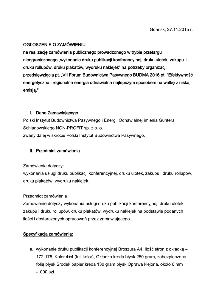 Gdańsk, 27.11.2015 r. OGŁOSZENIE O ZAMÓWIENIU na realizację zamówienia publicznego prowadzonego w trybie przetargu nieograniczonego „wykonanie druku publikacji konferencyjnej, druku ulotek, zakupu i druku rollupów, druku plakatów, wydruku naklejek” na potrzeby organizacji przedsięwzięcia pt. „VII Forum Budownictwa Pasywnego BUDMA 2016 pt. "Efektywność energetyczna i regionalna energia odnawialna najlepszym sposobem na walkę z niską emisją." I. Dane Zamawiającego Polski Instytut Budownictwa Pasywnego i Energii Odnawialnej imienia Güntera Schlagowskiego NON-PROFIT sp. z o. o. zwany dalej w skrócie Polski Instytut Budownictwa Pasywnego. II. Przedmiot zamówienia Zamówienie dotyczy: wykonania usługi druku publikacji konferencyjnej, druku ulotek, zakupu i druku rollupów, druku plakatów, wydruku naklejek. Przedmiot zamówienia Zamówienie dotyczy wykonania usługi druku publikacji konferencyjnej, druku ulotek, zakupu i druku rollupów, druku plakatów, wydruku naklejek na podstawie podanych ilości i dostarczonych opracowań przez zamawiającego . Specyfikacja zamówienia: a. wykonanie druku publikacji konferencyjnej Broszura A4, Ilość stron z okładką – 172-175, Kolor 4+4 (full kolor), Okładka kreda błysk 250 gram, zabezpieczona folią błysk Środek papier kreda 130 gram błysk Oprawa klejona, około 6 mm -1000 szt., b. wykonanie druku ulotek A4, składanych do DL, papier 170 gram – 1000 szt., c. wykonanie druku rollupów ekonomicznych 85 cm - 4 szt., d. wykonanie druku plakatów format A1 – 20 szt., e. wydrukowanie naklejek informujących o dofinansowaniu WFOŚiGW, ciętych po obrysie - 1000 szt. III. Termin i miejsce wykonania zadania Termin wykonania usługi: do dnia 03.02.2016 r. Szczegółowe terminy realizacji przedmiotu zamówienia będą ustalane z wykonawcą na minimum 2 dni przed planowanym terminem wykonania usługi. IV. Warunki przetargu: Odpowiedzi ofertowe na to zapytanie przetargowe mogą składać wszyscy oferenci prowadzący działalność gospodarczą w zakresie przedmiotu zamówienia. Zamawiający nie przewiduje wadium. Z pośród ofert Zamawiający wybierze ofertę z najkorzystniejszą ceną. Zamawiający o wynikach wyboru powiadomi Oferenta osobiście w siedzibie Zamawiającego lub Oferenta. Wymaga się od Oferenta udostępnienia telefonu kontaktowego oraz adresu email. Ofertę należy złożyć na formularzu przetargowym w siedzibie Zamawiającego w ustalonym uprzednio terminie. Oferty złożone po terminie będą odrzucone i nie będą rozpatrywane. Okres gwarancji dla niniejszego zamówienia wynosi 12 miesiący. V. Sposób przygotowania oferty 1. Ofertę należy złożyć na formularzu ofertowym Zamawiającego, na którym należy wyszczególnić następujące dane: a. nazwa przedsięwzięcia, którego dotyczy oferta, b. dane zamawiającego, c. dane oferenta, d. przedmiot zamówienia, e. wartość zamówienia: cena netto. 2. Ofertę należy sporządzić w języku polskim w formie pisemnej na formularzu Zamawiającego, podpisaną przez osoby upoważnione do ich składania. Dopuszcza się złożenie oferty faxem lub mail-em, a zamawiający zobowiązuje się do potwierdzenia otrzymania oferty mail-em lub faxem Oferentowi. 3. Siedziba i dane Zamawiającego oraz adres do korespondencji: Polski Instytut Budownictwa Pasywnego ul. Homera 55 80-299 Gdańsk [email protected] tel. 58 524 12 00 fax. 58 522 98 50 VI. Kryterium oceny ofert 1. Zamawiający oceni i porówna jedynie te oferty, które: a. zostaną złożone przez Oferentów w wyznaczonym terminie, b. nie zostaną odrzucone. 2. Oferty zostaną ocenione przez Zamawiającego w oparciu o następujące kryterium i sposób oznaczeń: kryterium wyboru oferty: Lp. Kryterium Znaczenie procentowe Maksymalna ilość punktów kryterium jakie może otrzymać oferta w danym kryterium 1. Cena (C) 100% 100 punktów a. ocena końcowa oferty: O=C O – ocena końcowa oferty C – kryterium cena b. zamawiający wybierze ofertę z największą ilością punktów. 2. Sposób obliczania wartości punktowej oferty: a. maksymalną ilość punktów otrzyma oferta o najniższej cenie netto, pozostałe proporcjonalnie mniej, obliczone według wzoru: Cmin P = ----------------- x 100% CO P – wartość punktowa oferty, Cmin – cena netto najniższa spośród ofert CO – cena netto rozpatrywanej oferty VII. Sposób rozliczenia z Zamawiającym Forma rozliczenia – przelew na podstawie faktury/rachunku po wykonaniu przedmiotu zamówienia, płatny w terminie do 7 dni. VIII. Termin i miejsce składania ofert: Odpowiedź na w/w przedmiot zamówienia proszę składać do dnia 06.12.2015 r. do godz. 17:00 osobiście. Dopuszcza się wysyłkę oferty pocztą tradycyjną, na adres: Polski Instytut Budownictwa Pasywnego, 80-299 Gdańsk, ul. Homera 55, faksem na nr 58 522 98 50 lub drogą mailową na adres: [email protected] IX. Termin i miejsce rozpatrzenia ofert oraz rozstrzygnięcia przetargu: Rozpatrzenie ofert odbędzie się dnia 06.12..2015 do godz. 22:00 w siedzibie Zamawiającego. Rozstrzygnięcie przetargu odbędzie się dnia 07.12.2015 o godzinie 12:00 w siedzibie Zamawiającego. Niezwłocznie po rozstrzygnięciu przetargu Zamawiający powiadomi Oferentów o wynikach wyboru osobiście. W przypadku braku możliwości kontaktu osobistego z oferentem dopuszcza się przekazanie informacji o wynikach drogą elektroniczną. Ponadto wyniki wyboru będą dostępne do wglądu w siedzibie Zamawiającego. X. Oświadczenie Oferenta przed przekazaniem oferty Zamawiającemu: 1. Oświadczam, że zapoznałem się z opisem i miejscem zamówienia i nie wnoszę zastrzeżeń. 2. Oświadczam, że akceptuję projekt umowy na wykonanie prac wymienionych w pkt. II dotyczących „wykonanie druku publikacji konferencyjnej, druku ulotek, zakupu i druku rollupów, druku plakatów, wydruku naklejek” i zobowiązuję się w przypadku wyboru mojej oferty do zawarcia umowy na takich warunkach jakie wynikają z projektu umowy. 3. Oświadcza