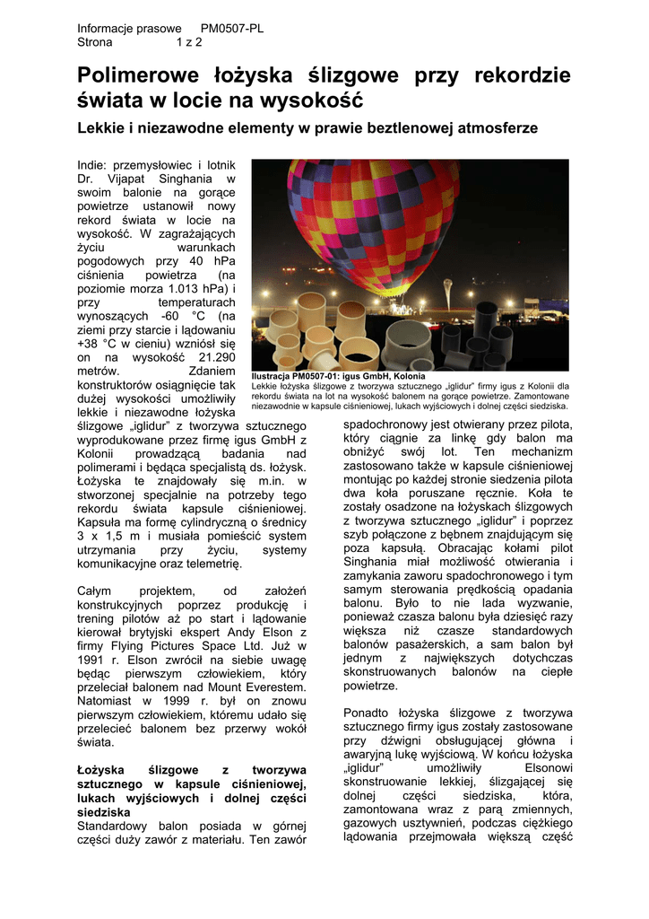 Informacje prasowe PM0507-PL Strona 1z2 Polimerowe łożyska ślizgowe przy rekordzie świata w locie na wysokość Lekkie i niezawodne elementy w prawie beztlenowej atmosferze Indie: przemysłowiec i lotnik Dr. Vijapat Singhania w swoim balonie na gorące powietrze ustanowił nowy rekord świata w locie na wysokość. W zagrażających życiu warunkach pogodowych przy 40 hPa ciśnienia powietrza (na poziomie morza 1.013 hPa) i przy temperaturach wynoszących -60 °C (na ziemi przy starcie i lądowaniu +38 °C w cieniu) wzniósł się on na wysokość 21.290 metrów. Zdaniem Ilustracja PM0507-01: igus GmbH, Kolonia konstruktorów osiągnięcie tak Lekkie łożyska ślizgowe z tworzywa sztucznego „iglidur” firmy igus z Kolonii dla dużej wysokości umożliwiły rekordu świata na lot na wysokość balonem na gorące powietrze. Zamontowane niezawodnie w kapsule ciśnieniowej, lukach wyjściowych i dolnej części siedziska. lekkie i niezawodne łożyska spadochronowy jest otwierany przez pilota, ślizgowe „iglidur” z tworzywa sztucznego który ciągnie za linkę gdy balon ma wyprodukowane przez firmę igus GmbH z obniżyć swój lot. Ten mechanizm Kolonii prowadzącą badania nad zastosowano także w kapsule ciśnieniowej polimerami i będąca specjalistą ds. łożysk. montując po każdej stronie siedzenia pilota Łożyska te znajdowały się m.in. w dwa koła poruszane ręcznie. Koła te stworzonej specjalnie na potrzeby tego zostały osadzone na łożyskach ślizgowych rekordu świata kapsule ciśnieniowej. z tworzywa sztucznego „iglidur” i poprzez Kapsuła ma formę cylindryczną o średnicy szyb połączone z bębnem znajdującym się 3 x 1,5 m i musiała pomieścić system poza kapsułą. Obracając kołami pilot utrzymania przy życiu, systemy Singhania miał możliwość otwierania i komunikacyjne oraz telemetrię. zamykania zaworu spadochronowego i tym samym sterowania prędkością opadania Całym projektem, od założeń balonu. Było to nie lada wyzwanie, konstrukcyjnych poprzez produkcję i ponieważ czasza balonu była dziesięć razy trening pilotów aż po start i lądowanie większa niż czasze standardowych kierował brytyjski ekspert Andy Elson z balonów pasażerskich, a sam balon był firmy Flying Pictures Space Ltd. Już w jednym z największych dotychczas 1991 r. Elson zwrócił na siebie uwagę skonstruowanych balonów na ciepłe będąc pierwszym człowiekiem, który powietrze. przeleciał balonem nad Mount Everestem. Natomiast w 1999 r. był on znowu Ponadto łożyska ślizgowe z tworzywa pierwszym człowiekiem, któremu udało się sztucznego firmy igus zostały zastosowane przelecieć balonem bez przerwy wokół przy dźwigni obsługującej główna i świata. awaryjną lukę wyjściową. W końcu łożyska „iglidur” umożliwiły Elsonowi Łożyska ślizgowe z tworzywa skonstruowanie lekkiej, ślizgającej się sztucznego w kapsule ciśnieniowej, dolnej części siedziska, która, lukach wyjściowych i dolnej części zamontowana wraz z parą zmiennych, siedziska gazowych usztywnień, podczas ciężkiego Standardowy balon posiada w górnej lądowania przejmowała większą część części duży zawór z materiału. Ten zawór Informacje prasowe PM0507-PL Strona 2z2 obciążenia. Dzięki tej konstrukcji zmniejszono zagrożenie zranienia pilota, który nawet przy jeszcze nieaktywnym systemie resorów mógł bezpiecznie wylądować. Odporne na zużycie przy dużych obciążeniach i silnych drganiach Przed rekordem świata konstruktor Andy Elson i jego zespół przez cały rok testowali różne konstrukcje i elemnty w specjalnie skonstruowanym pomieszczeniu wysokościowym. Normalną procedurą w takich sytuacjach, mówi Elson, jest przetestowanie 200 kg wyposażenia oraz wielu innych elementów na każdy kilogram, który rzeczywiście poleci. Elson: ” Do naszego projektu potrzebowaliśmy łożysk ślizgowych, które działają całkowicie bezawaryjnie oraz są bardzo lekkie. Ponadto musiały one uporać się z ekstremalnymi temperaturami oraz brudem i kurzem podczas startu i lądowania na polach indyjskich”. Zdecydowano się na zastosowanie łożysk ślizgowych „iglidur G”, dostępnych w ponad 650 wymiarach z magazynu firmy igus, przeznaczonych do zastosowań uniwersalnych przy bardzo dużych obciążeniach i dużych drganiach i nieodpornych m. in. na brud oraz łożyska „iglidur W300” cechujące się wyjątkowy niskim stopień zużywalności także przy nieprzyjaznych falach lub w erozyjnych warunkach otoczenia. Magazyn kolońskiej firma oferuje ponad 7000 łożysk z tworzyw sztucznych wykonanych z 28 różnych materiałów i dostosowanych do większości zastosowań: od „łożyska do wszystkiego” poprzez np. łożyska do zastosowań pod wodą, aż po łożyska odporne na wysokie temperatury. Ilustracja PM0507-02: igus GmbH, Kolonia Pilot Dr. Vijapat Singhania (z przodu) po bezpiecznym lądowaniu na indyjskim polu po locie na wysokość 21290 metrów. Ilustracja PM0507-03: igus GmbH, Kolonia Stanowisko kontroli obrotu w laboratorium firmy igus w Kolonii: co roku przeprowadza się 5000 testów łożysk ślizgowych. KONTAKT: igus® Sp z o.o ul. Parowcowa 10b 02-445 Warszawa Tel. 022-863 57 70 Faks 022-863 61 69 [email protected] www.igus.pl KONTAKT PRASOWY: André Kluth Corporate Communication Manager igus GmbH Spicher Str. 1a D-51147 Köln Tel. +49 (0) 22 03 / 96 49 - 611 Fax +49 (0) 22 03 / 96 49 - 631 [email protected] www.igus.de DIN ISO 9001:2000 “igus, Chainflex, Easy Chain, E-Chain, E-Chain System, Energy Chain, Energy Chain System, Flizz, ReadyChain, Triflex, TwisterChain, DryLin, iglidur, igubal, Polysorb, plastics for longer life, manus“ są znakami towarowymi chronionymi prawem w Republice Federalnej Niemiec i na całym świecie.