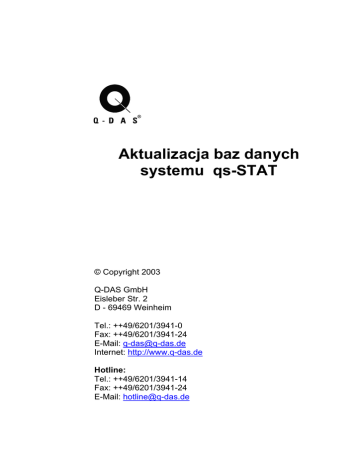 Aktualizacja baz danych systemu qs-STAT © Copyright 2003 Q-DAS GmbH Eisleber Str. 2 D - 69469 Weinheim Tel.: ++49/6201/3941-0 Fax: ++49/6201/3941-24 E-Mail: [email protected] Internet: http://www.q-das.de Hotline: Tel.: ++49/6201/3941-14 Fax: ++49/6201/3941-24 E-Mail: [email protected] Update baz danych systemu qs-STAT Strona 2 / 6 Treść instrukcji 1. 2. 3. 4. 5. 6. Opis Wskazówki ogólne Program aktualizacyjny i jego parametry Informacje ogólne Specyficzne metody postępowania Aktualizacja bazy z wersji 16-bitowej do wersji 32-bitowej Opis Aktualizacja (Update) baz danych systemu qs-STAT obejmuje 3 wykorzystywane przez system bazy. Są to: qdas32.mdb - Baza danych MS Access qdasconfig.mdb - MS Access, 32 - bitowa baza konfiguracji Qdastext32.mdb - MS Access, 32 - bitowa baza konfiguracji Aktualizacja obejmować może następujące elementy Pierwszy rodzaj to dodanie nowego pola (+ nowa treść). Chodzi o rozszerzenie bazy danych o nowe pole lub nowy rekord. Takie pola ma oczywiście nową zawartość. To samo dotyczy nowej tabeli w bazie danych. Drugi rodzaj to zmiana zawartości istniejącego, niezmienionego pola lub całego rekordu, których zawartość ulega zmianie. Przed zmianą system pyta, czy przejęta ma zostać stara niezmieniona, czy nowa zawartość pola. Przypadek taki powinien wystąpić najczęściej. To samo dotyczy modyfikacji całej tabeli w bazie danych. Program aktualizacyjny bazy danych Program aktualizacyjny zabezpiecza istniejącą bazę danych (Backup) pod nazwą *_SAV1.MDB i kopiuje ją. Kopia użyta jest do aktualizacji (OLD). Nowa baza danych z dysku CD użyta jest jako baza źródłowa (NEW). Nowe lub zmodyfikowane tabele kopiowane są z bazy źródłowej do starej bazy danych. Po pozytywnym zakończeniu aktualizacji zmodyfikowana stara baza danych (OLD) zostaje przemianowana do aktualnej. Save 29.04.04/ Print 29.04.04 TC V:\Dokumente\Programmdokumentationen\DB_Update\DBUpdate_POL.doc © 2004 Q-DAS GmbH, 69469 Weinheim [email protected] y Tel. 06201/3941-0 Update baz danych systemu qs-STAT Strona 3 / 6 Aktualizacja bazy tekstów programowych QDASTEXT32.MDB nie stanowi problemu. Nowe rekordy danych przejęte zostają do bazy, a zmienione rekordy są przejmowane lub pozostają bez zmiany w zależności od odpowiedzi na stawiane każdorazowo przez program pytanie. Aktualizacja bazy konfiguracyjnej systemu QDASCONFIG.MDB przebiega różnie w zależności od rodzaju aktualizowanej tabeli. Większość tabel pozostaje bez zmiany a wszystkie dane wykorzystywane są dalej. W niektórych innych tabelach zostają dodane nowe rekordy a struktura bazy danych może ulec zmianie. Aktualizacji podlegają następujące tabele: W następujących tabelach dodane zostają nowe rekordy: • QDAS_GRAPHICS • QDAS_SYSTEM( + DEFAULT_SYS_MENU zawsze zamieniane) • QDAS_SYSTEM_OPTIONS • QDAS_STRATEGY (strategie analiz z COMPANYKEY < 10.000 są zawsze zamieniane) • QDAS_STRATEGYKEYS (strategie analiz z COMPANYKEY < 10.000 są zawsze zamieniane) • COMPANYKEY strategii analiz indywidualnych klientów podwyższany jest o 10.000 - o ile to nie zostało już wcześniej zrobione. Opis programu aktualizacyjnego Program DBUPDATE32.EXE startuje zwykle automatycznie podczas instalacji nowej wersji programu. Może być też jednak wywołany indywidualnie. Parametry programu: 1. Nazwa i ścieżka do programu. 2. Ścieżka do pliku INI systemu qs-STAT. Może ona być pusta (“ “) jeśli plik INI umieszczony jest w folderze Windows. 3. Język programu (44 = English; możliwe są jednak też inne języki, puste pole “ “ = Niemiecki) Save 29.04.04/ Print 29.04.04 TC V:\Dokumente\Programmdokumentationen\DB_Update\DBUpdate_POL.doc © 2004 Q-DAS GmbH, 69469 Weinheim [email protected] y Tel. 06201/3941-0 Update baz danych systemu qs-STAT Strona 4 / 6 4. Text = TEXT (Aktualizacja dotyczy bazy tekstów) Text = TEXTNEW (Baza tekstowa nie będzie aktualizowana, nowa baza przegrana będzie z dysku CD i zastąpi starą. Postępowanie takie jest pożądane jeżeli baza nie została zmieniona przez klienta ponieważ aktualizacja poszczególnych rekordów tej bazy zająć może wiele godzin, zależnie od zainstalowanych języków). Text = “ “ (the text-database will NOT be updated) 5. Superuser = SUPER (Użycie tego parametru powoduje, że program nie startuje i nie kończy automatycznie pracy. Możliwy jest wybór baz do aktualizacji albo przerwanie programu). 6. Conf = CONF (Aktualizacja bazy danych konfiguracji) Conf = “ “ (Baza konfiguracji NIE będzie aktualizowana) 7. Data = DATA (Aktualizacja bazy zawierającej dane klienta) Data = “ “ (Baza klienta NIE będzie aktualizowana). //Np.: “D:\Q-DAS\QSSTAT_ME\BIN\DBUpdate32.exe“ “D:\WINNT\QSSTAT2000.INI“ “44“ “TEXT“ “SUPER“ Æ ALBO start programu dwukrotnym kliknięciem nazwy programu w folderze BIN programu qs-STAT (ścieżka: <Dysk>:\Q-DAS\ME_20\BIN\DBUpdate32.exe) bez żadnych parametrów. Wtedy system wyświetla następujące okno: Informacje ogólne Każda aktualizowana tabela musi posiadać klucz tzw. Primary key. Sortowanie malejące danych według tego klucza nie jest możliwe. Pole “DEFAULT_SYS_MENU“ w tabeli “System” bazy danych QDASCONFIG.MDB podlega zawsze zamianie przy aktualizacji. Zapisywane są tylko zmiany Klucze rekordów tworzone są zawsze od nowa Tabele zaznaczone jako “_INTERN“ nie są nigdy aktualizowane. Save 29.04.04/ Print 29.04.04 TC V:\Dokumente\Programmdokumentationen\DB_Update\DBUpdate_POL.doc © 2004 Q-DAS GmbH, 69469 Weinheim [email protected] y Tel. 06201/3941-0 Update baz danych systemu qs-STAT Strona 5 / 6 Specyficzne metody postępowania Wybrane bazy danych aktualizowane są kolejno 1. QDAS32.MDB i QDASTEXT32.MDB: Program kontroluje brakujące pola i dodaje je. 2. QDAS32.MDB i QDASTEXT32.MDB: Wszystkie klucze rekordów tworzone są od nowa 3. Zależnie od typu bazy danych i dokonanego wyboru kolejne rekordy porównywane są na bazie zawartości ich kluczy pierwotn