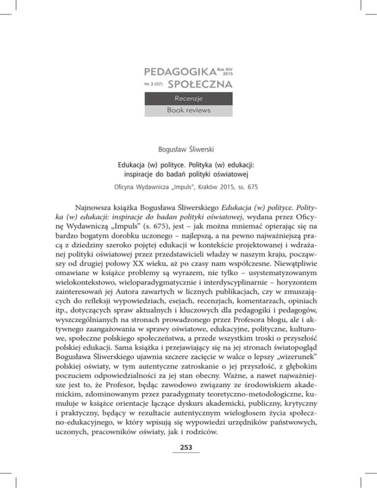 Rok XIV 2015 Nr 3 (57) Recenzje Book reviews Bogusław Śliwerski Edukacja (w) polityce. Polityka (w) edukacji: inspiracje do badań polityki oświatowej Oficyna Wydawnicza „Impuls”, Kraków 2015, ss. 675 Najnowsza książka Bogusława Śliwerskiego Edukacja (w) polityce. Polityka (w) edukacji: inspiracje do badan polityki oświatowej, wydana przez Oficynę Wydawniczą „Impuls” (s. 675), jest – jak można mniemać opierając się na bardzo bogatym dorobku uczonego – najlepszą, a na pewno najważniejszą pracą z dziedziny szeroko pojętej edukacji w kontekście projektowanej i wdrażanej polityki oświatowej przez przedstawicieli władzy w naszym kraju, począwszy od drugiej połowy XX wieku, aż po czasy nam współczesne. Niewątpliwie omawiane w książce problemy są wyrazem, nie tylko – usystematyzowanym wielokontekstowo, wieloparadygmatycznie i interdyscyplinarnie – horyzontem zainteresowań jej Autora zawartych w licznych publikacjach, czy w zmuszających do refleksji wypowiedziach, esejach, recenzjach, komentarzach, opiniach itp., dotyczących spraw aktualnych i kluczowych dla pedagogiki i pedagogów, wyszczególnianych na stronach prowadzonego przez Profesora blogu, ale i aktywnego zaangażowania w sprawy oświatowe, edukacyjne, polityczne, kulturowe, społeczne polskiego społeczeństwa, a przede wszystkim troski o przyszłość polskiej edukacji. Sama książka i przejawiający się na jej stronach światopogląd Bogusława Śliwerskiego ujawnia szczere zacięcie w walce o lepszy „wizerunek” polskiej oświaty, w tym autentyczne zatroskanie o jej przyszłość, z głębokim poczuciem odpowiedzialności za jej stan obecny. Ważne, a nawet najważniejsze jest to, że Profesor, będąc zawodowo związany ze środowiskiem akademickim, zdominowanym przez paradygmaty teoretyczno-metodologiczne, kumuluje w książce orientacje łączące dyskurs akademicki, publiczny, krytyczny i praktyczny, będący w rezultacie autentycznym wielogłosem życia społeczno-edukacyjnego, w który wpisują się wypowiedzi urzędników państwowych, uczonych, pracowników oświaty, jak i rodziców. 253 Recenzje Książka Bogusława Śliwerskiego może być wykorzystywana do realizacji wielu zadań i celów. Przede wszystkim może być traktowana jako podręcznik akademicki, do którego mogą/powinni odwoływać się studenci pedagogiki i politologii. Z kolei Zbyszko Melosik w swojej recenzji zamieszczonej na okładce tej pracy, pisze: „Książka profesora Bogusława Śliwerskiego stanowi znakomite interdyscyplinarne kompendium wiedzy z najnowszej historii Polski, w którym analizy socjologiczne, pedagogiczne, psychologiczne, a nawet ekonomiczne splatają się z rozważaniami o charakterze filozoficznym, a także – w oczywisty sposób – politologiczny”. Walor historyczny, a także epistemologiczny, metodyczny i moralny tej pracy, powinien być źródłem wiedzy dla nauczycieli „żywo” zainteresowanych politycznym podłożem kształtowania programów nauczania i ich efektami, inspiracją dla badaczy oświaty, a także „opiniotwórczą” poręką dla tych urzędników, którzy odpowiadają za reformę oświaty. I w tym sensie prace tę należy traktować jako refleksyjny głos sumienia wymierzony we władze decydujące o kierunkach rozwoju i efektywności nauczania i wychowania w Polsce, ale – o czym nie wolno zapominać – przy aprobacie tych urzędników i akademików, którzy dali się uwieść po 1989 roku „demokratyzującym” oddziaływaniom nacechowanych ideologiczną indoktrynacją, paradygmatyczną wiarą w sprawczą moc nauki czy ekonomicznymi profitami. Należy w tym miejscy wyraźnie podkreślić, że praca została w swojej strukturze tak przemyślana, że nie ogranicza się do zestawienia relacji łączącej edukację z polityką, ale ma służyć refleksji i inspirować do badań polityki oświatowej, aby w ich wyniku nie tylko wykazywać ignorancję urzędników państwowych, brak wyobraźni w podejmowaniu decyzji, nepotyzm itd. itp., a wyniki samych badań mają pełnić rolę oświeceniową, weryfikującą i nadzorującą, co ma służyć podniesieniu świadomości społecznej, w tym ludzi „ministerialnie” odpowiedzialnych za kształcenie i wychowanie, albowiem – jak się zdaje – jest to jedyna droga, na której i poprzez którą uczeni-praktycy-badacze mogą rzeczowo, zdroworozsądkowo, racjonalnie, wiarygodnie, sumiennie i „życiowo” wpływać na politykę oświatową w naszym kraju. Z czym zatem można zapoznać się czytając książkę Śliwerskiego i na co w niej warto zwrócić uwagę? Można przyjąć, że ma ona charakter programowy, dotyczy przybliżenia relacji edukacji i polityki w kontekście upolityczniania oświaty przez MEN wraz z jej wiwisekcją, której świadomość ma służyć refleksji i konkretnym działaniom (badaniom), a ich wymiernym efektem mogą być na przykład zebrane przez Autora przemyślenia zawarte w ostatniej części książki. Można również przyjąć, że opis relacji edukacja-polityka ma wymiar ontyczno-meto254 Recenzje dyczny, etyczny i ideologiczny. Na książkę składa się Wstęp, pięć rozdziałów, z których dwa pierwsze dotyczą wspomnianej relacji polityka-edukacja w kontekście nauk społecznych i polityki oświatowej; kolejne dwa mają wymiar metodyczny, w których kładzie się nacisk na strategie upolityczniania edukacji przez władze oraz metody badań tych strategii oraz ich efektów przez pedagogów; pięty rozdział jest rachunkiem sumienia postaw pedagogów wobec władz upolityczniających edukację; całość kończy rozdział: Zamiast zakończenia, w którym Profesor szuka odpowiedzi na pytanie: Co dalej z etatystycznie zarządzanym systemem edukacyjnym w III Rzeczpospolitej Polskiej? Wstęp monografii to autorskie kredo, uzasadniające naukowy charakter pracy oraz światopoglądowe przemyślenia wprowadzające w tematykę książki, mającej – można obrazowo przedstawić