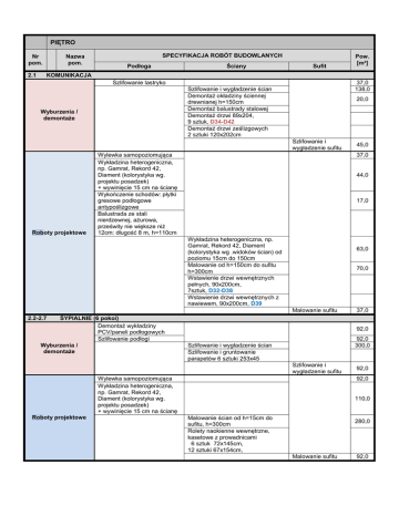 PIĘTRO Nr pom. 2.1 Nazwa pom. SPECYFIKACJA ROBÓT BUDOWLANYCH Podłoga Ściany Sufit Pow. [m²] KOMUNIKACJA Szlifowanie lastryko 37,0 138,0 Szlifowanie i wygładzenie ścian Demontaż okładziny ściennej drewnianej h=150cm Demontaż balustrady stalowej Demontaż drzwi 89x204, 9 sztuk, D34-D42 Demontaż drzwi ześlizgowych 2 sztuki 120x202cm Wyburzenia / demontaże 20,0 Szlifowanie i wygładzenie sufitu Roboty projektowe Wylewka samopoziomująca Wykładzina heterogeniczna, np. Gamrat, Rekord 42, Diament (kolorystyka wg. projektu posadzek) + wywinięcie 15 cm na ścianę Wykończenie schodów: płytki gresowe podłogowe antypoślizgowe Balustrada ze stali nierdzewnej, ażurowa, prześwity nie większe niż 12cm: długość 8 m, h=110cm 37,0 44,0 17,0 Wykładzina heterogeniczna, np. Gamrat, Rekord 42, Diament (kolorystyka wg .widoków ścian) od poziomu 15cm do 150cm Malowanie od h=150cm do sufitu h=300cm Wstawienie drzwi wewnętrznych pełnych, 90x200cm, 7sztuk, D32-D38 Wstawienie drzwi wewnętrznych z nawiewem, 90x200cm, D39 63,0 70,0 Malowanie sufitu ŚYPIALNIE (6 pokoi) Demontaż wykładziny PCV/paneli podłogowych Szlifowanie podłogi Wyburzenia / demontaże 45,0 37,0 2.2-2.7 92,0 92,0 300,0 Szlifowanie i wygładzenie ścian Szlifowanie i gruntowanie parapetów 6 sztuki 253x45 Szlifowanie i wygładzenie sufitu Wylewka samopoziomująca Wykładzina heterogeniczna, np. Gamrat, Rekord 42, Diament (kolorystyka wg. projektu posadzek) + wywinięcie 15 cm na ścianę Roboty projektowe 92,0 92,0 110,0 Malowanie ścian od h=15cm do sufitu, h=300cm Rolety naokienne wewnętrzne, kasetowe z prowadnicami 6 sztuk 72x145cm, 12 sztuki 67x154cm, 280,0 Malowanie sufitu 92,0 2.8 POKÓJ DOWÓDCY ZMIANY Demontaż płytek ceramicznych podłogowych Skucie wylewki, wyrównanie do poziomu komunikacji, ok.5cm Wyburzenia / demontaże 11,0 11,0 Usunięcie tapety Szlifowanie i wygładzenie ścian Szlifowanie i gruntowanie parapetów 2 sztuki 85x45, 1 sztuka 110x45 40,0 40,0 Szlifowanie i wygładzenie sufitu Roboty projektowe Wylewka samopoziomująca Wykładzina heterogeniczna, np. Gamrat, Rekord 42, Diament (kolorystyka wg. projektu posadzek) + wywinięcie 15 cm na ścianę 11,0 13,0 Malowanie ścian od h=15cm do sufitu h=300 Rolety naokienne wewnętrzne, 2 sztuki 63x61cm, 1 sztuka 80x145cm 39,0 Malowanie sufitu 2.9 i 2.11 SANITARIAT i UMYWALNIA Skucie płytek ceramicznych podłogowych Szlifowanie podłogi 30,7 17,0 0,5 2,2 150,0 Szlifowanie i wygładzenie sufitu Płytki gresowe podłogowe Podłoga 33,0 33,0 Izolacja posadzki i ścian do h=200cm, np. Ceresit CR 166 Płytki ceramiczne ścienne do h=200cm Malowanie ścian od h=200cm Zamurowanie otworu, 89X200cm, S17 Montaż systemowych kabin toaletowych wraz z drzwiami D42, D43, prześwit od posadzki 15cm, h kabiny 200cm, S18, Wymurowanie ścian działowych między kabinami prysznicowymi grubości 10cm, h=200cm, cegła pełna, S19 Wstawienie drzwi z nawiewem 80x200cm, D40 Wstawienie drzwi z nawiewem 90x200, D41 Wstawienie drzwi do kabin toaletowych, 80x200, D42, D43 Roboty projektowe 11,0 20,7 Demontaż drzwi wewnętrznych, 3 sztuki, 70x204cm, D43, D44, D45 Wyburzenie ścian działowych, W22 Poszerzenie otworu drzwiowego, W24 Wybicie otworu drzwiowego 101x205cm, W23 Szlifowanie i wygładzenie ścian Demontaż: umywalki - 5 sztuk, miska ustępowa, pisuar, brodziki prysznicowe - 3 sztuki Wyburzenia / demontaże 11,0 Ściany 133,0 100,0 50,0 1,76 6,0 Sufit Wstawienie drzwi do kabin prysznicowych, szkło bezpieczne matowe 80x200, D44, D45, D46, D47 Malowanie sufitu 2.10 POMIESZCZENIE TECHNICZNE Skucie płytek ceramicznych podłogowych Szlifowanie podłogi Wyburzenia / demontaże 1,0 1,0 Skucie płytek ceramicznych ściennych Szlifowanie i wygładzenie ścian 9,0 13,5 Szlifowanie i wygładzenie sufitu Płytki gresowe podłogowe antypoślizgowe 10,0 9,0 4,5 Malowanie sufitu 2.12 POKÓJ ZASTĘPCY Usunięcie paneli podłogowych Szlifowanie podłogi 48,0 Demontaż płyt gipsowo kartonowych z sufitu Szlifowanie i wygładzenie sufitu Wylewka samopoziomująca Wykładzina heterogeniczna, np. Gamrat, Rekord 42, Diament (kolorystyka wg. projektu posadzek) + wywinięcie 15 cm na ścianę 45,0 POMIESZCZENIE POMOCNICZE Usunięcie płytek ceramicznych podłogowych Szlifowanie podłogi 5,0 27,0 27,0 Demontaż sufitu podwieszanego Szlifowanie i wygładzenie sufitu Roboty projektowe Wylewka samopoziomująca Wykładzina heterogeniczna, np. Gamrat, Rekord 42, Podłoga 13,5 5,0 Demontaż paneli ściennych PCV, h=300cm Szlifowanie i wygładzenie ścian Wyburzenia / demontaże 13,5 16,0 Malowanie sufitu 2.13 13,5 13,5 Malowanie ścian od h=15cm do sufitu, h=300cm Wstawienie drzwi, 90x200cm, D48 Rolety naokienne wewnętrzne, kasetowe z prowadnicami, 2 sztuki 67x154cm, 1 sztuka 72x145cm Roboty projektowe 1,0 13,5 13,5 48,0 Szlifowanie i wygładzenie ścian Demontaż płyt gipsowo kartonowych ze ścian Demontaż drzwi, 80x200, D51 Wyburzenia / demontaże 1,0 1,0 Izolacja posadzki i ścian do h=200cm, np. Ceresit CR 166 Płytki ceramiczne ścienne, do h=200cm Malowanie ścian od h=200cm do sufitu h=300cm Roboty projektowe 33,0 5,0 5,0 5,0 6,35 Ściany Sufit Diament (kolorystyka wg. projektu posadzek) + wywinięcie 15 cm na ścianę Malowanie ścian od poziomu h=15cm do sufitu h=300cm Wymurowanie ściany działowej grubości 12cm, cegła pełna, S20 Wstawienie drzwi wewnętrznych aluminiowych pełnych 90x200cm,kolor biały, zamek elektroniczny pod monitoring, D49 26,0 4,0 Malowanie sufitu 2.14 Demontaż paneli podłogowych Szlifowanie podłogi 12,3 12,3 27,0 27,0 Szlifowanie i wygładzenie ścian Usunięcie tapety Wyburzenia / demontaże Demontaż sufitu kasetonowego Szlifowanie i wygładzenie sufitu Wylewka samopoziomująca Wykładzina heterogeniczna, np. Gamrat, Rekord 42, Diament (kolorystyka wg. projektu posadzek) + wywinięcie 15 cm na ścianę 12,5 41,0 Malowanie sufitu Szlifowanie i wygładzenie ścian Usunięcie tapety Czyszczenie i malowanie futryny drzwiowej, 90x200cm Wylewka samopoziom