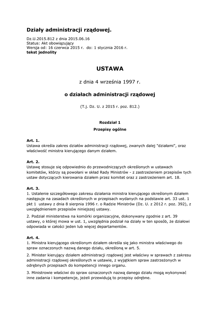 Działy administracji rządowej. Dz.U.2015.812 z dnia 2015.06.16 Status: Akt obowiązujący Wersja od: 16 czerwca 2015 r. do: 1 stycznia 2016 r. tekst jednolity USTAWA z dnia 4 września 1997 r. o działach administracji rządowej (T.j. Dz. U. z 2015 r. poz. 812.) Rozdział 1 Przepisy ogólne Art. 1. Ustawa określa zakres działów administracji rządowej, zwanych dalej "działami", oraz właściwość ministra kierującego danym działem. Art. 2. Ustawę stosuje się odpowiednio do przewodniczących określonych w ustawach komitetów, którzy są powołani w skład Rady Ministrów - z zastrzeżeniem przepisów tych ustaw dotyczących kierowania działem przez komitet oraz z zastrzeżeniem art. 18. Art. 3. 1. Ustalenie szczegółowego zakresu działania ministra kierującego określonym działem następuje na zasadach określonych w przepisach wydanych na podstawie art. 33 ust. 1 pkt 1 ustawy z dnia 8 sierpnia 1996 r. o Radzie Ministrów (Dz. U. z 2012 r. poz. 392), z uwzględnieniem przepisów niniejszej ustawy. 2. Podział ministerstwa na komórki organizacyjne, dokonywany zgodnie z art. 39 ustawy, o której mowa w ust. 1, uwzględnia podział na działy w ten sposób, że działowi odpowiada w całości jeden lub więcej departamentów. Art. 4. 1. Ministra kierującego określonym działem określa się jako ministra właściwego do spraw oznaczonych nazwą danego działu, określoną w art. 5. 2. Minister kierujący działem administracji rządowej jest właściwy w sprawach z zakresu administracji rządowej określonych w ustawie, z wyjątkiem spraw zastrzeżonych w odrębnych przepisach do kompetencji innego organu. 3. Ministrowie właściwi do spraw oznaczonych nazwą danego działu mogą wykonywać inne zadania i kompetencje, jeżeli przewidują to przepisy odrębne. 4. Kierowanie działami administracji rządowej, o których mowa w art. 5 pkt 2, 3 i 7, powierza się jednemu ministrowi. 5. Kierowanie działami administracji rządowej, o których mowa w art. 5 pkt 8 i 27, powierza się jednemu ministrowi. Art. 4a. 1. Minister kierujący działem administracji rządowej, z zastrzeżeniem art. 33a ust. 4, jest właściwy w sprawach uznawania kwalifikacji w zawodach regulowanych oraz w sprawach uznawania kwalifikacji do podejmowania lub wykonywania działalności należących do tego działu. 2. Uznawanie kwalifikacji w zawodach regulowanych oraz uznawanie kwalifikacji do podejmowania lub wykonywania działalności należących do tego działu oznacza uznawanie tych kwalifikacji w znaczeniu przewidzianym w Unii Europejskiej. 3. Minister kierujący działem administracji rządowej może, w drodze rozporządzenia, upoważnić do wykonywania zadania określonego w ust. 1 organ lub jednostkę organizacyjną podległą ministrowi, organ samorządu zawodowego, organizację gospodarczą lub organ rejestrowy. Rozdział 2 Klasyfikacja działów administracji rządowej Art. 5. Ustala się następujące działy: 1) administracja publiczna; 1a) budownictwo, lokalne planowanie i zagospodarowanie przestrzenne oraz mieszkalnictwo; 2) budżet; 3) finanse publiczne; 4) gospodarka; 5) gospodarka morska; 6) gospodarka wodna; 7) instytucje finansowe; 7a) informatyzacja; 8) członkostwo Rzeczypospolitej Polskiej w Unii Europejskiej; 9) kultura i ochrona dziedzictwa narodowego; 10) kultura fizyczna; 11) łączność; 12) (uchylony); 13) nauka; 14) obrona narodowa; 15) oświata i wychowanie; 16) praca; 17) rolnictwo; 18) rozwój wsi; 18a) rozwój regionalny; 18b) rynki rolne; 18c) rybołówstwo; 19) Skarb Państwa; 20) sprawiedliwość; 21) szkolnictwo wyższe; 22) transport; 22a) turystyka; 23) środowisko; 23a) rodzina; 24) sprawy wewnętrzne; 25) wyznania religijne oraz mniejszości narodowe i etniczne; 26) zabezpieczenie społeczne; 27) sprawy zagraniczne; 28) zdrowie. Art. 6. 1. Dział administracja publiczna obejmuje sprawy: 1) administracji, w tym organizacji urzędów administracji publicznej oraz procedur administracyjnych; 2) reform i organizacji struktur administracji publicznej; 3) zespolonej administracji rządowej w województwie; 4) podziału administracyjnego państwa oraz nazw jednostek osadniczych i obiektów fizjograficznych; 4a) geodezji i kartografii; 4b) przeciwdziałania skutkom klęsk żywiołowych i innych podobnych zdarzeń zagrażających bezpieczeństwu powszechnemu; 4c) usuwania skutków klęsk żywiołowych i innych podobnych zdarzeń zagrażających bezpieczeństwu powszechnemu; 5) (uchylony) 6) zbiórek publicznych; 7) prowadzenia rejestru podmiotów wykonujących zawodową działalność lobbingową. 2. Minister właściwy do spraw administracji publicznej sprawuje nadzór nad Głównym Geodetą Kraju, Krajową Komisją Uwłaszczeniową oraz, na podstawie kryterium zgodności z prawem, nad działalnością regionalnych izb obrachunkowych. 3. Ilekroć właściwy minister lub kierownik urzędu centralnego określa, na podstawie przepisów odrębnych, terytorialny zakres działania podległych mu lub nadzorowanych przez niego urzędów albo innych jednostek organizacyjnych, określenie to następuje w porozumieniu z ministrem właściwym do spraw administracji publicznej. Art. 7. Dział budżet obejmuje sprawy: 1) opracowywania budżetu państwa, wykonywania - z wyjątkiem spraw zastrzeżonych do kompetencji ministra właściwego do spraw finansów publicznych budżetu państwa, kontroli realizacji budżetu państwa oraz przygotowywania sprawozdań z wykonania budżetu państwa; 2) systemu finansowania: a) samorządu terytorialnego, b) sfery budżetowej, c) bezpieczeństwa państwa; 3) wynikające z zarządzania długiem publicznym. Art. 8. 1. Dział finanse publiczne obejmuje sprawy realizacji dochodów i wydatków budżetu państwa. 2. Minister właściwy do spraw finansów publicznych odpowiada, na zasadach, w trybie i w granicach określonych odrębnymi przepisami, w szczególności za: 1) realizację dochodów z podatków bezpośrednich, pośrednich oraz opłat; 2) koord