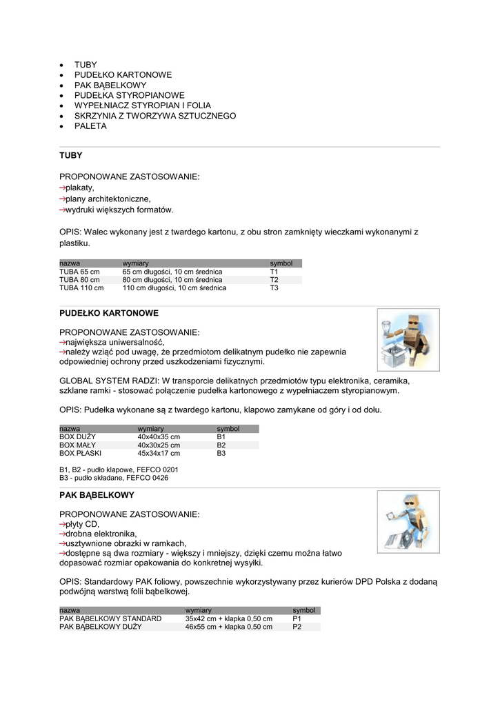 TUBY PUDEŁKO KARTONOWE PAK BĄBELKOWY PUDEŁKA STYROPIANOWE WYPEŁNIACZ STYROPIAN I FOLIA SKRZYNIA Z TWORZYWA SZTUCZNEGO PALETA TUBY PROPONOWANE ZASTOSOWANIE: plakaty, plany architektoniczne, wydruki większych formatów. OPIS: Walec wykonany jest z twardego kartonu, z obu stron zamknięty wieczkami wykonanymi z plastiku. nazwa TUBA 65 cm TUBA 80 cm TUBA 110 cm wymiary 65 cm długości, 10 cm średnica 80 cm długości, 10 cm średnica 110 cm długości, 10 cm średnica symbol T1 T2 T3 PUDEŁKO KARTONOWE PROPONOWANE ZASTOSOWANIE: największa uniwersalność, należy wziąć pod uwagę, że przedmiotom delikatnym pudełko nie zapewnia odpowiedniej ochrony przed uszkodzeniami fizycznymi. GLOBAL SYSTEM RADZI: W transporcie delikatnych przedmiotów typu elektronika, ceramika, szklane ramki - stosować połączenie pudełka kartonowego z wypełniaczem styropianowym. OPIS: Pudełka wykonane są z twardego kartonu, klapowo zamykane od góry i od dołu. nazwa BOX DUŻY BOX MAŁY BOX PŁASKI wymiary 40x40x35 cm 40x30x25 cm 45x34x17 cm symbol B1 B2 B3 B1, B2 - pudło klapowe, FEFCO 0201 B3 - pudło składane, FEFCO 0426 PAK BĄBELKOWY PROPONOWANE ZASTOSOWANIE: płyty CD, drobna elektronika, usztywnione obrazki w ramkach, dostępne są dwa rozmiary - większy i mniejszy, dzięki czemu można łatwo dopasować rozmiar opakowania do konkretnej wysyłki. OPIS: Standardowy PAK foliowy, powszechnie wykorzystywany przez kurierów DPD Polska z dodaną podwójną warstwą folii bąbelkowej. nazwa PAK BĄBELKOWY STANDARD PAK BĄBELKOWY DUŻY wymiary 35x42 cm + klapka 0,50 cm 46x55 cm + klapka 0,50 cm symbol P1 P2 PUDEŁKA STYROPIANOWE PROPONOWANE ZASTOSOWANIE: jedną z właściwości tego typu pudełek jest utrzymywanie stabilnej temperatury przez 24h, dlatego doskonale sprawdzają się jako pojemnik dla wszystkich materiałów wymagających stałej temperatury w transporcie, styropian dodatkowo zabezpiecza przed uszkodzeniami mechanicznymi. OPIS: Pudełka wykonane są ze styropianu, grubość ścianki 35 mm. nazwa PUDEŁKO STYROPIANOWE wymiary 30x40x27 symbol Y1 WYPEŁNIACZ STYROPIAN I FOLIA PROPONOWANE ZASTOSOWANIE: transport mebli, wyroby szklane i ceramika, armatura, artykuły RTV I AGD, sprawdza się również przy zabezpieczaniu nietypowych przesyłek takich jak np. rowery, zastosowanie wypełniaczy zapewnia dodatkową ochronę delikatnych artykułów w trakcie transportu, wypełniacze amortyzują przesyłkę w przypadku wstrząsów i uniemożliwiają przemieszczanie się jej zawartości wewnątrz opakowania. OPIS: Styropian pakowany jest w sporych rozmiarów worek (500 litrów), a folia bąbelkowa jest rolowana na beli o wysokości 100 cm. nazwa wymiary symbol WYPEŁNIACZ STYROPIANOWY FOLIA BĄBELKOWA Płatki o średnicy 3 cm, pakowane w worek o pojemności 500 litrów Bela 100 cm x 50 m W1 W2 SKRZYNIA Z TWORZYWA SZTUCZNEGO PROPONOWANE ZASTOSOWANIE: gdy wymagany jest najwyższy poziom bezpieczeństwa np. dla przewożonych poufnych materiałów (w połączeniu z plombą), umożliwiają wielokrotne zastosowanie, np. przy codziennym wysyłaniu materiałów pomiędzy oddziałami firmy na terenie całej Polski. OPIS: Skrzynia wykonana jest z grubego plastiku, zamykana od góry wiekiem. Na wystających uchwytach można zamontować plomby, które uniemożliwiają osobom niepowołanym naruszenie zawartości bez wiedzy Klienta (plomby nie są dołączone do zamawianych skrzyń). nazwa wymiary symbol SKRZYNIA WIĘKSZA SKRZYNIA EURO-FIX-BOX EFB poj. 72 litry + pokrywa S1 SKRZYNIA MNIEJSZA SKRZYNIA POLBOX PB 6320 poj. 49 litrów + pokrywa S2 PALETA PROPONOWANE ZASTOSOWANIE: nieodzowny element przy transporcie dużych i ciężkich ładunków. OPIS: Palety oferowane przez Agentów są paletami używanymi, w bardzo dobrym stanie, po jednokrotnym użyciu, nie noszą widocznych śladów uszkodzeń. nazwa PALETA EURO wymiary Podstawa 80x120 cm symbol E1