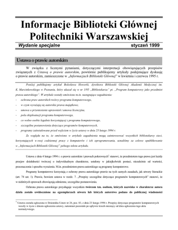 Informacje Biblioteki Głównej Politechniki Warszawskiej Wydanie specjalne styczeń 1999 Ustawa o prawie autorskim W związku z licznymi pytaniami, dotyczącymi interpretacji obowiązujących przepisów związanych z Ustawą o prawie autorskim, powtórnie publikujemy artykuły podejmujące dyskusję o prawie autorskim, zamieszczone w „Informacjach Biblioteki Głównej” w kwietniu i czerwcu 1995 r. Poniżej publikujemy artykuł Bolesława Howorki, dyrektora Biblioteki Głównej Akademii Medycznej im. K. Marcinkowskiego w Poznaniu, który ukazał się w nr 3/95 „Bibliotekarza” pt. „Program komputerowy jako przedmiot prawa autorskiego”. W artykule zostały omówione m.in. następujące zagadnienia: - ochrona praw autorskich twórcy programu komputerowego, - w czym wyrażają się autorskie prawa majątkowe, - umowa o przeniesienie uprawnień i umowa licencyjna, - pola eksploatacji programu komputerowego, - co wolno osobie legalnie korzystającej z programu komputerowego, - szczególne postanowienia dotyczące programów komputerowych, - programy zainstalowane przed wejściem w życie ustawy w dniu 23 lutego 1994 r. Ze względu na to, że omówione w artykule zagadnienia mogą zainteresować wszystkich bibliotekarzy sieci, korzystających w swej codziennej pracy z komputerów i ich oprogramowania, uznaliśmy za celowe opublikowanie w „Informacjach Biblioteki Głównej” pełnego tekstu artykułu. Ustawa z dnia 4 lutego 1994 r. o prawie autorskim i prawach pokrewnych1 stanowi, że przedmiotem tego prawa jest każdy przejaw działalności twórczej o indywidualnym charakterze, ustalony w jakiejkolwiek postaci, niezależnie od wartości, przeznaczenia i sposobu wyrażenia. M.in. przedmiotem prawa autorskiego są programy komputerowe. Programy komputerowe korzystają z ochrony prawa autorskiego prawie na tych samych zasadach, jak utwory literackie (art. 74 ust. 1). Prawie, bowiem ustawa w rozdz. 7. „Przepisy szczególne dotyczące programów komputerowych” stanowi, że w niektórych sprawach obowiązują odmienne, szczególne postanowienia. Ochrona prawa autorskiego przysługuje wszystkim twórcom tzn. osobom, których nazwisko w charakterze autora dzieła zostało uwidocznione na egzemplarzach utworu lub których autorstwo podano do publicznej wiadomości 1 Ustawa została ogłoszona w Dzienniku Ustaw nr 24, poz. 83, z dnia 23 lutego 1994 r. Przepisy dotyczące programów komputerowych weszły w życie z dniem ogłoszenia ustawy, natomiast pozostałe po upływie trzech miesięcy od dnia ogłoszenia tego aktu normatywnego. Informacje Biblioteki Głównej 2 w jakikolwiek inny sposób w związku z rozpowszechnianiem utworu ( art. 8 ust. 2). Jest to domniemanie, a więc można twierdzenie o autorstwie obalić przez przedstawienie dowodu, że autorem jest inna osoba. Jeżeli autorstwo nie zostało ujawnione, twórcę w wykonywaniu prawa autorskiego zastępuje producent lub wydawca, a w razie jego braku – właściwa organizacja zbiorowego zarządzania prawami autorskimi. Ochrona autorskich praw osobistych twórcy programu komputerowego wyraża się zapewnieniem nienaruszalności jego więzi z utworem, tak samo, jak innych twórców, o których stanowi ustawa o prawie autorskim. Jednakże w sytuacji, która jest przedmiotem zainteresowania tego artykułu, ochrona ta jest ograniczona i obejmuje wyłącznie prawo twórcy programu komputerowego do zaznaczenia swojego autorstwa, tzn. do oznaczenia utworu swoim nazwiskiem. Jest to prawo nieograniczone w czasie, nie ulega ono wygaśnięciu. Autor nie może zrzec się tego prawa, nie może go przekazać innej osobie, zbyć. Może on jednak, jeśli nie będzie chciał z jakichś powodów oznaczyć utworu nazwiskiem, zamieścić w dziele swój pseudonim, może także rozpowszechnić swój utwór anonimowo. Autorskie prawa majątkowe wyrażają się wyłącznym prawem twórcy do korzystania z dzieła, do rozporządzania utworem na wszystkich polach eksploatacji, a także prawem do wynagrodzenia za udzielenie zgody na korzystanie z utworu. Przyznana autorowi ochrona jego praw obejmuje wszystkie formy wyrażenia programu komputerowego. Jako takie formy ustawa wymienia przykładowo dokumentację projektową i wytwórczą programu, a także dokumentację użytkową. Natomiast ochronie prawa nie podlegają idee i zasady, stanowiące podstawę jakiegokolwiek elementu programu komputerowego, jak i podstawa łączy. Jednakże prawa majątkowe do programu komputerowego, który został stworzony przez pracownika w wyniku wykonywania obowiązków wynikających ze stosunku pracy, przysługują pracodawcy. Umowa zawarta z pracownikiem może w tej sprawie stanowić inaczej. W innych sytuacjach, kiedy program komputerowy został opracowany w sytuacji pozostającej bez związku ze stosunkiem pracy łączącym twórcę z jakimś pracodawcą, obowiązują przepisy ogólne, stanowiące o majątkowych prawach autorskich, m.in. o możliwości przeniesienia ich na inne osoby w drodze dziedziczenia, a przede wszystkim na podstawie umowy ( art. 41). W dziedzinie majątkowych praw autorskich mamy do czynienia z dwiema kategoriami umów, z umową o przeniesienie uprawnień oraz z umową licencyjną. Przeniesienie uprawnień daje nabywcy programu komputerowego, z chwilą przyjęcia utworu, prawo do wyłącznego korzystania z utworu na określonym w umowie polu eksploatacji; umowa może w tej sprawie stanowić w sposób odmienny. Z przeniesieniem praw do utworu mamy do czynienia tylko wtedy, gdy w umowie zostało to wyraźnie zaznaczone. Jeżeli takiego, wyraźnego postanowienia w umowie nie będzie, należy przyjąć, że nabywca nabył tylko licencję. Umowa o przeniesieniu uprawnień musi, obok odpowiedniego wyraźnego stwierdzenia o jej charakterze, określać pole eksploatacji, a także zakres i czas korzystania z programu. Umowa licencyjna uprawnia nabywcę do korzystania z dzieła w okresie pięciu lat, na terenie państwa, w którym jest siedziba licencjobior