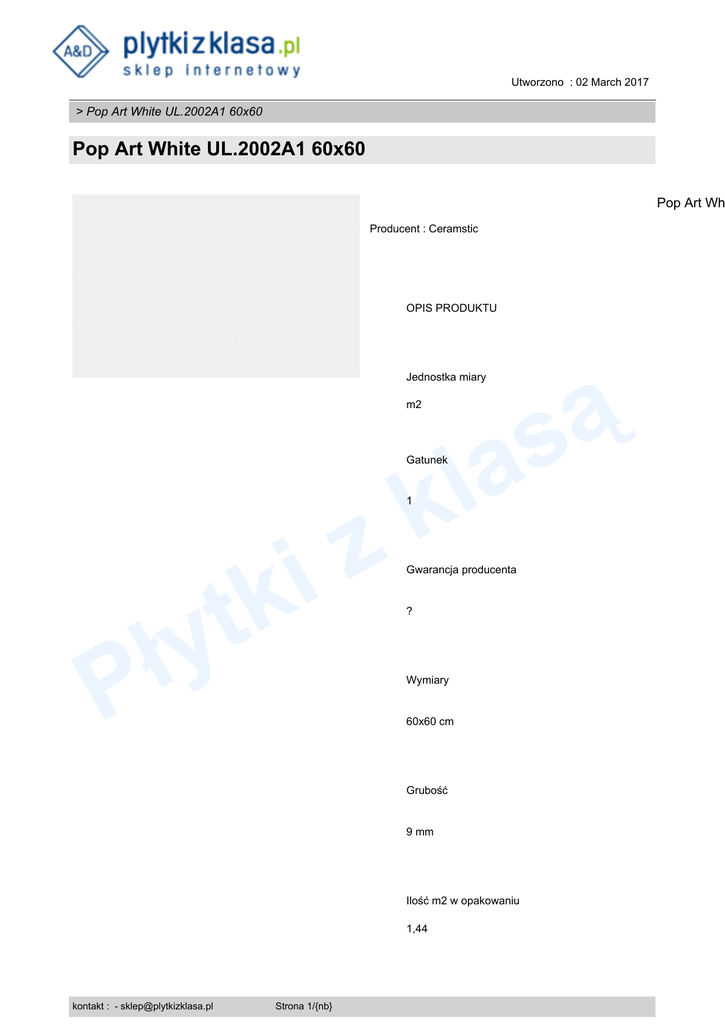 Utworzono : 02 March 2017 > Pop Art White UL.2002A1 60x60 Pop Art White UL.2002A1 60x60 Pop Art Wh Producent : Ceramstic OPIS PRODUKTU ą s la Jednostka miary m2 Gatunek k z 1 i tk y ł P Gwarancja producenta ? Wymiary 60x60 cm Grubość 9 mm Ilość m2 w opakowaniu 1,44 kontakt : - [email protected] Strona 1/{nb} Utworzono : 02 March 2017 > Pop Art White UL.2002A1 60x60 Pop Art White UL.2002A1 60x60 Ilość sztuk w opakowaniu 4 Rodzaj Płytka podłogowa / ścienna ą s la Zastosowanie Wewnątrz / zewnątrz k z Pomieszczenia i tk y ł P Uniwersalna Powierzchnia Polerowana Produkt rektyfikowany Tak Produkt tonalny --- Klasa ścieralności PEI / liczba obrotów Nie dotyczy Antypoślizgowość Nie dotyczy Mrozoodporoność Tak kontakt : - [email protected] Strona 2/{nb} Utworzono : 02 March 2017 > Pop Art White UL.2002A1 60x60 Pop Art White UL.2002A1 60x60 Waga opakowania / 1m2 29,5 kg / 20,5 kg Podana cena dotyczy 1 m2 Spsosób sprzedaży produktu Produkt sprzedawany na opakowania ą s la Cena : 87,15 zł Brutto ( 70,85 zł Netto) k z Dostępność: Produkt dostępny w naszym sklepie od 13 August 2016 i tk y ł P kontakt : - [email protected] Strona 3/{nb}