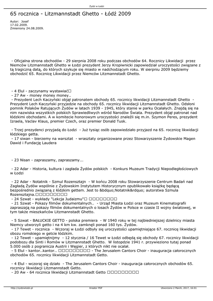 Żydzi w Łodzi 65 rocznica - Litzmannstadt Ghetto - Łódź 2009 Autor: Josef 17.02.2009. Zmieniony 24.08.2009. - Oficjalna strona obchodów - 29 sierpnia 2008 roku podczas obchodów 64. Rocznicy Likwidacji przez Niemców Litzmannstadt Ghetto w Łodzi prezydent Jerzy Kropiwnicki zapowiedział uroczystości związane z tą tragiczną datą, do których szykuje się miasto w nadchodzącym roku. W sierpniu 2009 będziemy obchodzić 65. Rocznicę Likwidacji przez Niemców Litzmannstadt Ghetto. - 4 Elul - zaczynamy wystawiać - 27 Aw - money money money.. - Prezydent Lech Kaczyński objął patronatem obchody 65. rocznicy likwidacji Litzmannstadt Ghetto Prezydent Lech Kaczyński przyjedzie na obchody 65. rocznicy likwidacji Litzmannstadt Ghetto. Odsłoni pomnik Polaków Ratujących Żydów w latach 1939 - 1945, który stanie w parku Ocalałych. Znajdą się na nim nazwiska wszystkich polskich Sprawiedliwych wśród Narodów Świata. Prezydent objął patronat nad łódzkimi obchodami. A w komitecie honorowym uroczystości znaleźli się m.in. Szymon Peres, prezydent Izraela, Vaclav Klaus, premier Czech, oraz premier Donald Tusk. - Trzej prezydenci przyjadą do Łodzi - Już tysiąc osób zapowiedziało przyjazd na 65. rocznicę likwidacji łódzkiego getta. - 17 siwan - bierzemy na warsztat - wrasztaty organizowane przez Stowarzyszenie Żydowskie Magen Dawid i Fundację Laudera - 23 Nisan - zapraszamy, zapraszamy... - 22 Adar - Historia, kultura i zagłada Żydów polskich - Konkurs Muzeum Tradycji Niepodległościowych w Łodzi - 22 Adar - Notatnik - Szmul Rozensztajn - W końcu 2008 roku Stowarzyszenie Centrum Badań nad Zagładą Żydów wspólnie z Żydowskim Instytutem Historycznym opublikowało książkę będącą bezpośrednio związaną z łódzkim gettem. Jest to „Notatnik” autorstwa Szmula Rozensztajna. - 24 Szwat - wykłady "Lekcja Judaizmu" - 21 Szwat - Pokazy filmów dokumentalnych.. - Urząd Miasta Łodzi oraz Muzeum Kinematografii zapraszają na pokazy filmów dokumentalnych o losach Żydów w Polsce w czasie II wojny światowej, w tym także mieszkańców Litzmannstadt Ghetto. - 5 Szwat - BAŁUCKIE GETTO - polska premiera - W 1940 roku w tej najbiedniejszej dzielnicy miasta Niemcy utworzyli getto i na 4 km kw. zamknęli ponad 160 tys. Żydów. - 17 Tewet - rocznica - Wczoraj w Łodzi odbyły się uroczystości upamiętniające 67. rocznicę likwidacji obozu romskiego w getcie łódzkim. - 12 Tewet - upamiętnijmy - 12 stycznia / 16 Tewet w Łodzi odbędą się obchody 67. rocznicy likwidacji podobozu dla Sinti i Romów w Litzmannstadt Ghetto. W listopdzie 1941 r. przywieziono tutaj ponad 5.000 osób z pogranicza Austrii i Węgier, z których nikt nie ocalał. - 5 Elul - kantor..kantor.. - The Jerusalem Cantors Choir - inauguracja całorocznych obchodów 65. rocznicy likwidacji Litzmannstadt Getto. - 4 Elul - wczoraj się działo - The Jerusalem Cantors Choir - inauguracja całorocznych obchodów 65. rocznicy likwidacji Litzmannstadt Getto. - 20 Aw - 64 rocznica likwidacji Litzmannstadt Getto http://zydziwlodzi.pl Kreator PDF Utworzono 2 March, 2017, 16:01 Żydzi w Łodzi http://zydziwlodzi.pl Kreator PDF Utworzono 2 March, 2017, 16:01
