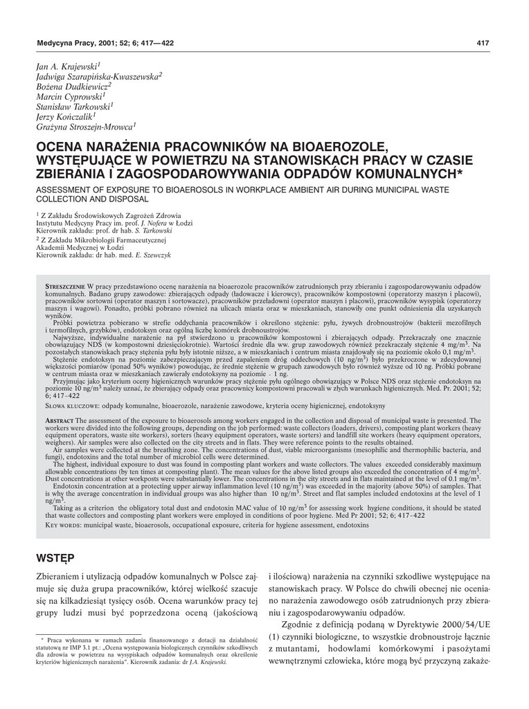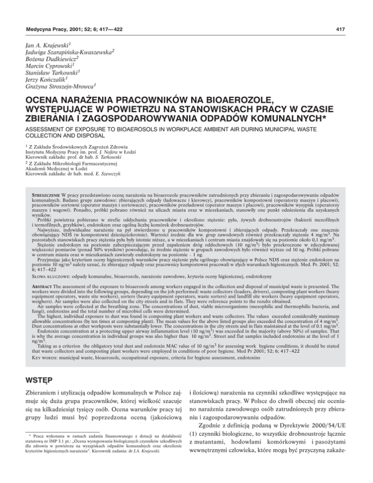 Medycyna Pracy, 2001; 52; 6; 417— 422 417 Jan A. Krajewski1 Jadwiga Szarapińska-Kwaszewska2 Bożena Dudkiewicz2 Marcin Cyprowski1 Stanisław Tarkowski1 Jerzy Kończalik1 Grażyna Stroszejn-Mrowca1 OCENA NARA¯ENIA PRACOWNIKÓW NA BIOAEROZOLE, WYSTÊPUJ¥CE W POWIETRZU NA STANOWISKACH PRACY W CZASIE ZBIERANIA I ZAGOSPODAROWYWANIA ODPADÓW KOMUNALNYCH* ASSESSMENT OF EXPOSURE TO BIOAEROSOLS IN WORKPLACE AMBIENT AIR DURING MUNICIPAL WASTE COLLECTION AND DISPOSAL 1 Z Zakładu Środowiskowych Zagrożeń Zdrowia Instytutu Medycyny Pracy im. prof. J. Nofera w Łodzi Kierownik zakładu: prof. dr hab. S. Tarkowski 2 Z Zakładu Mikrobiologii Farmaceutycznej Akademii Medycznej w Łodzi Kierownik zakładu: dr hab. med. E. Szewczyk STRESZCZENIE W pracy przedstawiono ocenę narażenia na bioaerozole pracowników zatrudnionych przy zbieraniu i zagospodarowywaniu odpadów komunalnych. Badano grupy zawodowe: zbierających odpady (ładowacze i kierowcy), pracowników kompostowni (operatorzy maszyn i placowi), pracowników sortowni (operator maszyn i sortowacze), pracowników przeładowni (operator maszyn i placowi), pracowników wysypisk (operatorzy maszyn i wagowi). Ponadto, próbki pobrano również na ulicach miasta oraz w mieszkaniach, stanowiły one punkt odniesienia dla uzyskanych wyników. Próbki powietrza pobierano w strefie oddychania pracowników i określono stężenie: pyłu, żywych drobnoustrojów (bakterii mezofilnych i termofilnych, grzybków), endotoksyn oraz ogólną liczbę komórek drobnoustrojów. Najwyższe, indywidualne narażenie na pył stwierdzono u pracowników kompostowni i zbierających odpady. Przekraczały one znacznie obowiązujący NDS (w kompostowni dziesięciokrotnie). Wartości średnie dla ww. grup zawodowych również przekraczały stężenie 4 mg/m3. Na pozostałych stanowiskach pracy stężenia pyłu były istotnie niższe, a w mieszkaniach i centrum miasta znajdowały się na poziomie około 0,1 mg/m3. Stężenie endotoksyn na poziomie zabezpieczającym przed zapaleniem dróg oddechowych (10 ng/m3) było przekroczone w zdecydowanej większości pomiarów (ponad 50% wyników) powodując, że średnie stężenie w grupach zawodowych było również wyższe od 10 ng. Próbki pobrane w centrum miasta oraz w mieszkaniach zawierały endotoksyny na poziomie ~ 1 ng. Przyjmując jako kryterium oceny higienicznych warunków pracy stężenie pyłu ogólnego obowiązujący w Polsce NDS oraz stężenie endotoksyn na poziomie 10 ng/m3 należy uznać, że zbierający odpady oraz pracownicy kompostowni pracowali w złych warunkach higienicznych. Med. Pr. 2001; 52; 6; 417–422 Słowa kluczowe: odpady komunalne, bioaerozole, narażenie zawodowe, kryteria oceny higienicznej, endotoksyny ABSTRACT The assessment of the exposure to bioaerosols among workers engaged in the collection and disposal of municipal waste is presented. The workers were divided into the following groups, depending on the job performed: waste collectors (loaders, drivers), composting plant workers (heavy equipment operators, waste site workers), sorters (heavy equipment operators, waste sorters) and landfill site workers (heavy equipment operators, weighers). Air samples were also collected on the city streets and in flats. They were reference points to the results obtained. Air samples were collected at the breathing zone. The concentrations of dust, viable microorganisms (mesophilic and thermophilic bacteria, and fungi), endotoxins and the total number of microbiol cells were determined. The highest, individual exposure to dust was found in composting plant workers and waste collectors. The values exceeded considerably maximum allowable concentrations (by ten times at composting plant). The mean values for the above listed groups also exceeded the concentration of 4 mg/m3. Dust concentrations at other workposts were substantially lower. The concentrations in the city streets and in flats maintained at the level of 0.1 mg/m3. Endotoxin concentration at a protecting upper airway inflammation level (10 ng/m3) was exceeded in the majority (above 50%) of samples. That is why the average concentration in individual groups was also higher than 10 ng/m3. Street and flat samples included endotoxins at the level of 1 ng/m3. Taking as a criterion the obligatory total dust and endotoxin MAC value of 10 ng/m3 for assessing work hygiene conditions, it should be stated that waste collectors and composting plant workers were employed in conditions of poor hygiene. Med Pr 2001; 52; 6; 417–422 Key words: municipal waste, bioaerosols, occupational exposure, criteria for hygiene assessment, endotoxins WSTÊP Zbieraniem i utylizacją odpadów komunalnych w Polsce zajmuje się duża grupa pracowników, której wielkość szacuje się na kilkadziesiąt tysięcy osób. Ocena warunków pracy tej grupy ludzi musi być poprzedzona oceną (jakościową * Praca wykonana w ramach zadania finansowanego z dotacji na działalność statutową nr IMP 3.1 pt.: „Ocena występowania biologicznych czynników szkodliwych dla zdrowia w powietrzu na wysypiskach odpadów komunalnych oraz określenie kryteriów higienicznych narażenia”. Kierownik zadania: dr J.A. Krajewski. i ilościową) narażenia na czynniki szkodliwe występujące na stanowiskach pracy. W Polsce do chwili obecnej nie oceniano narażenia zawodowego osób zatrudnionych przy zbieraniu i zagospodarowywaniu odpadów. Zgodnie z definicją podaną w Dyrektywie 2000/54/UE (1) czynniki biologiczne, to wszystkie drobnoustroje łącznie z mutantami, hodowlami komórkowymi i pasożytami wewnętrznymi człowieka, które mogą być przyczyną zakaże- 418 J.A. Krajewski i wsp. nia, alergii lub działania toksycznego. Drobnoustroje wg tej Dyrektywy oznaczają samodzielną jednostkę mikrobiologiczną, komórkową lub składającą się ze struktur komórkopodobnych, zdolną do autoreprodukcji lub przenoszenia materiału genetycznego. Czynniki biologiczne są istotnym składnikiem pyłu 