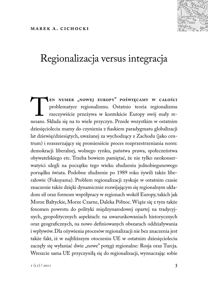 MAREK A . CICHOCKI Regionalizacja versus integracja T en numer „Nowej Europy” poświęcamy w całości problematyce regionalizmu. Ostatnio teoria regionalizmu rzeczywiście przeżywa w kontekście Europy swój mały renesans. Składa się na to wiele przyczyn. Przede wszystkim w ostatnim dziesięcioleciu mamy do czynienia z fiaskiem paradygmatu globalizacji lat dziewięćdziesiątych, uważanej za wychodzący z Zachodu (jako centrum) i rozszerzający się promieniście proces rozprzestrzeniania norm: demokracji liberalnej, wolnego rynku, państwa prawa, społeczeństwa obywatelskiego etc. Trzeba bowiem pamiętać, że nie tylko neokonserwatyści ulegli na początku tego wieku złudzeniu jednobiegunowego porządku świata. Podobne złudzenie po 1989 roku żywili także liberałowie (Fukuyama). Problem regionalizacji zyskuje w ostatnim czasie znaczenie także dzięki dynamicznie rozwijającym się regionalnym układom sił oraz formom współpracy w regionach wokół Europy, takich jak Morze Bałtyckie, Morze Czarne, Daleka Północ. Wiąże się z tym także fenomen powrotu do polityki międzynarodowej opartej na tradycyjnych, geopolitycznych aspektach: na uwarunkowaniach historycznych oraz geograficznych, na nowo definiowanych obszarach oddziaływania i wpływów. Dla ożywienia procesów regionalizacji nie bez znaczenia jest także fakt, iż w najbliższym otoczeniu UE w ostatnim dziesięcioleciu zaczęły się wyłaniać dwie „nowe” potęgi regionalne: Rosja oraz Turcja. Wreszcie sama UE przyczyniłą się do regionalizacji, wyznaczając sobie 1 (11) / 2011 3 MAREK A. CICHOCKI rolę aktora na scenie polityki międzynarodowej – przede wszystkim dzięki polityce sąsiedztwa (pierwotnie projektowanej jeszcze zgodnie ze starym paradygmatem globalizacji lat dziewięćdziesiątych), ulegającej stopniowej fragmentaryzacji pod presją dynamicznych zmian w europejskim otoczeniu. PARADOKS REGIONALIZMU W KONTEKŚCIE UE Z jednej strony regionalizacja – tj. prowadzenie i planowanie polityki państw przez pryzmat regionalnego układu sił – może być traktowana jako dowód rozpadu wspólnotowego europejskiego porządku w wydaniu UE, jako poddanie się niebezpiecznym procesom fragmentaryzacji, jako powrót do myślenia w kategoriach geopolitycznego realizmu, sfer wpływów i gry regionalnych potęg, prymatu geografii i historii w polityce (tzw. strategic death). Mówiąc krótko: jako sposób myślenia i działania idący pod prąd idei europejskiej integracji. Z drugiej strony trudno nie zauważyć, że teoria regionalizacji stała się bardzo ważna dla uzasadnienia racji bytu samej integracji europejskiej. Regionalizacja jest przecież szczególną formą współpracy, która stwarza warunki dla głębszej zinstytucjonalizowanej integracji oraz pojawienia się wspólnej, transnarodowej tożsamości. W ten sposób powstają np. regionalne środowiska lub kompleksy bezpieczeństwa, o których pisze R. Bengtsson (w niniejszym numerze NE). Z tego punktu widzenia UE sama jest efektem regionalizacji współczesnego świata i stanowi po prostu jeden z wielu (nawet jeśli bardzo szczególny czy wręcz niepowtarzalny) supranarodowy region. Jak więc jest naprawdę? Czy regionalizacja stanowi zagrożenie dla współczesnej integracji i oznacza powrót do polityki z pozycji siły czy też ukierunkowanej na historię i geografię, a więc do tego wszystkiego, z czym wspólnotowy, uniwersalny system ponowoczesnego rządzenia w UE miał zrobić w końcu porządek? Czy też odwrotnie: regionalizacja sama jest motorem napędzającym proces integracji europejskiej, która 4 wstęp będzie rozwijać się o tyle, o ile Europejczycy zachowają zdolność do definiowania Europy w porządku światowym jako regionu o własnej regionalnej tożsamości, instytucjonalnej strukturze współpracy, a także o sile pozwalającej na ustawienie się w roli samodzielnego aktora politycznego na scenie międzynarodowej? Niektórzy teoretycy globalizacji, integracji i regionalizacji powiedzą, że jest to pozorny paradoks, bowiem procesy te są ze sobą dialektycznie sprzęgnięte. Regionalizacja oznacza integrację, która zawiera w sobie warunki fragmentaryzacji, prowadzące z kolei do powstawania nowych regionalnych dynamik1. Wydaje się jednak, że gwoli klarowności powinniśmy uporządkować przynajmniej podstawową kategoryzację pojęcia. POJĘCIE REGIONU Konkurencyjne wobec państwa pojęcie regionalizmu Znana formuła Deutscha dotycząca definicji regionu na początku nie napawa zbyt dużym optymizmem. Stwierdza on, że „dla politologa zdefiniowanie regionu jest zasadniczo trudniejsze niż znalezienie definicji dla róży przez Edytę Stein. Nie możemy po prostu powiedzieć, że region jest regionem regionu”2. Jednak sytuacja nie jest aż tak beznadziejna. Należy bowiem zgodzić się z L. van Langenhovenem3, że kluczowe dla zrozumienia regionu – jako kategorii i rzeczywistości – jest państwo. To w odniesieniu do niego możemy łatwo rozróżnić kategorie regionów: 1) supranarodowe regiony, takie jak UE, które ze względu na konieczność sprostania globalnym wyzwaniom wyrastają ponad państwa; 2) regiony transgraniczne, powstające na poziomie międzypaństwowym i łączące lokalne jednostki wchodzące w skład różnych państw; 3) wreszcie subnarodowe regiony – posiadające legislacyjną i administracyjną autonomię lub nie – takie jak niemieckie landy czy Walonia, Flandria lub Katalonia. Osią tego podziału jest zawsze 1 (11) / 2011 5 MAREK A. CICHOCKI państwo, ocena jego wartości, stosunek do jego funkcjonowania, opinia na temat jego aktualnej pozycji w historycznym procesie. Takie ujęcie regionalizacji wiąże się z fenomenem integracji europejskiej, pozostającym we wzajemnym napięciu wobec zjawiska nowożytnego państwa. Znajduje to wyraz w pojęciu „regionifikacji”, regiony są bowiem produktem procesu „regionifikacji”4. Taki proces regionalnej integracji zakład