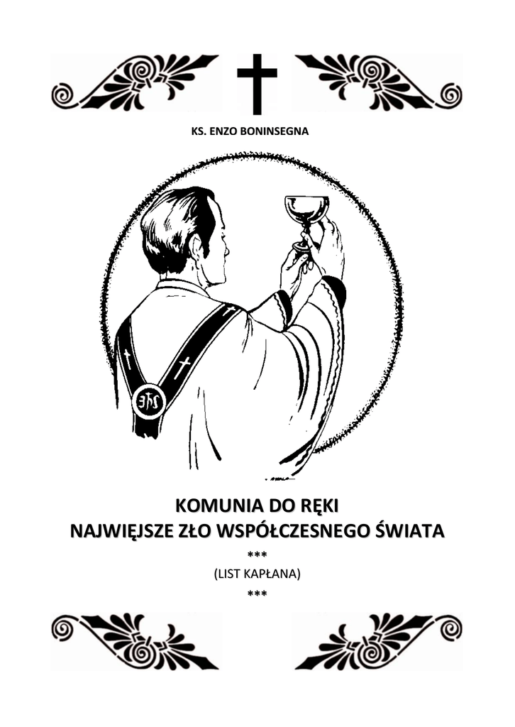KS. ENZO BONINSEGNA KOMUNIA DO RĘKI NAJWIĘJSZE ZŁO WSPÓŁCZESNEGO ŚWIATA *** (LIST KAPŁANA) *** SŁOWO WSTĘPNE: PRZESŁANIE DANE LOUISE STARR TOMKIEL: 16 maja 2004 o godz. 10.15. …“Nikt inny, tylko Mój kapłan, którego ręce są Mnie i przeze Mnie konsekrowane, ma dotykad Mojego Ciała, Hostii!!! przyjmujcie mnie godnie z duszą w stanie łaski i nie bierzcie mnie w swoje ręce! Jestem waszym Bogiem, Zbawicielem, Odkupicielem. JA JESTEM JEZUS!”… *** OJCIEC JOHN PIERRICONE Z PARAFII ŚW. AGNIESZKI W NOWYM JORKU CZĘSTO ODPRAWIAŁ MSZĘ ŚWIĘTĄ DLA SIÓSTR MISJONAREK MIŁOŚCI MATKI TERESY: Wielokrotnie spotkał on osobiście Matkę Teresę. Spytał ją kiedyś jako osobę podróżującą po całym świecie, co uważa za największe zło współczesnego świata. Bez zastanowienia odpowiedziała: „KOMUNIĘ NA RĘKĘ”. *** KSIĄŻKA OJCA BONAWENTURY MEYERA –„OSTRZEŻENIE Z ZAŚWIATÓW“ SZOKUJĄCE WYZNANIE UPADŁEGO DEMONA AKABORA PODCZAS EGZORCYZMU W SPRAWIE KOMUNI NA RĘKĘ: Egzorcysta: Mów tylko prawdę w Imieniu Najdroższej Krwi, Krzyża św. Niepokalanego Poczęcia z Lourdes, Królowej Różaoca św. z Fatimy...! Demon Akabor: Naradzaliśmy się tam w dole długo (wskazuje palcem w dół) aż doprowadziliśmy do Komunii na rękę. Komunia na rękę... Komunia na rękę jest bardzo dobra dla nas w piekle — wierzcie mi... Egzorcysta: ...Rozkazujemy ci w Imię... powiedzied co ci tylko Niebo rozkazuje! Mów tylko prawdę i całą prawdę. Ty nie śmiesz kłamad! Demon Akabor: Ona (N.M.P.) wskazuje palcem w Górę chce abym powiedział... Egzorcysta: Mów prawdę w Imię... Demon Akabor: Ona (N.M.P.) chce abym powiedział, gdyby Ona, ta wysoka Pani jeszcze żyła tu na ziemi to przyjmowałaby Komunię świętą do ust, ale klęcząc i skłoniła by się głęboko i to tak (pokazuje jakby się skłoniła). Egzorcysta: W Imieniu Matki Bożej... i Tronów, z polecenia Tronów mów prawdę! Demon Akabor: Muszę powiedzied, że Komunię na rękę, właściwie nie wolno przyjmowad; nawet sam Papież udziela Komunii do ust. On (Papież) wcale tego nie chce, aby udzielano i przyjmowano Komunię na rękę. To pochodzi od jego kardynałów... 2 WSTĘP W grudniu 1989 r. Konferencja Episkopatu włoskiego wydała zarządzenie zaaprobowane przez Stolicę Apostolską, dotyczące udzielania we Włoszech Eucharystii świętej do rąk wiernych. Organizacja Una Voce Italia zwróciła uwagę, że nieznane są prawdziwe motywy wprowadzenia prawa w przeszłości zakazanego. Oto główne argumenty sformułowane przez Una Voce Italia: Praktyka tego typu: 1. Jest przeciwna ponad tysiącletniej tradycji; 2. Przeciwstawia się mądrości Kościoła, który dawno ją odrzucił; 3. Została potępiona w encyklice Mediator Dei, jako przejaw „archeologizmu“ w liturgii; 4. Jest zamachem na wrażliwośd i zmysł Wiary u wiernych, szokując prawowiernych katolików; 5. Może byd powodem konfliktu między kapłanem a świeckim szafarzem; 6. Jest sprzeczna z istotą autentycznego i zdrowego ekumenizmu; 7. Przyczynia się do profanacji, ułatwia swiętokradztwo. KOMUNIA DO RĘKI NAJWIĘJSZE ZŁO WSPÓŁCZESNEGO ŚWIATA LIST OTWARTY O POWODACH PEWNEJ ODMOWY Do mojego Biskupa, Jego Ekscelencji Giuseppe Amari, Biskupa Werony Czcigodny Ojcze! Niniejszym powiadamiam Ojca o bolesnym wyborze, jakiego muszę dokonad, a do jakiego zobowiązuje mnie sumienie. Moja decyzja nie dojrzała niespodziewanie. Jest owocem bolesnych przemyśleo, które są moim udziałem od maja, kiedy to biskupi włoscy skierowali do Papieża formalną prośbę o to, by również we Włoszech dano możliwośd przyjmowania Eucharystii do ręki. Oto mój wybór: Dnia 2 grudnia, kiedy to ze Mszą przedświąteczną pierwszej niedzieli Adwentu wchodzi w życie owo rozporządzenie, nieodwołalnie podaję się do dymisji z posługi wikariusza, którą od lat piętnastu spełniam w parafii Najświętszej Maryi Panny Niepokalanej, i zgłaszam Ojcu moją niedyspozycyjnośd do przyjęcia posługi w innych miejscach, gdzie istnieje chodby tylko ryzyko, że będzie trzeba dawad wiernym Eucharystię do rąk. 3 Nie zmienia to faktu, że niewzruszony pozostaje mój zamiar dalszego spełniania posługi kapłaoskiej, a Panu Bogu dziękuję, że mnie do niej powołał. Chciałem na początku zaznaczyd, że nie chodzi o wybór uczuciowy, ale przemyślany i rozważony w świetle Wiary. Istnieją obiektywne powody, które mnie zobowiązują do podjęcia kierunku, jaki przyjąłem. 1) Dając wiernym Eucharystię do rąk, sprawiamy, że wielu z nich lekceważąc wskazówkę, aby konsekrowaną Hostię spożywad przed kapłanem, wracając na miejsce rozsiewają Jej cząstki po podłodze kościoła. Czy te cząstki są duże, czy małe, czy jest ich wiele, czy mało, nie zmienia to istoty skandalu, że systematycznie dokonuje się profanacja Ciała Paoskiego! Czy wprowadzając ten nowy sposób udzielania Eucharystii, Kościół pozostaje w zgodzie z nakazem Kodeksu Prawa Kanonicznego (kan. 898): „Wierni powinni z największym szacunkiem odnosid się do Najświętszej Eucharystii,... z największą pobożnością i często przyjmując ten sakrament i adorując Go z najwyższą czcią (...)”? Upadło poczucie rzeczywistości świętej i już otwarcie lekceważy się systematycznie inne normy Kościoła dotyczące Eucharystii. Łatwo przewidzied, że wielu wiernych stopniowo dojdzie do spożywania Eucharystii z taką swobodą, z jaką na poczęstunku braliby coś do zjedzenia. 2) Wszyscy kapłani z doświadczenia wiedzą, że przy rodzaju chleba, z jakiego są wypiekane hostie, po udzieleniu Eucharystii na palcach prawie zawsze pozostają cząstki Chleba konsekrowanego. Właśnie dlatego po Komunii świętej odbywa się puryfikacja palców, aby nawet najmniejsza cząstka nie została zgubiona, a to w duchu należnego szacunku uwielbienia dla Ciała Paoskiego. W „Ogólnym wprowadzeniu do Mszału rzymskiego“ w nr. 237 czytamy: „IIekrod przylgnie 