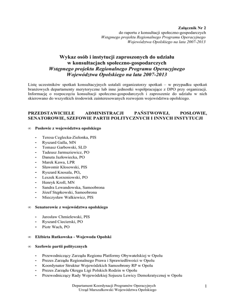 Załącznik Nr 2 do raportu z konsultacji społeczno-gospodarczych Wstępnego projektu Regionalnego Programu Operacyjnego Województwa Opolskiego na lata 2007-2013 Wykaz osób i instytucji zaproszonych do udziału w konsultacjach społeczno-gospodarczych Wstępnego projektu Regionalnego Programu Operacyjnego Województwa Opolskiego na lata 2007-2013 Listę uczestników spotkań konsultacyjnych ustalali organizatorzy spotkań – w przypadku spotkań branżowych departamenty merytoryczne lub inne jednostki współpracujące z DPO przy organizacji. Informację o rozpoczęciu konsultacji społeczno-gospodarczych i zaproszenie do udziału w nich skierowano do wszystkich środowisk zainteresowanych rozwojem województwa opolskiego. PRZEDSTAWICIELE ADMINISTRACJI PAŃSTWOWEJ, POSŁOWIE, SENATOROWIE, SZEFOWIE PARTII POLITYCZNYCH I INNYCH INSTYTUCJI • Posłowie z województwa opolskiego - • Teresa Ceglecka-Zielonka, PIS Ryszard Galla, MN Tomasz Garbowski, SLD Tadeusz Jarmuziewicz, PO Danuta Jazłowiecka, PO Marek Kawa, LPR Sławomir Kłosowski, PIS Ryszard Knosala, PO, Leszek Korzeniowski, PO Henryk Kroll, MN Sandra Lewandowska, Samoobrona Józef Stępkowski, Samoobrona Mieczysław Walkiewicz, PIS Senatorowie z województwa opolskiego - - Jarosław Chmielewski, PIS Ryszard Ciecierski, PO Piotr Wach, PO • Elżbieta Rutkowska - Wojewoda Opolski • Szefowie partii politycznych - Przewodniczący Zarządu Regionu Platformy Obywatelskiej w Opolu Prezes Zarządu Regionalnego Prawa i Sprawiedliwości w Opolu Koordynator Struktur Wojewódzkich Samoobrony RP w Opolu Prezes Zarządu Okręgu Ligi Polskich Rodzin w Opolu Przewodniczący Rady Wojewódzkiej Sojuszu Lewicy Demokratycznej w Opolu Departament Koordynacji Programów Operacyjnych Urząd Marszałkowski Województwa Opolskiego 1 • Przewodniczący Towarzystwa Społeczno-Kulturalnego Niemców na Śląsku Opolskim Mniejszość Niemiecka w Opolu Przewodniczący Opolskiego Zarządu Wojewódzkiego Polskiego Stronnictwa Ludowego w Opolu Przewodniczący Zarządu Wojewódzkiego Socjaldemokracji PL w Opolu Przewodniczący Rady Wojewódzkiej Unii Pracy w Opolu Przewodniczący Stronnictwa Gospodarczego w Opolu Przewodniczący Stowarzyszenia Ordynacka - Okręgu w Opolu Przedstawiciele innych instytucji - - Prezes Zarządu Wojewódzkiego Funduszu Ochrony Środowiska i Gospodarki Wodnej w Opolu Opolski Wojewódzki Komendant Policji Opolski Komendant Wojewódzki Państwowej Straży Pożarnej w Opolu • Członkowie Regionalnego Komitetu Sterującego ds. Rozwoju Regionu • Członkowie Komisji konsultacyjnej programu współpracy województwa opolskiego z podmiotami prowadzącymi działalność pożytku publicznego PRZEDSTAWICIELE JEDNOSTEK SAMORZĄDU TERYTORIALNEGO • Radni Województwa Opolskiego • Starostowie Powiatów Województwa Opolskiego - • Starosta Powiatu Brzeskiego Starosta Powiatu Głubczyckiego Starosta Powiatu Kędzierzyńsko-Kozielskiego Starosta Powiatu Kluczborskiego Starosta Powiatu Krapkowickiego Starosta Powiatu Namysłowskiego Starosta Powiatu Nyskiego Starosta Powiatu Oleskiego Starosta Powiatu Opolskiego Ziemskiego Starosta Powiatu Prudnickiego Starosta Powiatu Strzeleckiego Prezydenci, Burmistrzowie, Wójtowie Miast i Gmin Województwa Opolskiego - Burmistrz Miasta i Gminy Baborów Burmistrz Miasta i Gminy Biała Wójt Gminy Bierawa Wójt Gminy Branice Burmistrz Miasta Brzeg Burmistrz Miasta i Gminy Byczyna Wójt Gminy Chrząstowice Wójt Gminy Cisek Wójt Gminy Dąbrowa Departament Koordynacji Programów Operacyjnych Urząd Marszałkowski Województwa Opolskiego 2 - - - - - Burmistrz Miasta i Gminy Dobrodzień Wójt Gminy Dobrzeń Wielki Wójt Gminy Domaszowice Burmistrz Miasta i Gminy Głogówek Burmistrz Miasta i Gminy Głubczyce Burmistrz Miasta i Gminy Głuchołazy Burmistrz Miasta i Gminy Gogolin Burmistrz Miasta i Gminy Gorzów Śląski Burmistrz Miasta I Gminy Grodków Wójt Gminy Izbicko Wójt Gminy Jemielnica Wójt Gminy Kamiennik Prezydent Miasta Kędzierzyn-Koźle Burmistrz Miasta i Gminy Kietrz Burmistrz Miasta i Gminy Kluczbork Sekretarz Miasta i Gminy Kolonowskie Wójt Gminy Komprachcice Burmistrz Miasta i Gminy Korfantów Burmistrz Miasta i Gminy Krapkowice Wójt Gminy Lasowice Wielkie Burmistrz Miasta i Gminy Leśnica Burmistrz Miasta i Gminy Lewin Brzeski Wójt Gminy Lubrza Wójt Gminy Lubsza Wójt Gminy Łambinowice Wójt Gminy Łubniany Wójt Gminy Murów Burmistrz Miasta i Gminy Namysłów Burmistrz miasta i Gminy Niemodlin Burmistrz Miasta i Gminy Nysa Burmistrz Miasta i Gminy Olesno Wójt Gminy Olszanka Prezydent Miasta Opole Burmistrz Miasta i Gminy Otmuchów Burmistrz Miasta i Gminy Ozimek Burmistrz Miasta i Gminy Paczków Wójt Gminy Pakosławice Wójt Gminy Pawłowiczki Wójt Gminy Pokój Wójt Gminy Polska Cerekiew Wójt Gminy Popielów Burmistrz Miasta i Gminy Praszka Burmistrz Miasta i Gminy Prószków Burmistrz Miasta i Gminy Prudnik Wójt Gminy Radłów Wójt Gminy Reńska Wieś Wójt Gminy Rudniki Wójt Gminy Skoroszyce Wójt Gminy Skarbimierz Burmistrz Miasta i Gminy Strzelce Opolskie Wójt Gminy Strzeleczki Wójt Gminy Świerczów Wójt Gminy Tarnów Opolski Wójt Gminy Tułowice Departament Koordynacji Programów Operacyjnych Urząd Marszałkowski Województwa Opolskiego 3 - • Związki i stowarzyszenia samorządowe województwa opolskiego - • Wójt Gminy Turawa Burmistrz Miasta i Gminy Ujazd Wójt Gminy Walce Wójt Gminy Wilków Burmistrz Miasta i Gminy Wołczyn Burmistrz Miasta i Gminy Zawadzkie Burmistrz Miasta i Gminy Zdzieszowice Wójt Gminy Zębowice Przewodniczący Związku Gmin Aqua Silesia Prezes Zarządu Związku Gmin Dolna Mała Panew Przewodniczący Zgromadzenia Związku Gmin Śląska Opolskiego Przewodniczący Zarządu Związku Gmin Prokado Przewodniczący Zarządu Związku Wodno- Ściekowego Ligota Dolna Przewodniczący Związku Miast i Gmin Źródła Rzeki Prosny Prezes Związku Międzygminnego Inwestkom Prezes Zarządu Związku Gmin Śląska Opolskiego Przewodniczący Zgromad