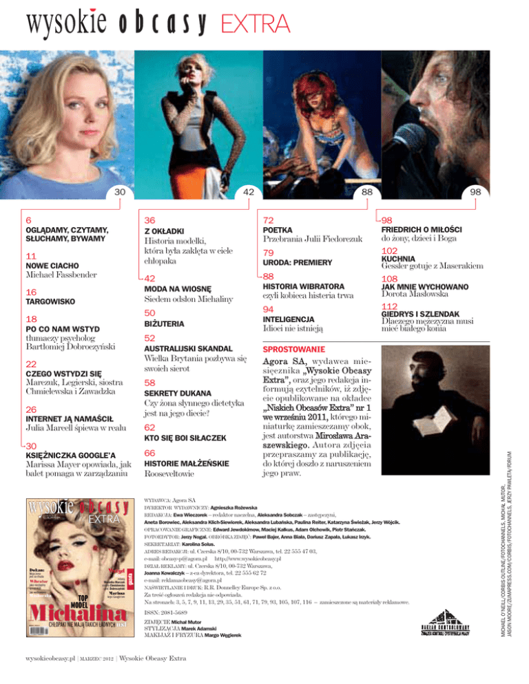 42 88 98 6 36 72 98 OGLĄDAMY, CZYTAMY, SŁUCHAMY, BYWAMY Z OKŁADKI Historia modelki, która była zaklęta w ciele chłopaka POETKA Przebrania Julii Fiedorczuk FRIEDRICH O MIŁOŚCI do żony, dzieci i Boga 79 102 URODA: PREMIERY KUCHNIA Gessler gotuje z Maserakiem 42 88 108 11 NOWE CIACHO Michael Fassbender 16 TARGOWISKO 18 PO CO NAM WSTYD tłumaczy psycholog Bartłomiej Dobroczyński 22 CZEGO WSTYDZI SIĘ Marczuk, Legierski, siostra Chmielewska i Zawadzka 26 INTERNET JĄ NAMAŚCIŁ Julia Marcell śpiewa w realu MODA NA WIOSNĘ Siedem odsłon Michaliny HISTORIA WIBRATORA czyli kobieca histeria trwa 50 94 INTELIGENCJA Idioci nie istnieją BIŻUTERIA 52 AUSTRALIJSKI SKANDAL Wielka Brytania pozbywa się swoich sierot 58 SEKRETY DUKANA Czy żona słynnego dietetyka jest na jego diecie? 62 KTO SIĘ BOI SIŁACZEK 30 KSIĘŻNICZKA GOOGLE’A Marissa Mayer opowiada, jak balet pomaga w zarządzaniu 66 HISTORIE MAŁŻEŃSKIE Rooseveltowie JAK MNIE WYCHOWANO Dorota Masłowska 112 GIEDRYS I SZLENDAK Dlaczego mężczyzna musi mieć białego konia SPROSTOWANIE Agora SA, wydawca miesięcznika „Wysokie ysokie Obcasy Extra”, oraz jego redakcja informują czytelników, iż zdjęcie opublikowane na okładce „Niskich Obcasów Extra” nr 1 we wrześniu 2011, którego miniaturkę zamieszczamy obok, jest autorstwa Mirosława Araszewskiego. Autora zdjęcia przepraszamy za publikację, do której doszło z naruszeniem jego praw. WYDAWCA: Agora SA DYREKTOR WYDAWNICZY: Agnieszka Rożewska REDAKCJA: Ewa Wieczorek – redaktor naczelna, Aleksandra Sobczak – zastępczyni, wysokieobcasy.pl NR 1 (10) MARZEC 2012 cena 6,99 zł (w tym 8% VAT) Aneta Borowiec, Aleksandra Klich-Siewiorek, Aleksandra Lubańska, Paulina Reiter, Katarzyna Świeżak, Jerzy Wójcik. OPRACOWANIE GRAFICZNE: Edward Jewdokimow, Maciej Kałkus, Adam Olchowik, Piotr Stańczak. FOTOEDYTOR: Jerzy Nogal. OBRÓBKA ZDJĘĆ: Paweł Bajer, Anna Biała, Dariusz Zapała, Łukasz Irzyk. SEKRETARIAT: Karolina Solus. ADRES REDAKCJI: ul. Czerska 8/10, 00-732 Warszawa, tel. 22 555 47 03, e-mail: [email protected] Wstyd to… Dukan: Moja żona jest za chuda mówią Weronika Marczuk siostra Chmielewska i prof. Dobroczyński Wibrator jako niezbędny sprzęt AGD Jak wychowano Masłowską TOP MODEL Marissa kręci Google’em Michalina Indeks: 263214 CHŁOPAKI NIE MAJĄ TAKICH ŁADNYCH ust http://www.wysokieobcasy.pl DZIAŁ REKLAMY: ul. Czerska 8/10, 00-732 Warszawa, Joanna Kowalczyk – z-ca dyrektora, tel. 22 555 62 72 e-mail: [email protected] NAŚWIETLANIE I DRUK: R.R. Donnelley Europe Sp. z o.o. Za treść ogłoszeń redakcja nie odpowiada. Na stronach: 3, 5, 7, 9, 11, 13, 29, 35, 51, 61, 71, 79, 93, 105, 107, 116 – zamieszczone są materiały reklamowe. ISSN: 2081-5689 ZDJĘCIE Michał Mutor STYLIZACJA Marek Adamski MAKIJAŻ I FRYZURA Margo Węgierek wysokieobcasy.pl | MARZEC 2012 | Wysokie Obcasy Extra MICHAEL O'NEILL/CORBIS OUTLINE/FOTOCHANNELS, MICHAŁ MUTOR, JASON MOORE/ZUMAPRESS.COM/CORBIS/FOTOCHANNELS, JERZY PAWLETA/FORUM 30