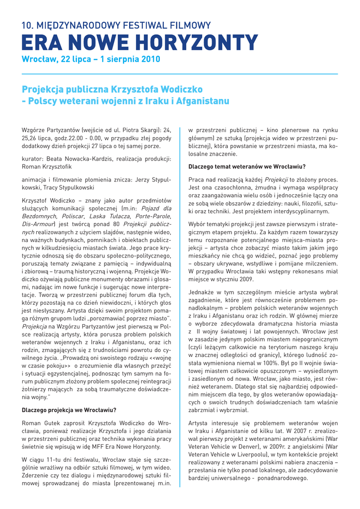 Projekcja publiczna Krzysztofa Wodiczko - Polscy weterani wojenni z Iraku i Afganistanu Wzgórze Partyzantów (wejście od ul. Piotra Skargi): 24, 25,26 lipca, godz.22.00 - 0.00, w przypadku złej pogody dodatkowy dzień projekcji 27 lipca o tej samej porze. kurator: Beata Nowacka-Kardzis, realizacja produkcji: Roman Krzysztofik animacja i filmowanie płomienia znicza: Jerzy Stypulkowski, Tracy Stypulkowski Krzysztof Wodiczko – znany jako autor przedmiotów służących komunikacji społecznej (m.in: Pojazd dla Bezdomnych, Poliscar, Laska Tułacza, Porte-Parole, Dis-Armour) jest twórcą ponad 80 Projekcji publicznych realizowanych z użyciem slajdów, następnie wideo, na ważnych budynkach, pomnikach i obiektach publicznych w kilkudziesięciu miastach świata. Jego prace krytycznie odnoszą się do obszaru społeczno-politycznego, poruszają tematy związane z pamięcią – indywidualną i zbiorową – traumą historyczną i wojenną. Projekcje Wodiczko ożywiają publiczne monumenty obrazami i głosami, nadając im nowe funkcje i sugerując nowe interpretacje. Tworzą w przestrzeni publicznej forum dla tych, którzy pozostają na co dzień niewidoczni, i których głos jest niesłyszany. Artysta dzięki swoim projektom pomaga różnym grupom ludzi „porozmawiać poprzez miasto”. Projekcja na Wzgórzu Partyzantów jest pierwszą w Polsce realizacją artysty, która porusza problem polskich weteranów wojennych z Iraku i Afganistanu, oraz ich rodzin, zmagających się z trudnościami powrotu do cywilnego życia. „Prowadzą oni swoistego rodzaju <<wojnę w czasie pokoju>> o zrozumienie dla własnych przeżyć i sytuacji egzystencjalnej, podnosząc tym samym na forum publicznym złożony problem społecznej reintegracji żołnierzy mających za sobą traumatyczne doświadczenia wojny.” Dlaczego projekcja we Wrocławiu? Roman Gutek zaprosił Krzysztofa Wodiczko do Wrocławia, ponieważ realizacje Krzysztofa i jego działania w przestrzeni publicznej oraz technika wykonania pracy świetnie się wpisują w idę MFF Era Nowe Horyzonty. W ciągu 11-tu dni festiwalu, Wrocław staje się szczególnie wrażliwy na odbiór sztuki filmowej, w tym wideo. Zderzenie czy tez dialogu i międzynarodowej sztuki filmowej sprowadzanej do miasta (prezentowanej m.in. w przestrzeni publicznej – kino plenerowe na rynku głównym) ze sztuką (projekcja wideo w przestrzeni publicznej), która powstanie w przestrzeni miasta, ma kolosalne znaczenie. Dlaczego temat weteranów we Wrocławiu? Praca nad realizacją każdej Projekcji to złożony proces. Jest ona czasochłonna, żmudna i wymaga współpracy oraz zaangażowania wielu osób i jednocześnie łączy ona ze sobą wiele obszarów z dziedziny: nauki, filozofii, sztuki oraz techniki. Jest projektem interdyscyplinarnym. Wybór tematyki projekcji jest zawsze pierwszym i strategicznym etapem projektu. Za każdym razem towarzyszy temu rozpoznanie potencjalnego miejsca-miasta projekcji – artysta chce zobaczyć miasto takim jakim jego mieszkańcy nie chcą go widzieć, poznać jego problemy – obszary ukrywane, wstydliwe i pomijane milczeniem. W przypadku Wrocławia taki wstępny rekonesans miał miejsce w styczniu 2009. Jednakże w tym szczególnym mieście artysta wybrał zagadnienie, które jest równocześnie problemem ponadlokalnym – problem polskich weteranów wojennych z Iraku i Afganistanu oraz ich rodzin. W głównej mierze o wyborze zdecydowała dramatyczna historia miasta z II wojny światowej i lat powojennych. Wrocław jest w zasadzie jedynym polskim miastem niepogranicznym (czyli leżącym całkowicie na terytorium naszego kraju w znacznej odległości od granicy), którego ludność została wymieniona niemal w 100%. Był po II wojnie światowej miastem całkowicie opuszczonym – wysiedlonym i zasiedlonym od nowa. Wrocław, jako miasto, jest również weteranem. Dlatego stał się najbardziej odpowiednim miejscem dla tego, by głos weteranów opowiadających o swoich trudnych doświadczeniach tam właśnie zabrzmiał i wybrzmiał. Artysta interesuje się problemem weteranów wojen w Iraku i Afganistanie od kilku lat. W 2007 r. zrealizował pierwszy projekt z weteranami amerykańskimi (War Veteran Vehicle w Denver), w 2009r. z angielskimi (War Veteran Vehicle w Liverpoolu), w tym kontekście projekt realizowany z weteranami polskimi nabiera znaczenia – przesłania nie tylko ponad lokalnego, ale zadecydowanie bardziej uniwersalnego - ponadnarodowego. Dlaczego Wzgórze Partyzantów? Ze względu na rolę i funkcje historyczne jakie pełniło. Funkcję reprezentacyjną oraz militarną. Wzgórze Partyzantów to pozostałość po dawnym Bastionie Sakwowym w systemie miejskich fortyfikacji miasta Wrocławia. W II poł. XIX w. miejsce zostało zagospodarowane staraniami Adolfa Leibich i zostało oddane dla spacerów i rozrywki Wrocławian, jako jedno z bardziej reprezentacyjnych i „szykownych” miejsc. Na wzgórzu wznosiła się wieża widokowa, a wśród schodów, tarasów i fontann, funkcjonowały także restauracja, kawiarnia i piwiarnia. Pod koniec II wojny światowej (do marca 1945 r.) w podziemiach mieścił się sztab dowodzenia komendanta twierdzy Wrocław, było to równocześnie jedno z ostatnich miejsc dowództwa niemieckiego miasta w czasie II wojny światowej. Więcej informacji: www.enh.pl Wydarzenie realizowane w ramach projektu pod nazwą „Organizacja wybranych wydarzeń kulturalnych w ramach 10-tej jubileuszowej edycji Międzynarodowego Festiwalu Filmowego ERA NOWE HORYZONTY (MFF ENH) we Wrocławiu”. Projekt współfinansowany przez Unię Europejską ze środków Europejskiego Funduszu Rozwoju Regionalnego w ramach Regionalnego programu Operacyjnego dla Województwa Dolnośląskiego na lata 2007-2013.
