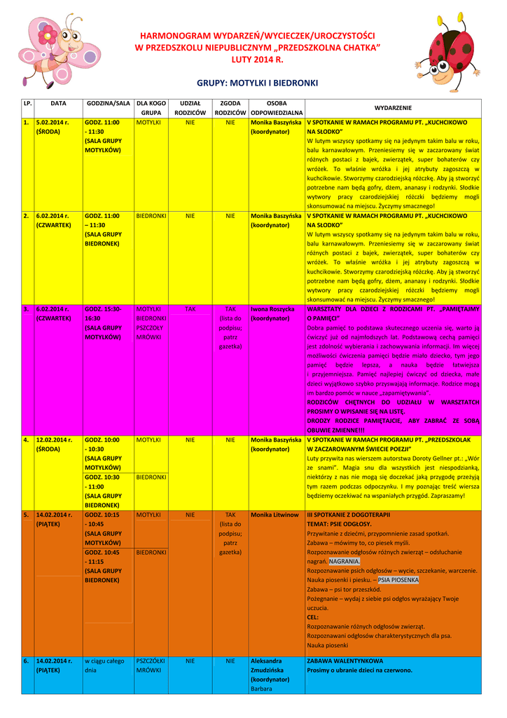 HARMONOGRAM WYDARZEŃ/WYCIECZEK/UROCZYSTOŚCI W PRZEDSZKOLU NIEPUBLICZNYM „PRZEDSZKOLNA CHATKA” LUTY 2014 R. GRUPY: MOTYLKI I BIEDRONKI LP. DATA GODZINA/SALA DLA KOGO GRUPA MOTYLKI UDZIAŁ RODZICÓW NIE 1. 5.02.2014 r. (ŚRODA) GODZ. 11:00 - 11:30 (SALA GRUPY MOTYLKÓW) 2. 6.02.2014 r. (CZWARTEK) GODZ. 11:00 – 11:30 (SALA GRUPY BIEDRONEK) BIEDRONKI NIE 3. 6.02.2014 r. (CZWARTEK) GODZ. 15:3016:30 (SALA GRUPY MOTYLKÓW) MOTYLKI BIEDRONKI PSZCZOŁY MRÓWKI TAK 4. 12.02.2014 r. (ŚRODA) GODZ. 10:00 - 10:30 (SALA GRUPY MOTYLKÓW) GODZ. 10:30 - 11:00 (SALA GRUPY BIEDRONEK) GODZ. 10:15 - 10:45 (SALA GRUPY MOTYLKÓW) GODZ. 10:45 - 11:15 (SALA GRUPY BIEDRONEK) MOTYLKI NIE w ciągu całego dnia PSZCZÓŁKI MRÓWKI 5. 6. 14.02.2014 r. (PIĄTEK) 14.02.2014 r. (PIĄTEK) BIEDRONKI MOTYLKI ZGODA OSOBA WYDARZENIE RODZICÓW ODPOWIEDZIALNA NIE Monika Baszyńska V SPOTKANIE W RAMACH PROGRAMU PT. „KUCHCIKOWO (koordynator) NA SŁODKO” W lutym wszyscy spotkamy się na jedynym takim balu w roku, balu karnawałowym. Przeniesiemy się w zaczarowany świat różnych postaci z bajek, zwierzątek, super bohaterów czy wróżek. To właśnie wróżka i jej atrybuty zagoszczą w kuchcikowie. Stworzymy czarodziejską różczkę. Aby ją stworzyć potrzebne nam będą gofry, dżem, ananasy i rodzynki. Słodkie wytwory pracy czarodziejskiej różczki będziemy mogli skonsumować na miejscu. Życzymy smacznego! NIE Monika Baszyńska V SPOTKANIE W RAMACH PROGRAMU PT. „KUCHCIKOWO (koordynator) NA SŁODKO” W lutym wszyscy spotkamy się na jedynym takim balu w roku, balu karnawałowym. Przeniesiemy się w zaczarowany świat różnych postaci z bajek, zwierzątek, super bohaterów czy wróżek. To właśnie wróżka i jej atrybuty zagoszczą w kuchcikowie. Stworzymy czarodziejską różczkę. Aby ją stworzyć potrzebne nam będą gofry, dżem, ananasy i rodzynki. Słodkie wytwory pracy czarodziejskiej różczki będziemy mogli skonsumować na miejscu. Życzymy smacznego! TAK Iwona Roszycka WARSZTATY DLA DZIECI Z RODZICAMI PT. „PAMIĘTAJMY (lista do (koordynator) O PAMIĘCI” podpisu; Dobra pamięć to podstawa skutecznego uczenia się, warto ją patrz ćwiczyć już od najmłodszych lat. Podstawową cechą pamięci gazetka) jest zdolność wybierania i zachowywania informacji. Im więcej możliwości ćwiczenia pamięci będzie miało dziecko, tym jego pamięć będzie lepsza, a nauka będzie łatwiejsza i przyjemniejsza. Pamięć najlepiej ćwiczyć od dziecka, małe dzieci wyjątkowo szybko przyswajają informacje. Rodzice mogą im bardzo pomóc w nauce „zapamiętywania”. RODZICÓW CHĘTNYCH DO UDZIAŁU W WARSZTATCH PROSIMY O WPISANIE SIĘ NA LISTĘ. DRODZY RODZICE PAMIĘTAJCIE, ABY ZABRAĆ ZE SOBĄ OBUWIE ZMIENNE!!! NIE Monika Baszyńska V SPOTKANIE W RAMACH PROGRAMU PT. „PRZEDSZKOLAK (koordynator) W ZACZAROWANYM ŚWIECIE POEZJI” Luty przywita nas wierszem autorstwa Doroty Gellner pt.: „Wór ze snami”. Magia snu dla wszystkich jest niespodzianką, niektórzy z nas nie mogą się doczekać jaką przygodę przeżyją tym razem podczas odpoczynku. I my poznając treść wiersza będziemy oczekiwać na wspaniałych przygód. Zapraszamy! NIE TAK (lista do podpisu; patrz gazetka) NIE NIE BIEDRONKI Monika Litwinow III SPOTKANIE Z DOGOTERAPII TEMAT: PSIE ODGŁOSY. Przywitanie z dziećmi, przypomnienie zasad spotkań. Zabawa – mówimy to, co piesek myśli. Rozpoznawanie odgłosów różnych zwierząt – odsłuchanie nagrań. NAGRANIA. Rozpoznawanie psich odgłosów – wycie, szczekanie, warczenie. Nauka piosenki i piesku. – PSIA PIOSENKA Zabawa – psi tor przeszkód. Pożegnanie – wydaj z siebie psi odgłos wyrażający Twoje uczucia. CEL: Rozpoznawanie różnych odgłosów zwierząt. Rozpoznawani odgłosów charakterystycznych dla psa. Nauka piosenki Aleksandra Zmudzińska (koordynator) Barbara ZABAWA WALENTYNKOWA Prosimy o ubranie dzieci na czerwono. Piotrowska 7. 17.02.2014 r. GODZ. (PONIEDZIAŁEK) (SALA GRUPY MOTYLKÓW) MOTYLKI BIEDRONKI PSZCZÓŁKI MRÓWKI NIE NIE Mariola Brzezińska WIZYTA ZDROJKA W PRZEDSZKOLNEJ CHATCE – WRĘCZENIE (koordynator) NAGRÓD ZA I MIEJSCE W KONKURSIE „MAMO, TATO, WOLĘ WODĘ!” Nasze przedszkole brało udział w ogólnopolskiej akcji „Mamo, tato, wolę wodę”. Wspólnymi siłami udało nam się osiągnąć sukces – zdobyliśmy 1 miejsce z piosenką pt. „Woda cenna jest jak złoto”. Rozdanie nagród odbędzie się w „Przedszkolnej Chatce” w obecności organizatorów konkursu. Naszym gościem będzie również Zdrojek, który jest symbolem akcji. Jego postać pozwoliła dzieciom przyswoić nawyk picia wody i zdobyć mnóstwo wiedzy na temat jej przydatności w życiu. Zdrojek na pewno okaże się ogromną atrakcją dla naszych pociech, pomijając zdobyte nagrody. Jeszcze raz serdecznie dziękujemy wszystkim ,którzy przyczynili się do naszego sukcesu! Irena Jankowiak WARSZTATY STYMULUJĄCE ROZWÓJ DZIECI W WIEKU (koordynator) PRZEDSZKOLNYM, OPARTE NA METODZIE RUCHU ROZWIJAJĄCEGO W. SHERBORNE Korzyści płynące ze stosowania metody W. Sherborne - Daje pozytywne odczucie w kontakcie z innym człowiekiem. - Wyzwala swobodę zachowań i naturalność. - Daje okazję do rozładowania energii. - Jest próbą pokonania własnych zahamowań wynikających z uprzednich doświadczeń - Daje radość. - Wyzwala zaangażowanie. - Daje możliwość zaspokojenia własnych potrzeb. - Daje pewność siebie. - Daje możliwość poczucia się w innej roli niż na c o dzień. - Zbliża do siebie uczestników zajęć. - Daje radość z działania w grupie. - Daje poczucie partnerstwa. - Możliwość odczuwania przyjemnych doznań płynących z własnego ciała. UWAGA! w warsztatach może uczestniczyć dwanaścioro dzieci wraz z rodzicami. Decyduje kolejność zgłoszeń. RODZICÓW CHĘTNYCH DO UDZIAŁU W WARSZTATCH PROSIMY O WPISANIE SIĘ NA LISTĘ DRODZY RODZICE PAMIĘTAJCIE, ABY ZABRAĆ ZE SOBĄ OBUWIE ZMIENNE!!! 8. 17.02.2014 r. (WTOREK) GODZ. 15:4516:30 (S