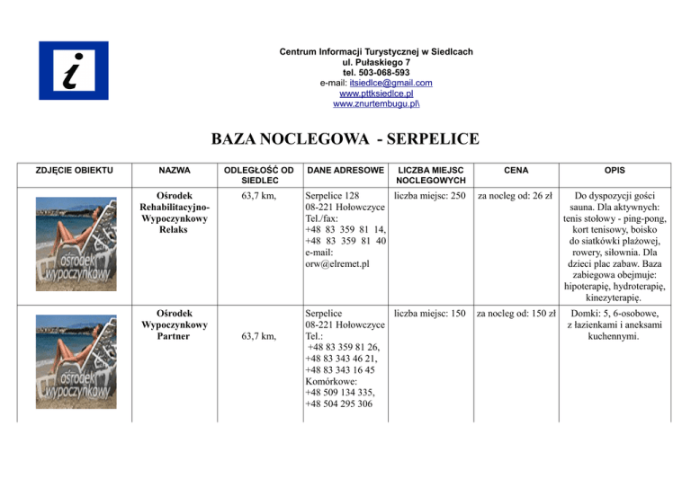 Centrum Informacji Turystycznej w Siedlcach ul. Pułaskiego 7 tel. 503-068-593 e-mail: [email protected] www.pttksiedlce.pl www.znurtembugu.pl\ BAZA NOCLEGOWA - SERPELICE ZDJĘCIE OBIEKTU NAZWA ODLEGŁOŚĆ OD SIEDLEC Ośrodek RehabilitacyjnoWypoczynkowy Relaks 63,7 km, Ośrodek Wypoczynkowy Partner 63,7 km, DANE ADRESOWE LICZBA MIEJSC NOCLEGOWYCH CENA OPIS Serpelice 128 liczba miejsc: 250 08-221 Hołowczyce Tel./fax: +48 83 359 81 14, +48 83 359 81 40 e-mail: [email protected] za nocleg od: 26 zł Do dyspozycji gości sauna. Dla aktywnych: tenis stołowy - ping-pong, kort tenisowy, boisko do siatkówki plażowej, rowery, siłownia. Dla dzieci plac zabaw. Baza zabiegowa obejmuje: hipoterapię, hydroterapię, kinezyterapię. Serpelice liczba miejsc: 150 08-221 Hołowczyce Tel.: +48 83 359 81 26, +48 83 343 46 21, +48 83 343 16 45 Komórkowe: +48 509 134 335, +48 504 295 306 za nocleg od: 150 zł Domki: 5, 6-osobowe, z łazienkami i aneksami kuchennymi. 63,7 km, mazowieckie liczba miejsc: 120 Serpelice 123 08-221 Hołowczyce Tel./fax: +48 83 359 81 25 Komórkowy: +48 606 429 932 za nocleg od: 30 zł Na terenie obiektu: wypożyczalnia rowerów, wypożyczalnia sprzętu wodnego. Na terenie obiektu także: ogród, możliwość grillowania, miejsce na ognisko. Obiekt czynny cały rok. Ośrodek SzkoleniowoWypoczynkowy Skarpa 63,7 km, Serpelice nad Bugiem, 08-221 Hołowczyce Tel.: +48 83 359 80 63, +48 83 341 50 85 liczba miejsc: 45 za nocleg od: 25 zł Obiekt czynny od maja do września Oferujemy możliwość pełnego wyżywienia: śniadania, obiady, kolacje. Ośrodek Wypoczynkowy „Małgosia” 60,4 km, Serpelice 127 08-221 Hołowczyce Tel.: +48 83 359 81 48 liczba miejsc: 20 za nocleg od: 20 zł Na terenie ośrodka znajdują się także: Ośrodek TurystycznoWypoczynkowy Urocza Ośrodek SzkoleniowoWypoczynkowy „As” 61 km, Serpelice 129 08-220 Sarnaki Tel.: +48 83 343 87 59 - boisko do gier zespołowych - plac zabaw dla dzieci wraz z niezbędnymi urządzeniami - domki campingowe - wypożyczalnia kajaków, grili, rowerów, sprzętu wędkarskiego, narciarskiego, sanek - parking samochodowy - pole namiotowe liczba miejsc: 80 Obecnie posiada 80 miejsc noclegowych w pawilonach mieszkalnych i domkach kempingowych z własnym węzłem sanitarnym, z pokojami 2, 3 i 4 osobowymi. Posiada dużą stołówkę na 100 osób, służącą też jako sala wykładowa i telewizyjna. Mini bar wraz z zewnętrznym pomieszczeniem kominkowym. „Zacisze” Kazimierz Horbowicz 60 km Serpelice 83 a 08-221 Hołowczyce tel. kom. 695 948 208 tel.dom 083 359 81 71 Wieczorem proszę dzwonić pod numer: 083 359 89 75 www.agrowczasy.co m.pl/serpelice/ Liczba miejsc: 27 Dom Duszpasterstwa Młodzieży „Porcjunkula” 60 km Serpelice 89 08-221 Hołowczyce Tel./fax: +48 83 359 80 70 Komórkowy: +48 693 611 468 e-mail: ddmporcjunkula@p oczta.fm Liczba miejsc: 74 Baza została stworzona na podstawie: http://serpelice.net/zakwaterowanie/ ceny - 20 zł/os bez wyżywienia. dzieci do lat 10 - 10 zł