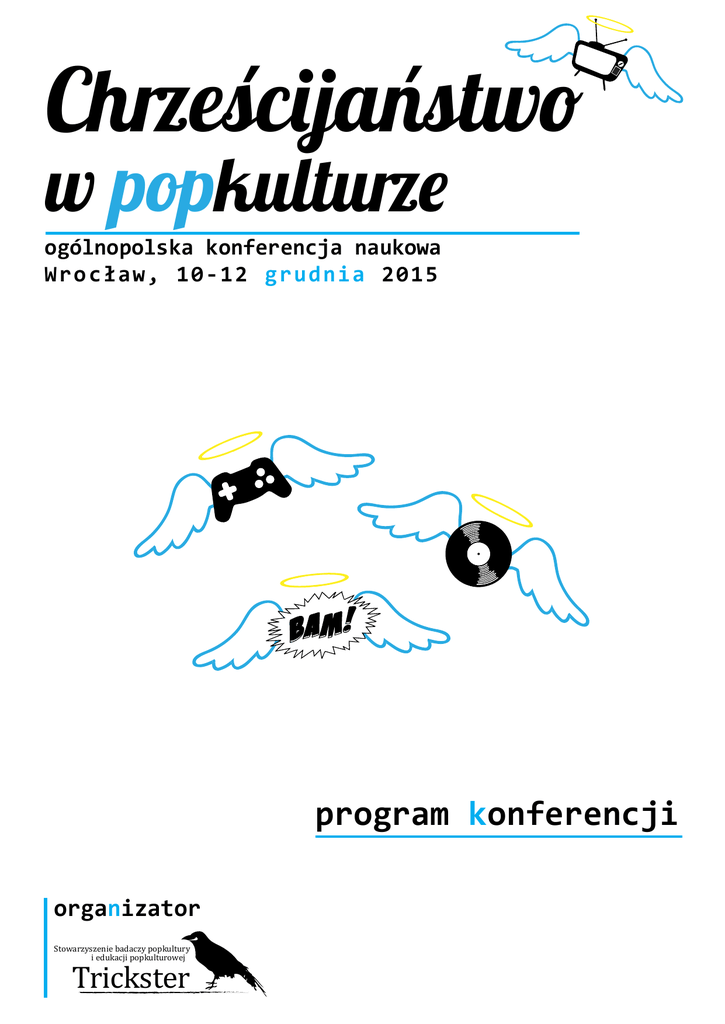 Chrześcijaństwo w popkulturze ogólnopolska konferencja naukowa Wro c ł a w , 10 -1 2 g ru dn i a 2 0 1 5 program konferencji organizator Stowarzyszenie badaczy popkultury i edukacji popkulturowej Trickster CZWARTEK, 10.12.2015 17.30–19.30 Jacek Horęzga (UWr), „Jawnogrzesznica” i inne herezje albo science fiction jako „system wczesnego ostrzegania”. Polska fantastyka religijna w obliczu przełomu roku 1989 mgr Joanna Płoszaj (UWr), Uniżeni słudzy Boży i miecze aniołów. Obraz inkwizycji i inkwizytorów w twórczości Jacka Piekary mgr Natalia Kościńska (UWr), „Ksiyndza z kazalnicy zrucić” – chrześcijaństwo oczami twórców folkowych mgr Natalia Dmitruk (UWr), Jezus inspirujący. Nawiązania do postaci Chrystusa w komiksie i animacji japońskiej mgr Michał Wolski (UWr), Wampir pod krzyżem. Krwiopijcy a symbolika chrześcijańska (w wybranych tekstach kultury) PIĄTEK, 11.12.2015 9.00–10.30 mgr Adam Flamma (UWr), Jezusa rozklockowali, a aniołowie mieli karabiny – kilka słów o Biblii w wersji Lego mgr Kamila Kowalczyk (UWr), „Trzymaj się swojej aureoli, chłopcze!” – o mechanizmach renarracyjnych w komiksie Battle Pope Michał Jadczyk (UWr), Nie taki diabeł straszny jak go... rysują. Chrześcijańskie motywy w komiksowych i filmowych narracjach o Daredevilu 10.30–12.00 mgr Artur Jochlik (UŚ), Chrześcijaństwo w anime mgr Katarzyna Żarnowska (UJ), Szaleństwo ponad dogmatami, czyli najdziwniejsze interpretacje chrześcijaństwa w japońskiej popkulturze mgr Katarzyna Skulimowska, Wizerunek zakonnicy w kinie japońskim 12.00–14.00 dr hab. Witold Glinkowski (UŁ), Popkultura jako „zwinięcie” transcendencji dr Paweł Plichta (UJ), Kiedy por staje się królową… czyli popkulturowa reinterpretacje Księgi Estery dr Jakub Gomułka, mgr Zofia Sajdek (UPJPII), Groteska coraz bardziej serio. Filozofia Boga i religii w beletrystyce Stanisława Lema mgr Katarzyna Winiarska-Ścisłowicz (UJ), Od rytuału do plastikowej tarantuli. Tarantyzm i jego kulturowa recepcja w czasach współczesnych 14.00–15.00 PRZERWA OBIADOWA 15.00–16.30 mgr Kaja Łuczyńska (UJ), Celuloidowe kazania – fenomen amerykańskich Christian films mgr Wojciech Bernatowicz (UW), „Kiss me Jesus”. Obraz chrześcijaństwa w musicalach lat 60. i 70. mgr Diana Dąbrowska (UŁ), Profetyczna popkultura, uciekający Papież, czyli Habemus Papam Nanniego Morettiego 16.30–18.00 mgr Adrianna Fiłonowicz (UAM), Zdrajca, bohater tragiczny czy wampir? Obecność Judasza Iskarioty w kulturze popularnej na przykładach filmowych Karol Pluta (UJ), „Czy Jezus zbawił również Indian?” O wpływie synkretyzmu kulturowego na postawy wobec religii bohaterów w twórczości Shermana Alexiego mgr Katarzyna Koćma (UJ), Hippie science fiction w wersji chrześcijańskiej. Przypadek W dół, do ziemi Roberta Silverberga i Obcego w obcym kraju Roberta Heinleina mgr Matylda Zatorska (UR), Różne oblicza świętości. Literackie portrety Jadwigi Śląskiej i błogosławionej Kingi w powieści historycznej po 1989 roku 18.30 Pokaz filmowy w American Corner (Biblioteka Dolnośląska, Rynek 58) SOBOTA, 12.12.2015 9.00–10.30 Paweł Micnas (UAM), Popewangelizacyjna misja Szymona Hołowni Lidia Synowiec, Społeczny wizerunek Jana Pawła II w kontekście współczesnych przemian religijności w Polsce mgr Marta Kierska (UŚ), Dżinsy warte grzechu. O wykorzystywaniu motywów religijnych w shockvertisingu 10.30–12.00 dr Radosław Łazarz (EWST), Z kamerą przez Ameryki. Filmowe obrazy amerykańskiego chrześcijaństwa ewangelicznego mgr Radosław Pisula (UO), Amerykański Jezus. O motywach biblijnych w RoboCopie Paula Verhoevena Aleksandra Kozłowska (UJ), Fenomen Biblii dla dzieci 12.00–13.40 mgr Mateusz Żebrowski (UŁ), Wiara jak sen, czyli chrześcijańskie uniwersum w Klejnocie snów mgr Julian Jeliński (UWr), Żartując z Syna Bożego. Wariacje postaci Jezusa w serialach Family Guy oraz Black Jesus mgr Dawid Junke (UWr), Niebiańska interwencja na szklanym ekranie. Bóg, proroctwa i anioły w serialach Joan of Arcadia, Eli Stone i Saving Grace mgr Katarzyna Cupała (UWr), Dewot idealny Ned Flanders. Kreskówkowa krytyka protestantyzmu w serialu The Simpsons 14.00–15.30 Rozmowa z ks. Andrzejem Dragułą (autorem książki Copyright na Jezusa) na temat związków popkultury z chrześcijaństwem (Empik – Renoma, Świdnicka 40) 16.00–17.30 mgr Katarzyna Figat (UŁ), „Śpiewajcie Bogu pięknie”...? Fenomen twórczości Piotra Rubika mgr Celina Jeray (UWr), Anioł na tylnym siedzeniu: wizerunek kobiety w tekstach piosenek glam i sleaze metalowych w kontekście biblijnym, teologicznym i literackim mgr Aleksandra Grąbkowska (UW), „Chrześcijańska trylogia muzyczna” Boba Dylana – dowód szczerej konwersji czy wyrachowany chwyt marketingowy? informacje dodatkowe – miejsce konferencji CaféTHEA, Przejście Żelaźnicze 4, Wrocław Biblioteka Dolnośląska CaféTHEA Empik (Renoma) – kontakt Julian Jeliński ([email protected]) – przydatne adresy Stowarzyszenie Badaczy Popkultury „Trickster” Chrześcijaństwo w popkulturze – wydarzenie Strona Stowarzyszenia „Trickster”