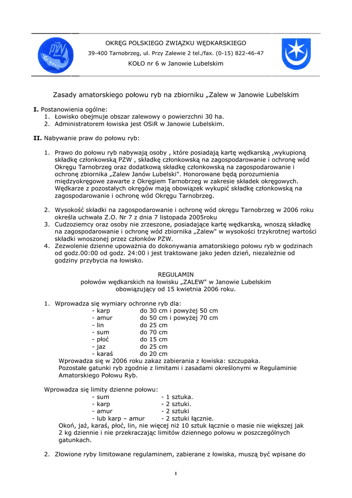 OKRĘG POLSKIEGO ZWIĄZKU WĘDKARSKIEGO 39-400 Tarnobrzeg, ul. Przy Zalewie 2 tel./fax. (0-15) 822-46-47 KOŁO nr 6 w Janowie Lubelskim Zasady amatorskiego połowu ryb na zbiorniku „Zalew w Janowie Lubelskim I. Postanowienia ogólne: 1. Łowisko obejmuje obszar zalewowy o powierzchni 30 ha. 2. Administratorem łowiska jest OSiR w Janowie Lubelskim. II. Nabywanie praw do połowu ryb: 1. Prawo do połowu ryb nabywają osoby , które posiadają kartę wędkarską ,wykupioną składkę członkowską PZW , składkę członkowską na zagospodarowanie i ochronę wód Okręgu Tarnobrzeg oraz dodatkową składkę członkowską na zagospodarowanie i ochronę zbiornika „Zalew Janów Lubelski". Honorowane będą porozumienia międzyokręgowe zawarte z Okręgiem Tarnobrzeg w zakresie składek okręgowych. Wędkarze z pozostałych okręgów mają obowiązek wykupić składkę członkowską na zagospodarowanie i ochronę wód Okręgu Tarnobrzeg. 2. Wysokość składki na zagospodarowanie i ochronę wód okręgu Tarnobrzeg w 2006 roku określa uchwała Z.O. Nr 7 z dnia 7 listopada 2005roku 3. Cudzoziemcy oraz osoby nie zrzeszone, posiadające kartę wędkarską, wnoszą składkę na zagospodarowanie i ochronę wód zbiornika „Zalew" w wysokości trzykrotnej wartości składki wnoszonej przez członków PZW. 4. Zezwolenie dzienne upowaŜnia do dokonywania amatorskiego połowu ryb w godzinach od godz.00:00 od godz. 24:00 i jest traktowane jako jeden dzień, niezaleŜnie od godziny przybycia na łowisko. REGULAMIN połowów wędkarskich na łowisku „ZALEW" w Janowie Lubelskim obowiązujący od 15 kwietnia 2006 roku. 1. Wprowadza się wymiary ochronne ryb dla: - karp do 30 cm i powyŜej 50 cm - amur do 50 cm i powyŜej 70 cm - lin do 25 cm - sum do 70 cm - płoć do 15 cm - jaz do 25 cm - karaś do 20 cm Wprowadza się w 2006 roku zakaz zabierania z łowiska: szczupaka. Pozostałe gatunki ryb zgodnie z limitami i zasadami określonymi w Regulaminie Amatorskiego Połowu Ryb. Wprowadza się limity dzienne połowu: - sum - 1 sztuka. - karp - 2 sztuki. - amur - 2 sztuki - lub karp – amur - 2 sztuki łącznie. Okoń, jaź, karaś, płoć, lin, nie więcej niŜ 10 sztuk łącznie o masie nie większej jak 2 kg dziennie i nie przekraczając limitów dziennego połowu w poszczególnych gatunkach. 2. Złowione ryby limitowane regulaminem, zabierane z łowiska, muszą być wpisane do 1 rejestru połowów bezpośrednio po ich złowieniu i przed dalszą kontynuacją łowienia. Pozostałe gatunki po zakończeniu łowienia. 3. Ryby złowione które są przeznaczone do zabrania przechowujemy w siatce z miękkich włókien rozpiętych na sztywnych obręczach. 4. Druk dziennego rejestru połowów jest wydawany w momencie wnoszenia składki członkowskiej na zagospodarowanie i ochronę wód Okręgu. 5. Druk rejestru połowów musi być zwrócony w miejscu wykupienia , najpóźniej przy wnoszeniu opłat na rok następny. 6. Łowisko jest udostępnione przez cały rok, z wyjątkiem okresu określonego w pkt. 17. Wejście na łowisko wędkarz potwierdza wpisem w rejestr połowów okręgu tarnobrzeskiego. 7. Zezwala się na amatorski połów ryb w porze nocnej . Podczas połowów nocnych o godz. 00.00 wędkarz zobowiązany jest do dokonania wpisu w rejestrze połowów , o ilość złowionych ryb w dniu poprzedzającym i rozpoczęcia połowów wpisem w dniu bieŜącym. Brak wpisu w rejestrze będzie traktowane Jako nieprzestrzeganie niniejszego regulaminu i będzie karane cofnięciem pozwolenia na wędkowanie na zbiorniku „Zalew". Za porę nocną uwaŜa się czas: godzinę po zachodzie słońca i godzinę przed wschodem słońca (zgodnie z zapisem kalendarzowym). 8. Łowienie ryb dozwolone tylko z brzegu— grobli okalającej zbiornik: 25m od wpływu wody i 25m od wypływu śluzy głównej i pomocniczej oraz w miejscach do tego wyznaczonych. 9. Zabrania się połowu ryb ze środków pływających , wywoŜenia przynęt i zanęt środkami pływającymi lub ich modelami oraz oznakowywania łowiska przy pomocy boi. 10. Zabrania się naruszania powierzchni grobli (np.: kopania schodków i plantowania stanowisk wędkarskich pod foteliki i krzesełka i podpórki wędkarskie itp. ) rozbijania namiotów posiadających zabezpieczenie przeciwwilgociowe w postaci tzw. podłogi i rozpalania ognisk. 11. Parkowanie pojazdów mechanicznych jest dopuszczalne wyłącznie w miejscach do tego wyznaczonych. 12. Zarząd Koła zastrzega sobie prawo ( w uzasadnionych przypadkach) do wprowadzenia zmian w regulaminie w trakcie sezonu połowów. 13. Obowiązuje bezwzględny zakaz patroszenie i obierania złowionych ryb na łowisku. 14. Wprowadza się zakaz wędkowania z wysp znajdujących się na zbiorniku i grobli dzielącej zbiornik główny z kąpieliskiem oraz z terenu linii brzegowej ośrodków rekreacyjnych „DUO", „OSiR" z pomostów tychŜe ośrodków oraz z odcinka linii brzegowej pomiędzy tymi ośrodkami. 15. Nie przestrzeganie postanowień niniejszego regulaminu jest wykroczeniem w myśl art. 27, ust. 1 pkt 1 ustawy o rybactwie śródlądowym, co skutkuje cofnięciem pozwolenia i zakazem wędkowania na zbiorniku „Zalew" w danym sezonie. 16. Raz wniesiona, dodatkowa składka za wędkowanie w „Zalewie Janów Lubelski” nie podlega zwrotowi. 17. UŜytkownik łowiska „Zalew Janów Lub." zastrzega sobie prawo okresowego wyłączenia łowiska z połowów w związku z zarybianiem lub części łowiska ze względu na stworzenie tarlisk dla ryb lub w celu przeprowadzenia czynności pielęgnacyjnych lub sanitarnych. 2 18. W pozostałych nie uregulowanych Regulaminem sprawach, obowiązuje Regulamin Amatorskiego Połowu Ryb. 19. Uprawnienia do kontroli i odpowiedzialność wędkującego: a) Osoba dokonująca amatorskiego połowu ryb ma bezwzględny obowiązek poddać się kontroli prowadzonej przez: straŜników PSRyb, straŜników SSRyb, funkcjonariuszy Policji, StraŜy Miejskiej i StraŜy Leśnej. b) Na Ŝądanie kontrolujących węd