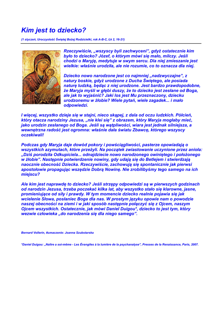 Kim jest to dziecko? (1 styczeń, Uroczystość Świętej Bożej Rodzicielki, rok A-B-C, Łk 2, 16-21) Rzeczywiście, „wszyscy byli zachwyceni”, gdyż ostatecznie kim było to dziecko? Józef, o którym mówi się mało, milczy. Jeśli chodzi o Maryję, medytuje w swym sercu. Dla niej zmieszanie jest wielkie: właśnie urodziła, ale nie rozumie, co to oznacza dla niej. Dziecko nowo narodzone jest co najmniej „nadzwyczajne”, z natury boskie, gdyż urodzone z Ducha Świętego, ale posiada naturę ludzką, będąc z niej urodzone. Jest bardzo prawdopodobne, że Maryja myśli w głębi duszy, że to dziecko jest zesłane od Boga, ale jak to wyjaśnić? Jaki los jest Mu przeznaczony, dziecku urodzonemu w żłobie? Wiele pytań, wiele zagadek... i mało odpowiedzi. I więcej, wszystko dzieje się w stajni, nieco skąpej, z dala od oczu ludzkich. Półcień, który otacza narodziny Jezusa, „nie klei się” z obrazem, który Maryja mogłaby mieć, jako urodzin zesłanego od Boga. Jeśli są wątpliwości, wiara jest jednak silniejsza, a wewnętrzna radość jest ogromna: właśnie dała światu Zbawcę, którego wszyscy oczekiwali! Podczas gdy Maryja daje dowód pokory i powściągliwości, pasterze opowiadają o wszystkich azymutach, które przeżyli. Na początek zwiastowanie uczynione przez anioła: „Dziś porodziła Odkupiciela... odnajdziecie nowo narodzonego owiniętego i położonego w żłobie”. Następnie potwierdzenie nowiny, gdy udają się do Betlejem i stwierdzają naocznie obecność Dziecka. Rzeczywiście, zachowują się spontanicznie jak pierwsi apostołowie propagując wszędzie Dobrą Nowinę. Nie zrobilibyśmy tego samego na ich miejscu? Ale kim jest naprawdę to dziecko? Jeśli strzępy odpowiedzi są w pierwszych godzinach od narodzin Jezusa, trzeba poczekać kilka lat, aby wszystko stało się klarowne, jasne, promieniujące od siły i prawdy. W tym momencie dziecko realnie pojawia się jak wcielenie Słowa, posłaniec Boga dla nas. W prostym języku opowie nam o powodzie naszej obecności na ziemi i w jaki sposób następnie połączyć się z Ojcem, naszym Ojcem wszystkich. Ostatecznie, jak mówi Daniel Duigou*, dziecko to jest tym, który wezwie człowieka „do narodzenia się dla niego samego”. Bernard Vollerin, tłumaczenie: Joanna Szubstarska *Daniel Duigou: „Naître a soi-même - Les Évangiles à la lumière de la psychanalyse”, Presses de la Renaissance, Paris, 2007.