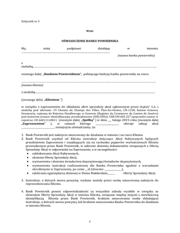 Załącznik nr 3 Wzór OŚWIADCZENIE BANKU POWIERNIKA My, niżej podpisani działając …................................................................................................................................. w imieniu: (nazwa banku powiernika) z siedzibą…………………………………………………………………………………………………………………………………... zwanego dalej „Bankiem Powiernikiem”, pełniącego funkcję banku powiernika na rzecz: ……………………………………………………………………………………………………………………………………………… (nazwa klienta) z siedzibą.................................................................................................................................................................................... (zwanego dalej „Klientem ") w związku z zaproszeniem do składania ofert sprzedaży akcji ogłoszonym przez Orphée” S.A. z siedzibą pod adresem: 19 Chemin du Champs des Filles, Plan-les-Ouates, CH-1228, kanton Genewa, Szwajcaria, wpisaną do Rejestru Handlowego w Genewie (Registre du Commerce du Canton de Genève) pod numerem (numer identyfikacyjny przedsiębiorstw (IDE/UID)): CHE109.605.227 (poprzedni numer w rejestrze: CH 66011110021 (zwanym dalej „Spółką” ) w dniu ___ lutego 2015 roku (zwanym dalej „Zaproszeniem” ), w ramach którego ___________________ ___________________________, niniejszym oświadczamy, że: oferuje zakup akcji 1. Bank Powiernik jest należycie umocowany do działania w imieniu i na rzecz Klienta. 2. Bank Powiernik uzyskał od Klienta instrukcje dotyczące Akcji Nabywanych będących przedmiotem Zaproszenia i znajdujących się na rachunku papierów wartościowych Klienta prowadzonym przez Bank Powiernik, w zakresie złożenia dokumentów związanych z Ofertą Sprzedaży Akcji w odpowiedzi na Zaproszenie, a w szczególności: zablokowania Akcji Nabywanych, złożenia Oferty Sprzedaży Akcji, wystawienia i złożenia świadectwa depozytowego/świadectw depozytowych, wystawienia instrukcji rozliczeniowej dla Banku Powiernika zgodnie z warunkami określonymi w Zaproszeniu, po cenie __zł (słownie: ______________), odebrania egzemplarza złożonej w Domu Maklerskim______ . Oferty Sprzedaży Akcji. 3. Instrukcje, o których mowa powyżej, wydane zostały przez osobę umocowaną należycie do reprezentowania Klienta. 4. Bank Powiernik ponosi odpowiedzialność za wszystkie szkody wynikłe w związku ze złożeniem Oferty Sprzedaży Akcji w imieniu Klienta, związane między innymi z niewłaściwą identyfikacją Klienta przez Bank Powiernik, brakiem umocowania osoby składającej instrukcje, o których mowa powyżej, lub brakiem umocowania Banku Powiernika do działania w imieniu Klienta. 1 5. Bank Powiernik zobowiązuje się wystawić odpowiednią instrukcję rozliczeniową, w wyniku której Akcje Nabywane _______________ będące przedmiotem złożonych w imieniu Klientów Ofert Sprzedaży Akcji, zostaną zapisane w KDPW na koncie Domu Maklerskiego _____________________, który prowadzi rachunek papierów wartościowych dla Spółki, w dniu rozliczenia zawartych transakcji, na podstawie zestawienia przyjętych Ofert Sprzedaży Akcji przesłanego przez Dom Maklerski _________________________, wskazującego warunki rozliczenia. Jednocześnie oświadczamy, że Bank Powiernik upoważnia do działania w imieniu Banku Powiernika w zakresie wskazanym w pkt. 2 niniejszego oświadczenia, następującego pracownika: ……………………………………………………………………………………………………………. (imię i nazwisko, adres zamieszkania, nr dowodu osobistego, PESEL) Za Bank Powiernik: ……………………………………………………. Podpis, imię i nazwisko, stanowisko stanowisko ……………………………………………………… Podpis, imię i nazwisko, 2