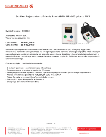 Schiller Rejestrator ciśnienia krwi ABPM BR-102 plus z PWA Symbol towaru: SC6662 Jednostka miary: szt. Towar w magazynie: nie Cena netto: Cena brutto: 20 000,00 zł 21 600,00 zł Ambulatoryjny system monitorowania ciśnienia krwi i sztywności naczyń, oferujący wyjątkową dokładność, komfort i funkcjonalność. Ta wersja rejestratora ciśnienia analizuje falę tętna wraz z każdym automatycznym pomiarem ciśnienia, co pozwala na uzyskanie dodatkowych wartości diagnostycznych w postaci ciśnienia centralnego skurczowego i rozkurczowego, prędkości fali tetna, wskaźnika augmentacji i oporu obwodowego. Charakterystyka i możliwości urządzenia: - 2 metody pomiaru - oscylometryczna i Korotkova Orogramowanie pracujące w systemie Windows Pełne programowanie aparatu zarówno z poziomu oprogramowania jak i samego rejestratora Analiza wyników na podstawie wytycznych ESH, AHA i JNC7 Różne formaty prezentacji (graficzne, tabelaryczne) Statystyki i wydruki raportów końcowych Integracja z badaniami holtera EKG Strona 1 z 1