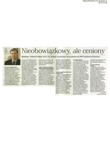 RZECZPOSPOLITA (Dodatek 3) 2010-10-29 Nieobowiązkowy, ale ceniony Rozmowa I Waldemar Majek, ACCA, CIA, dyrektor zarządzający firmą szkoleniową BPP Professional Education którzy chcą podnieść swoje kwalifikacje i umiejętności w zakresie przeprowadzania audytu wewnętrznego w śro dowisku międzynarodowym lub funduszach unijnych. Cotojest certyfikat CGAP? Może się także przydać WALDEMAR MAJEK: CGAP wszystkim, którzy planują w (Certified Govemment Audi przyszłości zdawanie egzami ting Professional) to nów CIA (kwalifikacja uznawany na całym świecie audytorska popularna w fir certyfikat specjalistyczny mach komercyjnych). przeznaczony dla audytorów Zdobycie dyplomu CGAP wewnętrznych zatrudnio zwalnia bowiem z jednego nych w sektorze publicznym. egzaminu CIA. Zaletą CGAP Na mocy ustawy o finansach jest jego międzynarodowy publicznych dyplom CGAP charakter oraz wszechstron uprawnia do podjęcia pracy ność. Z takim certyfikatem w tym zawodzie. CGAP skie można podjąć pracę w urzę rowany jest również do dach krajowych, dokument audytorów wewnętrznych, daje uprawnienia do prze prowadzania audytów unij nych nie tylko w Polsce. To stanowi o jego atrakcyjności, mimo że certyfikat nie jest obowiązkowy. Z takim certyfikatem bez trudu można znaleźć pracę za granicą? To dyplom międzynarodo wy, rozpoznawany na całym świecie. Jego posiadacze nie muszą ograniczać aspiracji za wodowych jedynie do krajowych urzędów. Poten cjalny pracodawca może mieć pewność, że członek HA ma odpowiedni poziom wiedzy teoretycznej i praktycznej. Praca na stanowisku audytora wewnętrznego zapewnia stały rozwój i wymaga nieustanne go podnoszenia kwalifikacji. Jak zdobyć dyplom? Ci, którzy spędzili kilka lat w W BPP Professional Educa audycie wewnętrznym, często tion szkolenie trwa sześć dni obejmują potem kierownicze i jest podzielone na trzy czę stanowiska. A pracodawcy co ści. Trenerzy omawiają raz częściej w ogłoszeniach o zagadnienia teoretyczne i pracę wymagają od audyto przedstawiają przykłady ich rów wewnętrznych dyplomu zastosowania w praktyce. Te CGAP. matyka szkoleń jest ściśle powiązana z tematyką egza Czy polscy audytorzy chętnie zdo minów certyfikujących. bywają. CGAP? Najpierw omawiamy m.in. Pojęcie audytu pojawiło się standardy audytów, kodeksy w Polsce i polskim sektorze postępowania, zasady ryzyka publicznym stosunkowo nie i kontroli audytu oraz kodeks dawno. Ten nowy zawód etyki. Potem skupiamy się na wymagający ciągłego samo praktyce audytu, czyli zarzą doskonalenia stal się dzaniu jego funkcją, atrakcyjny dla wielu młodych rodzajach usług audytor i ambitnych osób. Według in skich albo procesach formacji uzyskanych z HA świadczenia usług audytor Polska należy do europejskiej skich. Kolejny etap dotyczy czołówki krajów, jeżeli chodzi doskonalenia umiejętności i o popularność certyfikatu technik audytu w sektorze CGAP. To wynik ustawy o fi publicznym, a na koniec nansach publicznych i omawiamy środowisko audy praktycznych korzyści dla tu. Po szkoleniach odbywa szkolących się urzędników. się sesja poświęcona dosko naleniu techniki egzaminacyjnej, podczas któ rej razem ze studentami rozwiązujemy zadania testo we. Czy dużo osób zdaje egzamin? Certyfikat CGAP można uzyskać, zdając jeden egzamin w języku polskim. Przygoto wywany jest on przez praktyków audytu wewnętrz nego. Zakres wiedzy wymaganej na egzaminie jest szerszy niż w przypadku po równywalnego egzaminu uniwersyteckiego, a główny nacisk położony jest na umie jętność praktycznego zastosowania wiedzy. Kilka miesięcy nauki wystarczy, by opanować cały materiał i bez większych kłopotów zdać eg zamin Kwalifikacja CGAP jest obecnie najszybszym sposo bem na zdobycie uprawnień audytora wewnętrznego w sektorze publicznym w Polsce. —rozmawiała Agnieszka Usiarezyk
