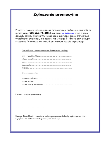 Zgłoszenie promocyjne Prosimy o wypełnienie niniejszego formularza, a następnie przesłanie na numer faksu (22) 565-76-00 lub na adres [email protected] wraz z kopią dowodu zakupu (faktura VAT) oraz kopią pierwszej strony prawidłowo wypełnionej gwarancji, nie później niż w ciągu 14 dni od daty zakupu. Przesłanie formularza jest warunkiem wzięcia udziału w promocji. Dane Klienta uprawnionego do korzystania z usługi: imię i nazwisko Klienta: …………………………...................... telefon kontaktowy: ………………………………................... adres: ………………………………………………..................... kod pocztowy: …………………………………….................... miasto: ………………………………………………................... Dane urządzenia: nazwa urządzenia: ……………………………......................... numer modelu: …………………………………........................ numer seryjny urządzenia: ……………………........................ Pieczęć i podpis sprzedawcy: …………………………………… Uwaga: Dane klienta zawarte w niniejszym zgłoszeniu będą wykorzystane tylko i wyłącznie na potrzeby obsługi niniejszej promocji. Warunki ogólne świadczenia usług serwisowych (“Umowa”) Opis usługi: obsługa serwisowa w drugim roku liczonym od daty zakupu urządzenia w Centrum Serwisowym HP, ul. Jagiellońska 78, 03-301Warszawa. 1. 2. 3. 4. 5. 6. 7. 8. 9. Usługi serwisowe: Firma HP zapewnia świadczenie usług serwisowych, zgodnie z określonym w Opisie Usługi poziomem, dla kwalifikującego się urządzenia, wyspecyfikowanego w Certyfikacie serii PQ3–2–05 (zwanego dalej „Produktem”). Usługa świadczona jest w Centrum Serwisowym HP, ul. Jagiellońska 78, 03-301 Warszawa. Zobowiązanie HP do świadczenia Usługi jest zastrzeżone warunkiem otrzymania wszystkich wymaganych informacji dotyczących Klienta i Produktu. HP może wymagać od Klienta dowodu zakupu Produktu. Dla nie kwalifikujących się produktów i usług nieobjętych tą Umową, HP oferuje swoje usługi według standardowych stawek HP za czas pracy, dojazd i materiały. W przypadku wykonywania usługi w miejscu instalacji usługa może być świadczona przez HP lub upoważnionego przedstawiciela. Miejsce świadczenia usługi: Usługa świadczona jest w Polsce wyłącznie w Centrum Serwisowym HP i jest ona dostępna w godz. 8:00-17:00, od poniedziałku do piątku, wyłączając dni ustawowo wolne od pracy. Urządzenie zostanie po wykonaniu naprawy odesłane z powrotem do Klienta. Aktywacja: Aktywacja usługi następuje po dokonaniu zgłoszenia promocyjnego na zasadach określonych w „Regulaminie promocji”. Uważa się, że Klient zaakceptował wszystkie warunki niniejszej Umowy z chwilą dokonania przez Klienta zgłoszenia serwisowego dotyczącego Usługi. Warunki wstępne: Warunkiem świadczenia Usług przez HP jest spełnienie przez Klienta wymagań i wykonanie zobowiązań zawartych w Certyfikacie i Umowie. W czasie świadczenia Usługi przez HP u Klienta lub przez telefon, wymagana jest obecność Klienta lub przedstawiciela Klienta. Produkt objęty Umową: Niniejszą Umową może być objęty tylko produkt wymieniony w Certyfikacie serii PQ3-02-05. Akcesoria HP oraz wewnętrzne akcesoria HP zakupione z Produktem lub później są objęte Usługą przez pozostały okres trwania Umowy. Akcesoria, dla których usługa serwisowa jest sprzedawana osobno, nie są objęte tą Umową. Dodatkowo, spełnione muszą być i zastosowanie mają następujące wymagania, będące warunkiem dostarczenia Usługi przez HP: (a) Produkt musi być uaktualniony do bieżącej, określonej wersji, jak również być użytkowany w podanym przez producenta zakresie parametrów eksploatacji. Produkt musi być także w dobrym stanie według rozsądnej opinii HP. (b) HP może dokonać bezpłatnej modyfikacji Produktu w celu ulepszenia jego działania, łatwości obsługi i niezawodności lub w celu spełnienia wymogów prawnych. (c) O ile nie wspomniano inaczej, HP nie obsługuje produktów i komponentów innych producentów niż HP. Części: Wymieniane części zamienne lub urządzenia będą nowe, bądź w pełni odnowione, równoważne nowym pod względem funkcjonalnym. Wymienione uszkodzone części lub urządzenia stają się własnością HP, chyba, że zostaną zakupione przez Klienta, strony ustalą inaczej lub HP postanowi inaczej. HP może obciążyć Klienta kosztami wymienionych części lub urządzeń, które nie zostały zwrócone zgodnie z wymogami. Własność HP: Klient przyjmuje do wiadomości, że nie posiada żadnych praw własności do materiałów dostarczonych przez HP, takich jak dokumentacje, rysunki, oprogramowanie, programy diagnostyczne i związane z nimi nośniki, oraz wynajęte modemy lub urządzenia zdalnego dostępu, które zostaną zdemontowane przez HP lub zostaną zwrócone w momencie wygaśnięcia tej Umowy. Obowiązki Klienta: (a) Klient zgłasza urządzenie do serwisu we własnym zakresie. (b) Odpowiednio przygotowuje urządzenie do transportu (zaleca się w tym celu zachowanie oryginalnego opakowania). (c) Klient zobowiązany jest do bezzwłocznego powiadomienia HP w przypadku jakichkolwiek zmian informacji związanych z Umową i Produktem, które zostały dostarczone jako element tej Umowy. (d) Klient dołoży wszelkich starań, w rozsądnym zakresie, aby współpracować z HP w celu zdalnego rozwiązywania problemów, w tym będzie uruchamiał programy samotestujące lub diagnostyczne, dostarczy wszystkich niezbędnych informacji i wykona podstawowe działania prowadzące do rozwiązania problemu na żądanie HP. (e) Klient jest odpowiedzialny za pokrycie wszelkich opłat telekomunikacyjnych związanych z dostarczeniem pomocy telefonicznej i usług zdalnych. (f) Klient jest odpowiedzialny za zgodność nieobsługiwanych produktów, akcesoriów i urządz